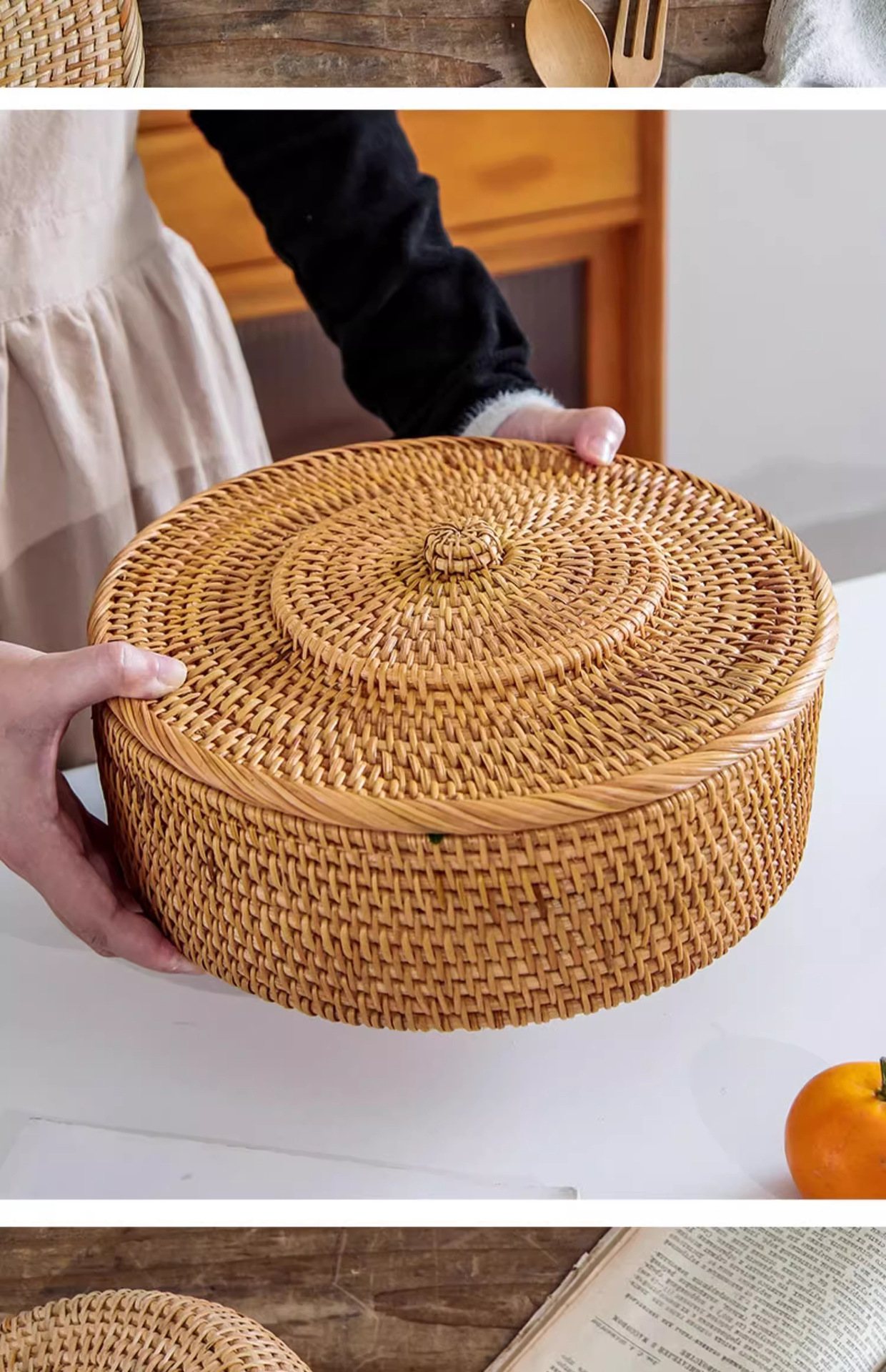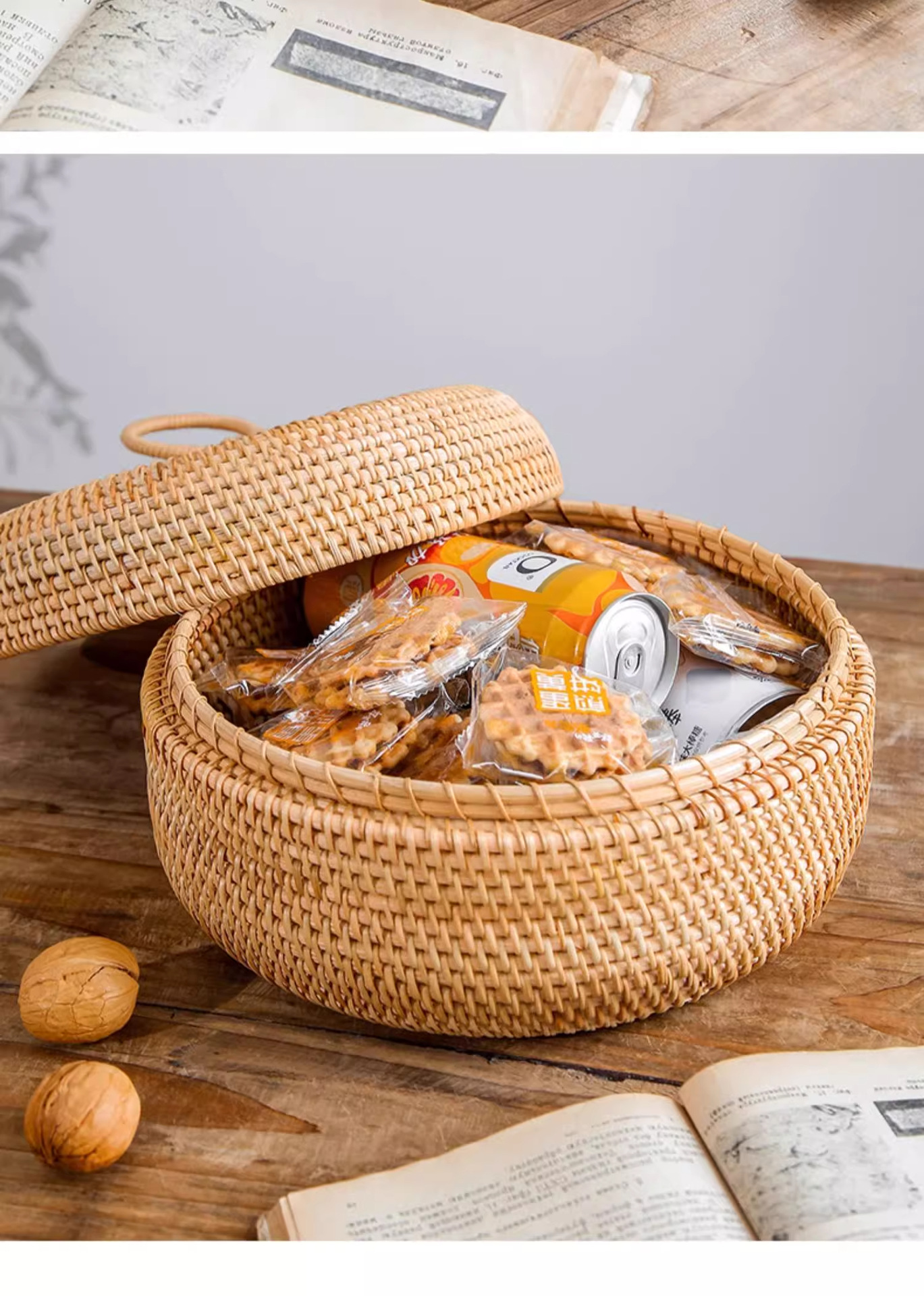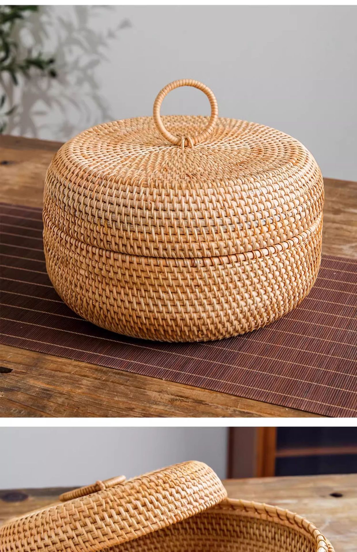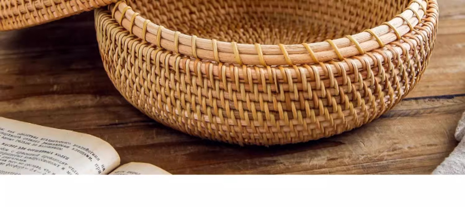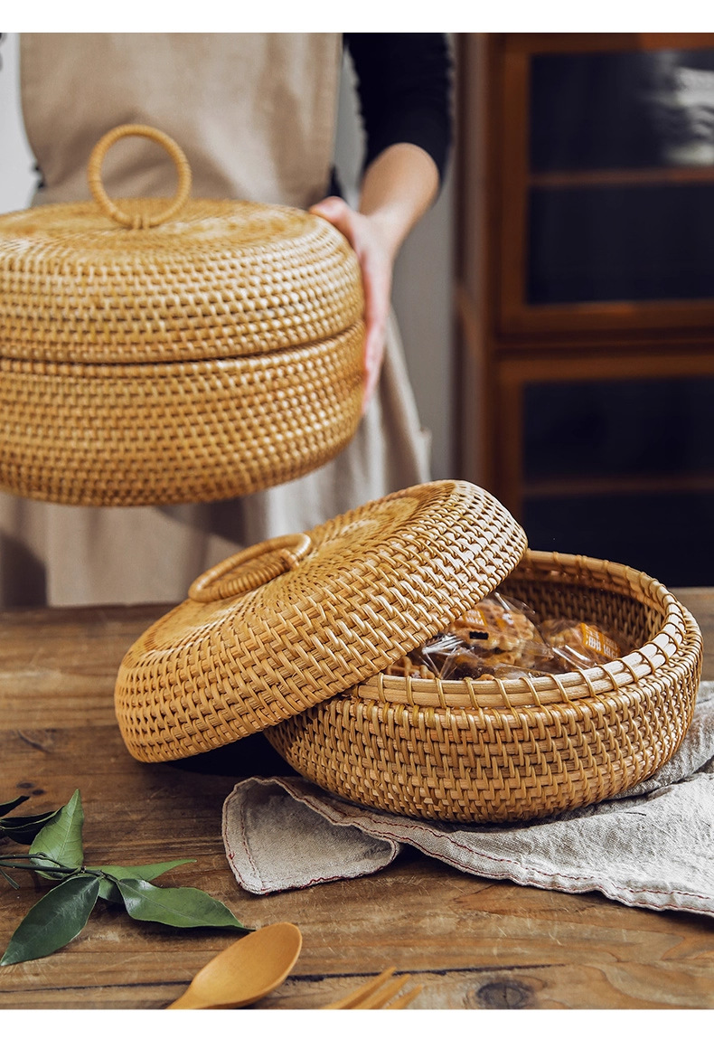 Cesta de almacenamiento de caña tejida de caña cubierta caja de almacenamiento de escritorio caja de pastel de té mesa de té bocadillos de frutas pan al vapor retrógrado sopa