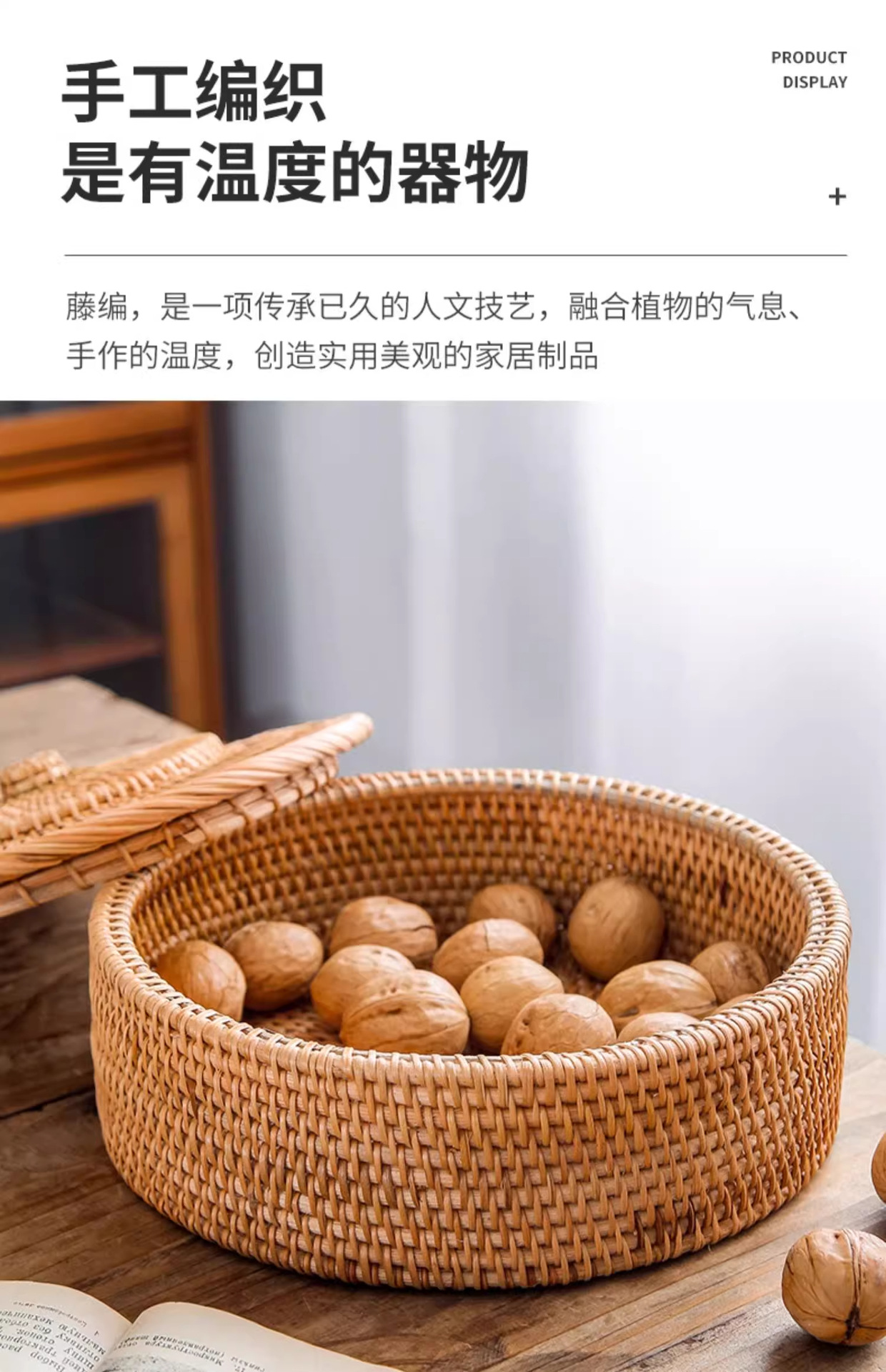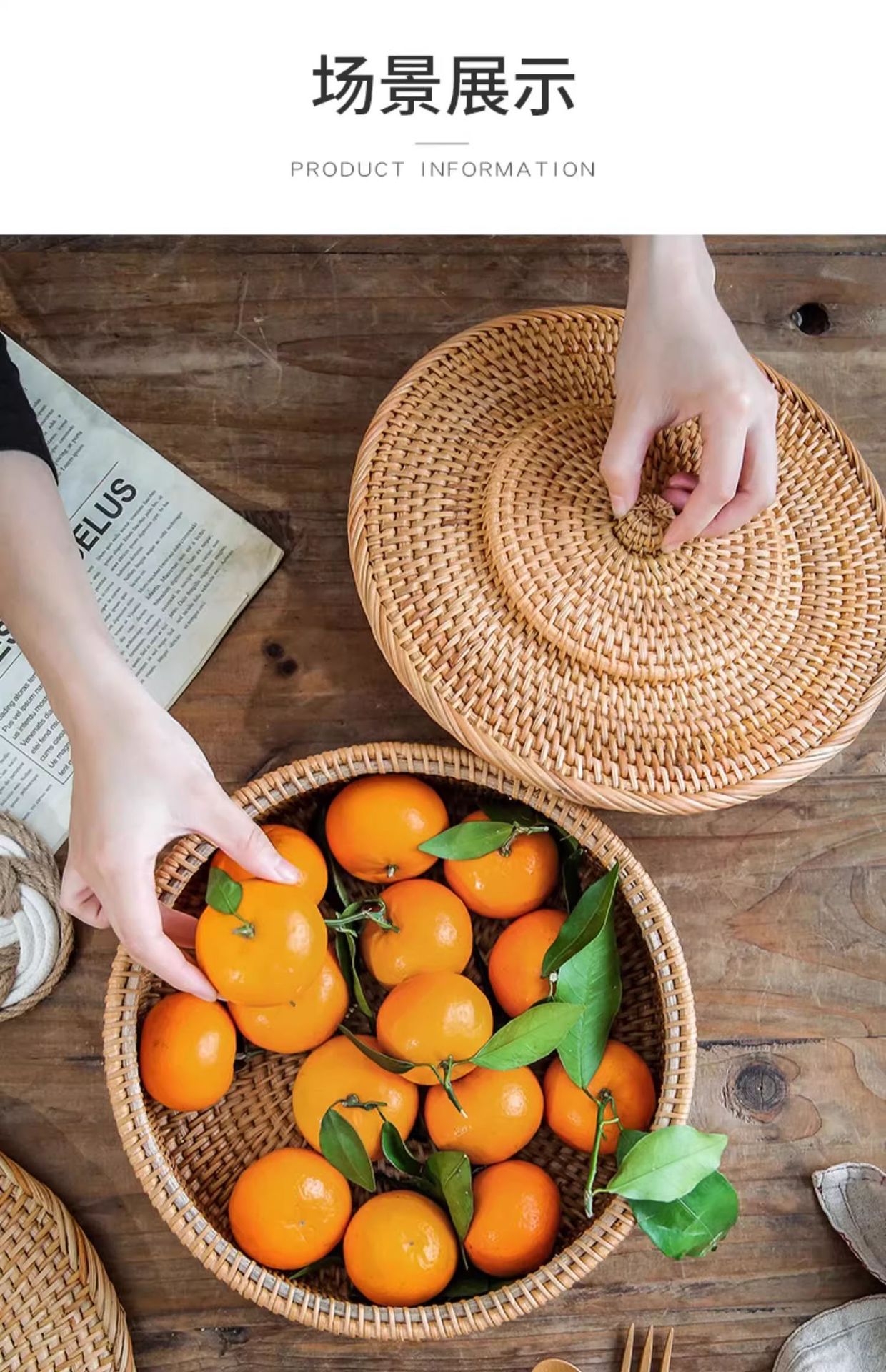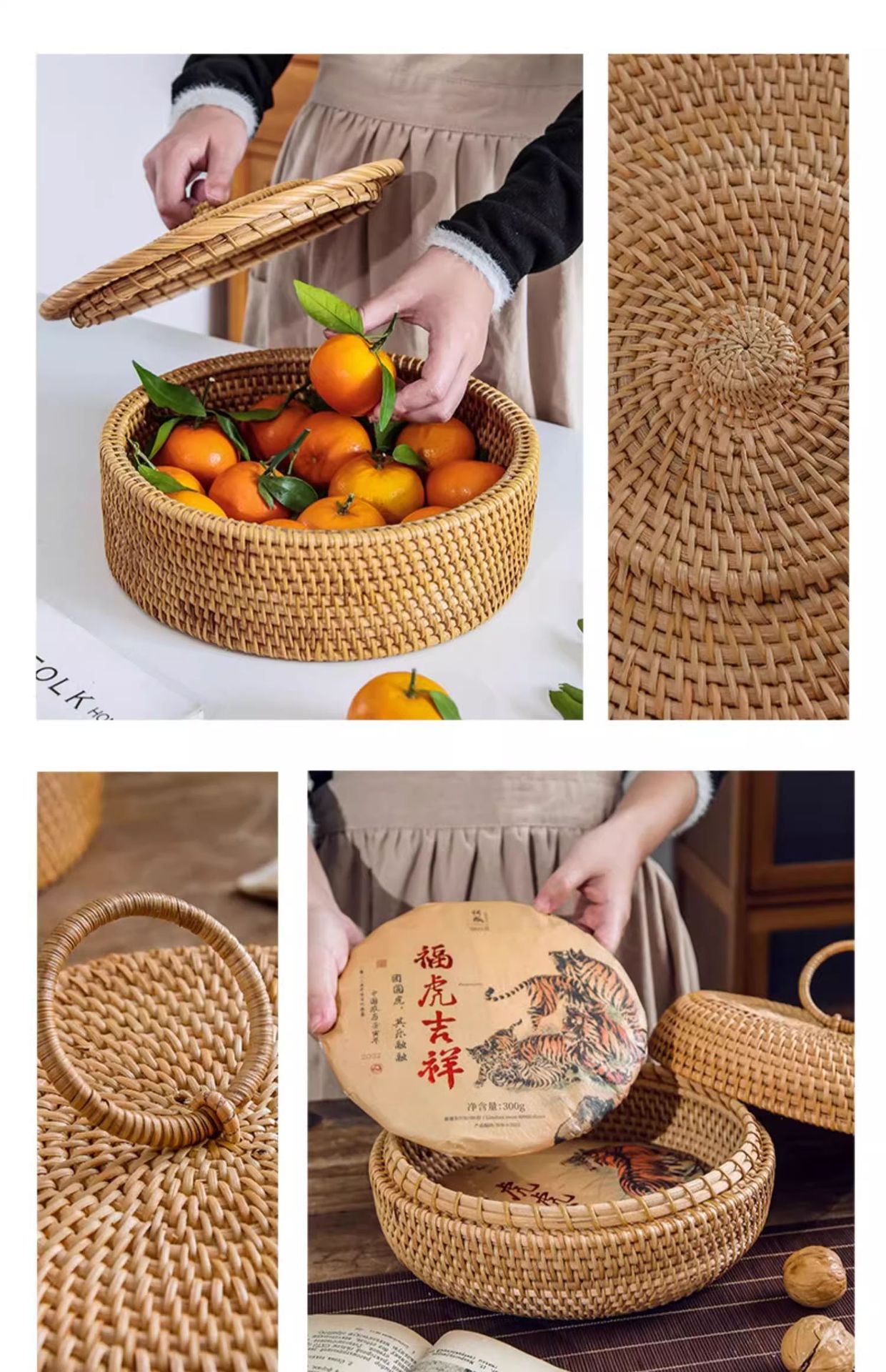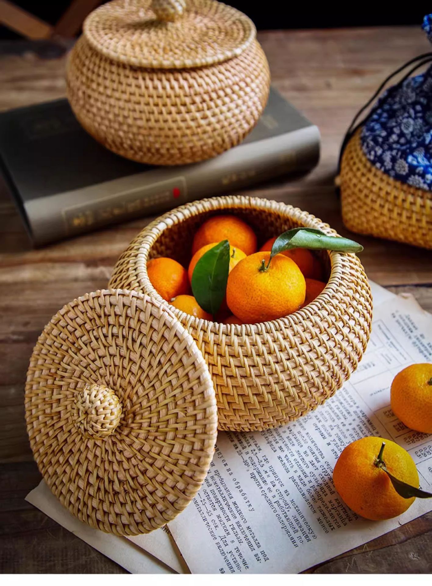 Cesta de almacenamiento de caña tejida de caña cubierta caja de almacenamiento de escritorio caja de pastel de té mesa de té bocadillos de frutas pan al vapor retrógrado sopa