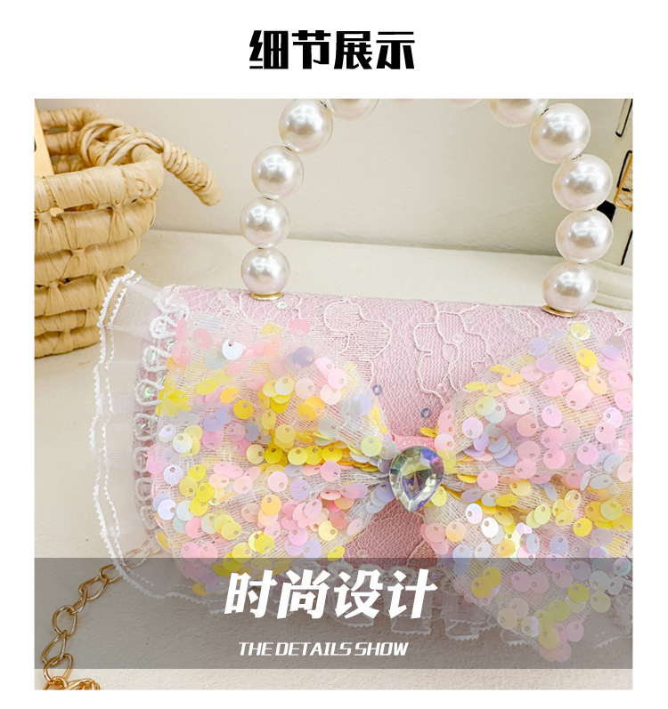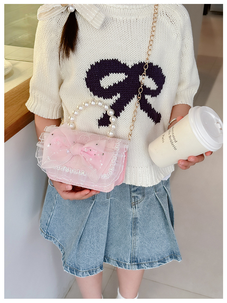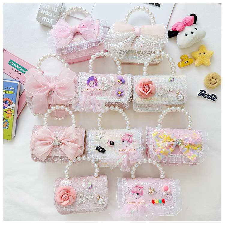Primavera y verano nuevos bolsos infantiles, bolsos de perlas de arco, bolsos de mano, princesa de estilo extranjero, bolsos de cambio de hombro