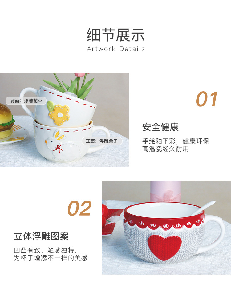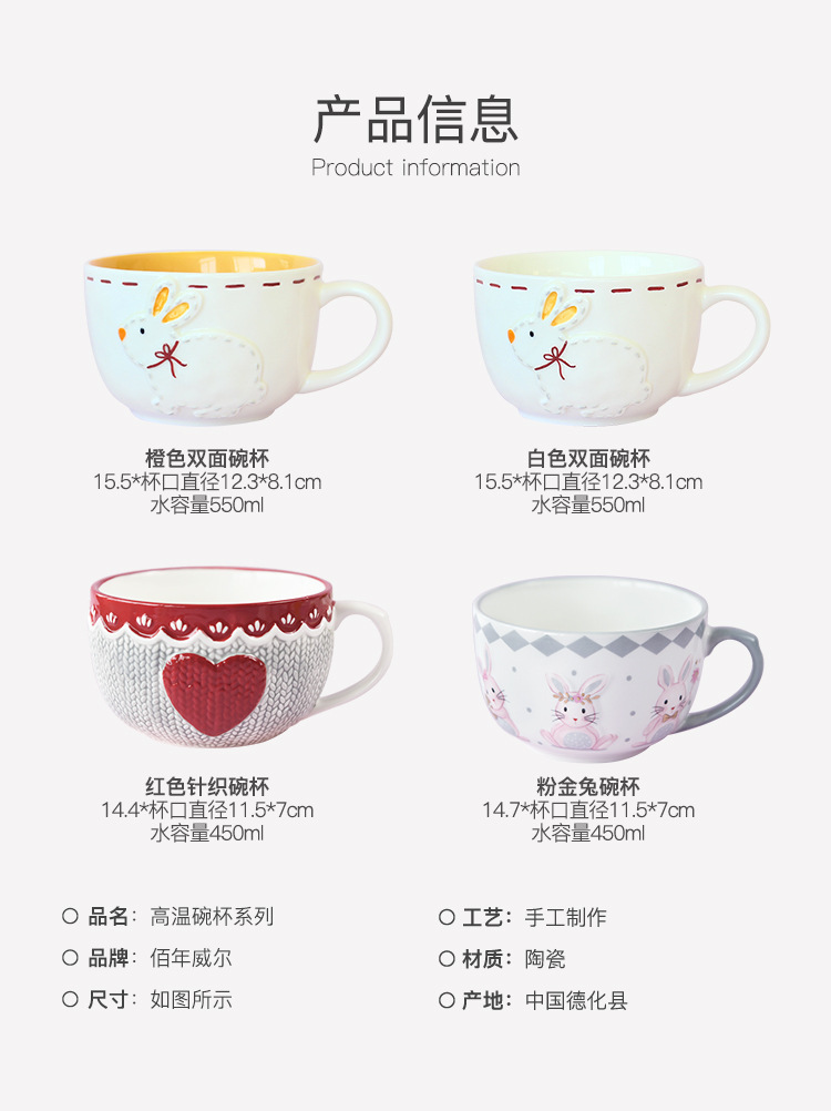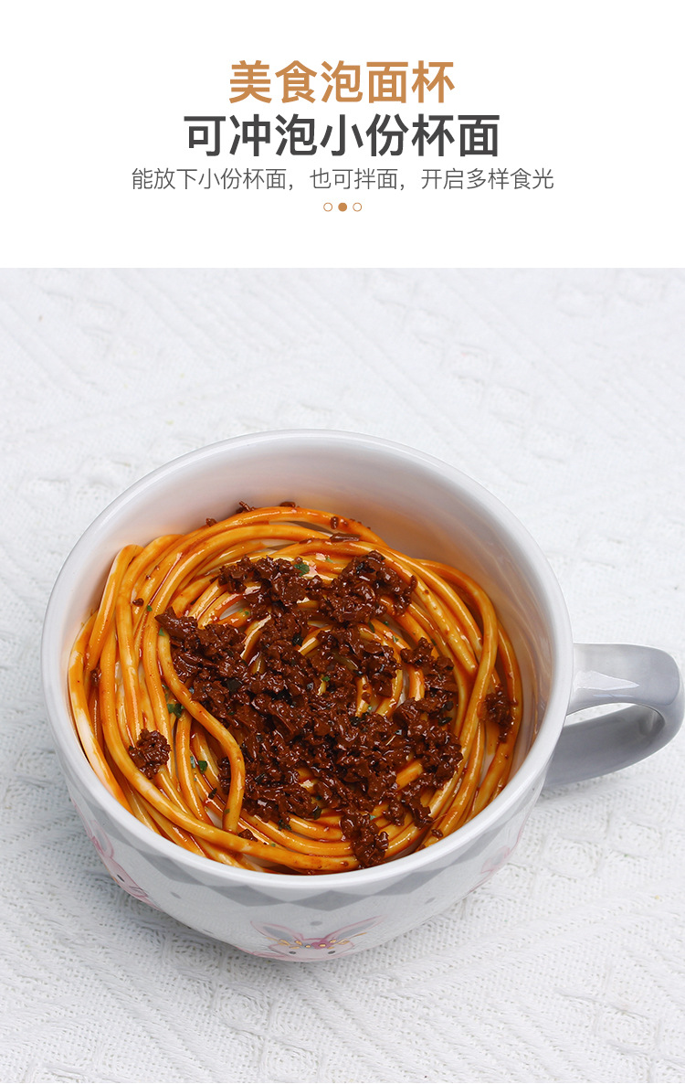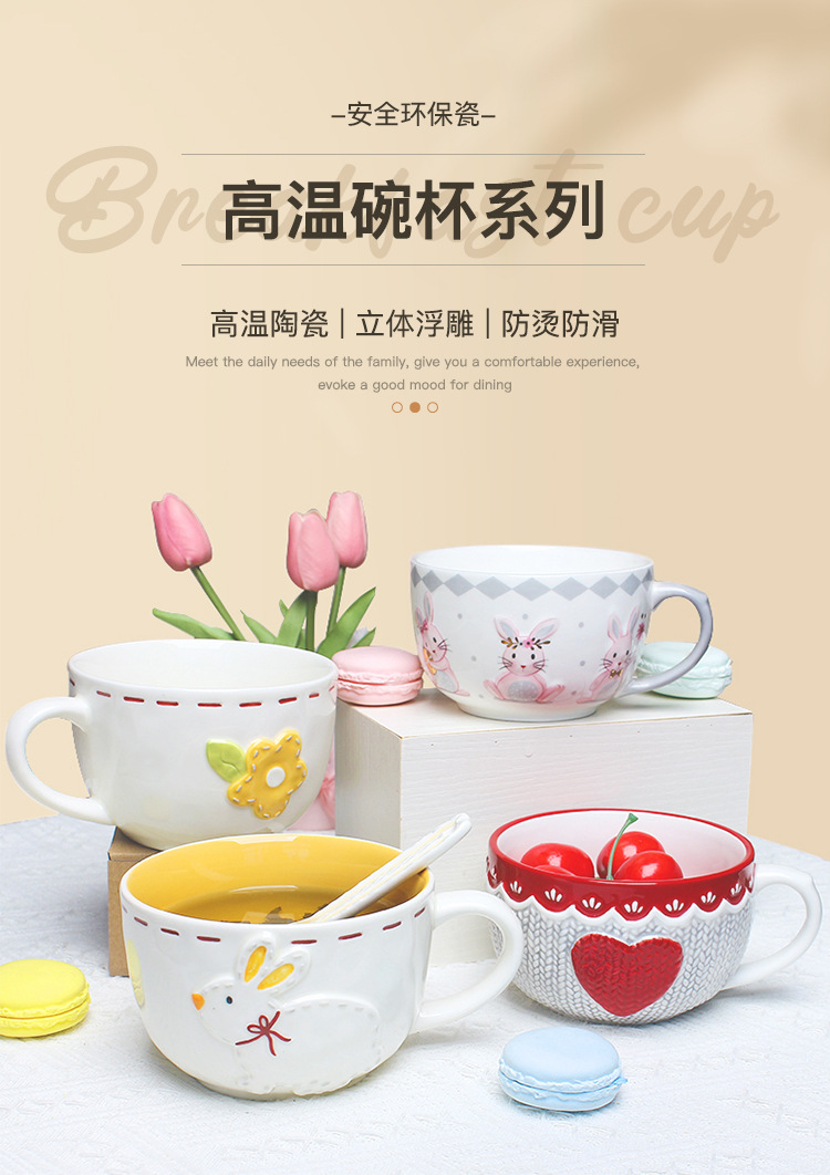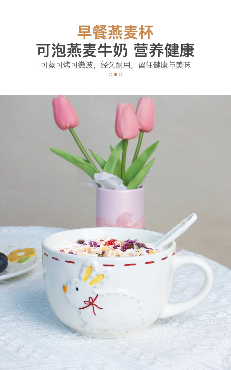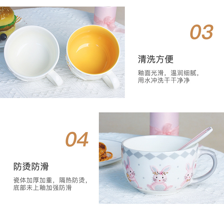 Taza de desayuno de leche de avena casera creativa dibujos animados lindo conejo mango de bolsillos de fideos de cerámica gruesa taza de sopa de gran capacidad