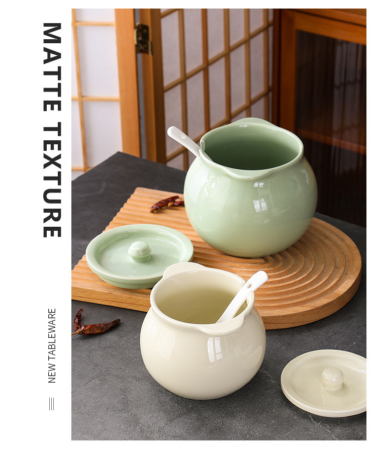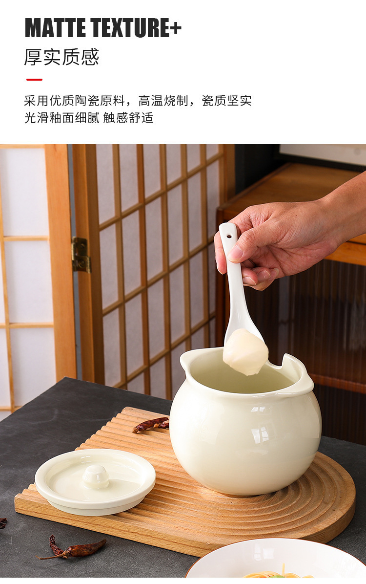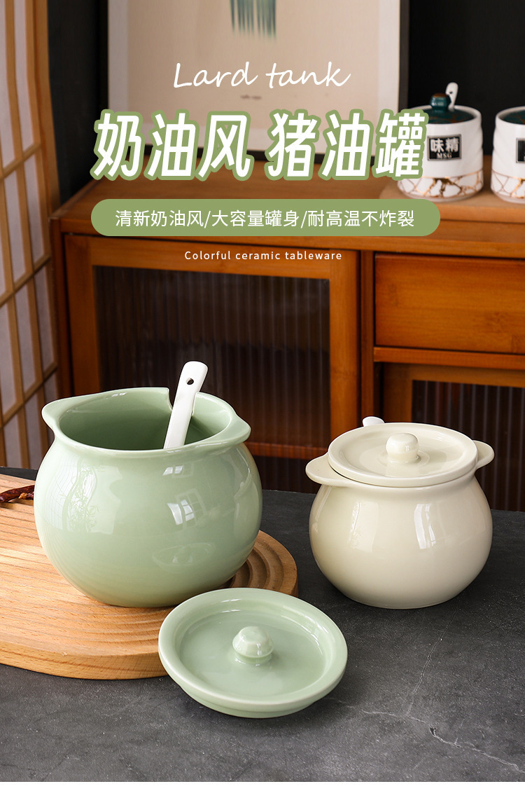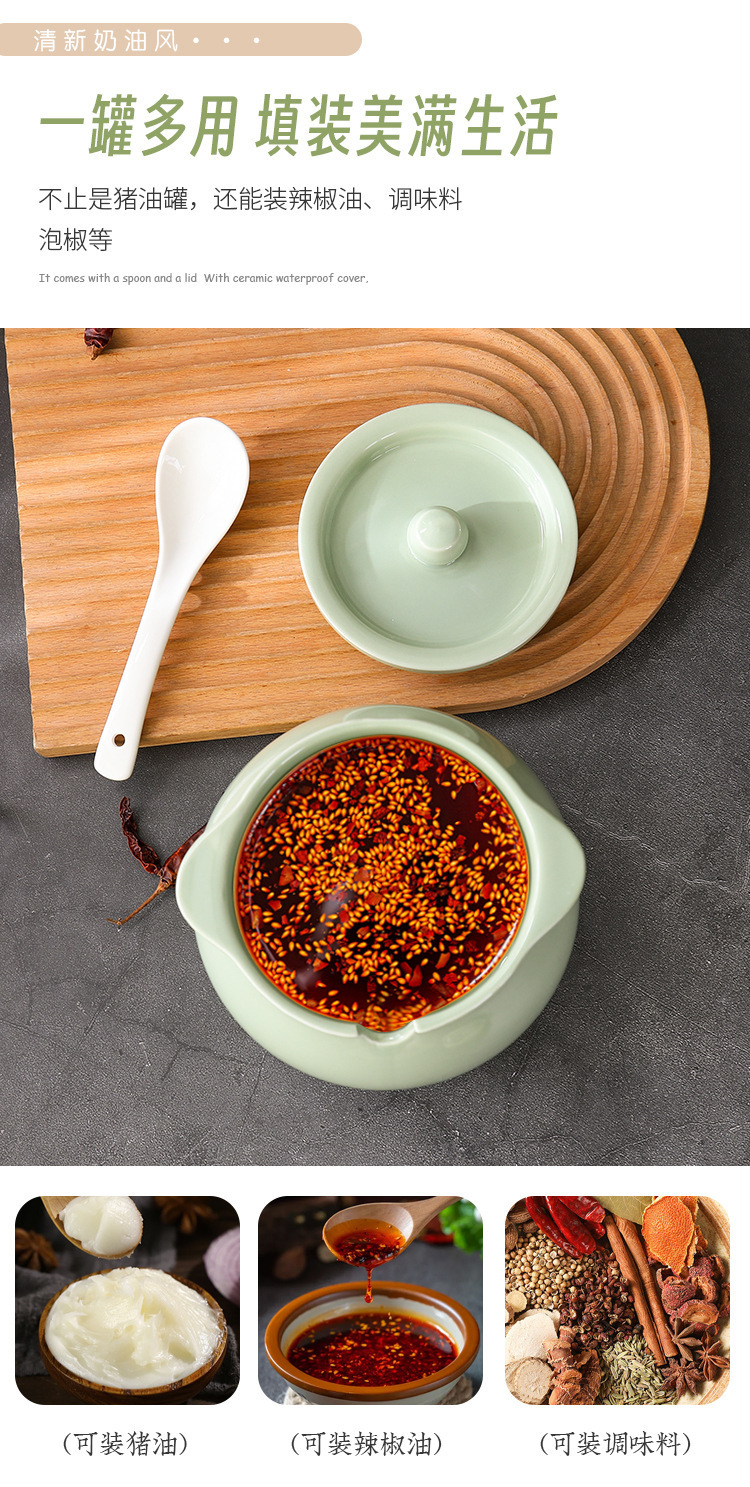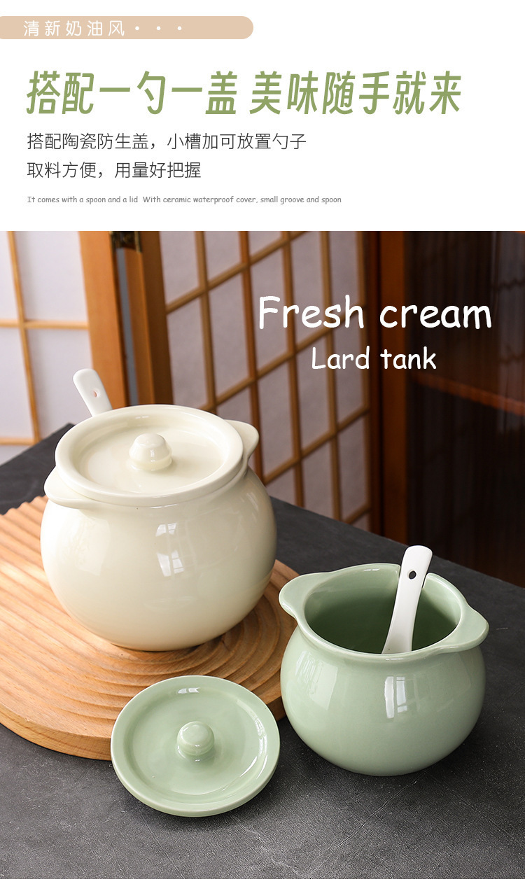 Tanque de aceite de cerdo de cerámica nórdica, cocina casera de estilo crema, resistente a altas temperaturas, tanque de condimento con cuchara con tapa, frasco de aceite de carne de chile