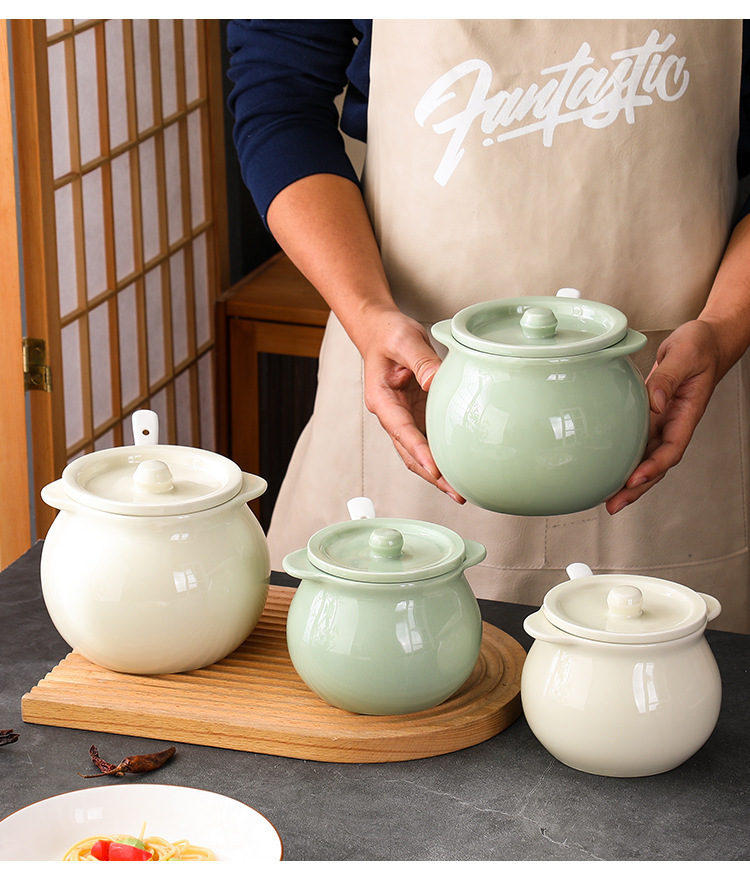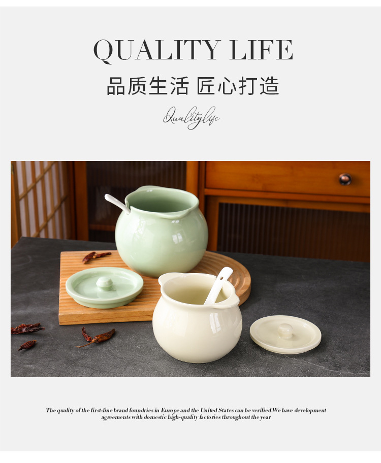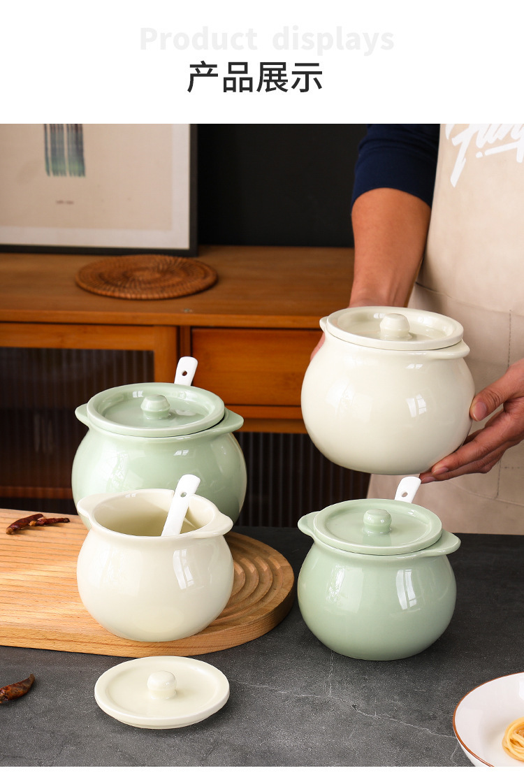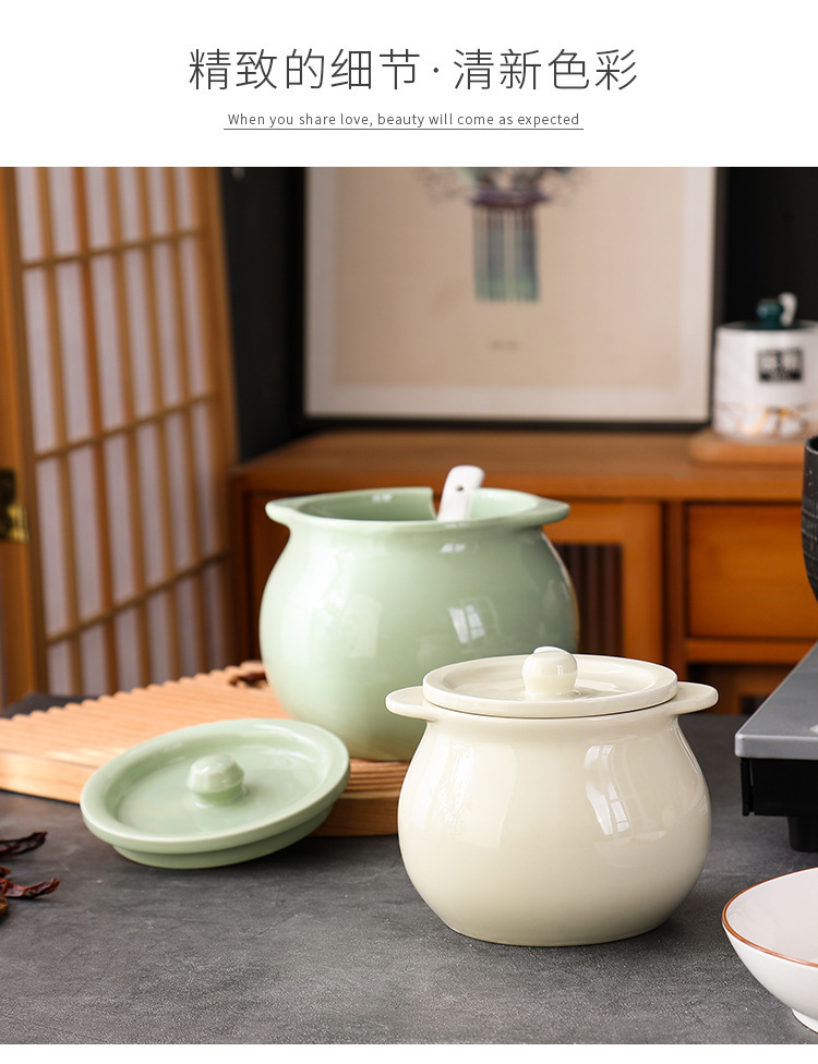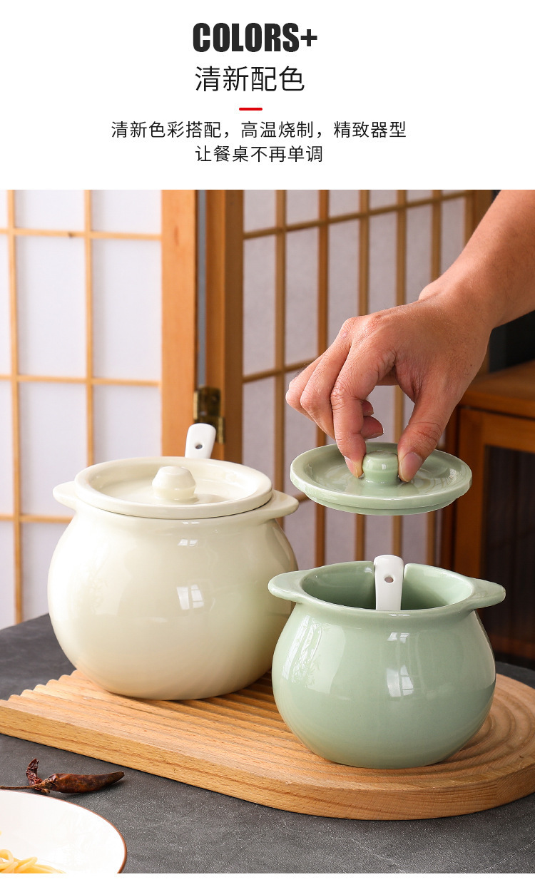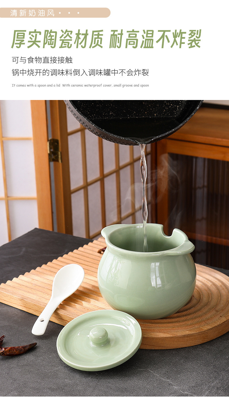 Tanque de aceite de cerdo de cerámica nórdica, cocina casera de estilo crema, resistente a altas temperaturas, tanque de condimento con cuchara con tapa, frasco de aceite de carne de chile