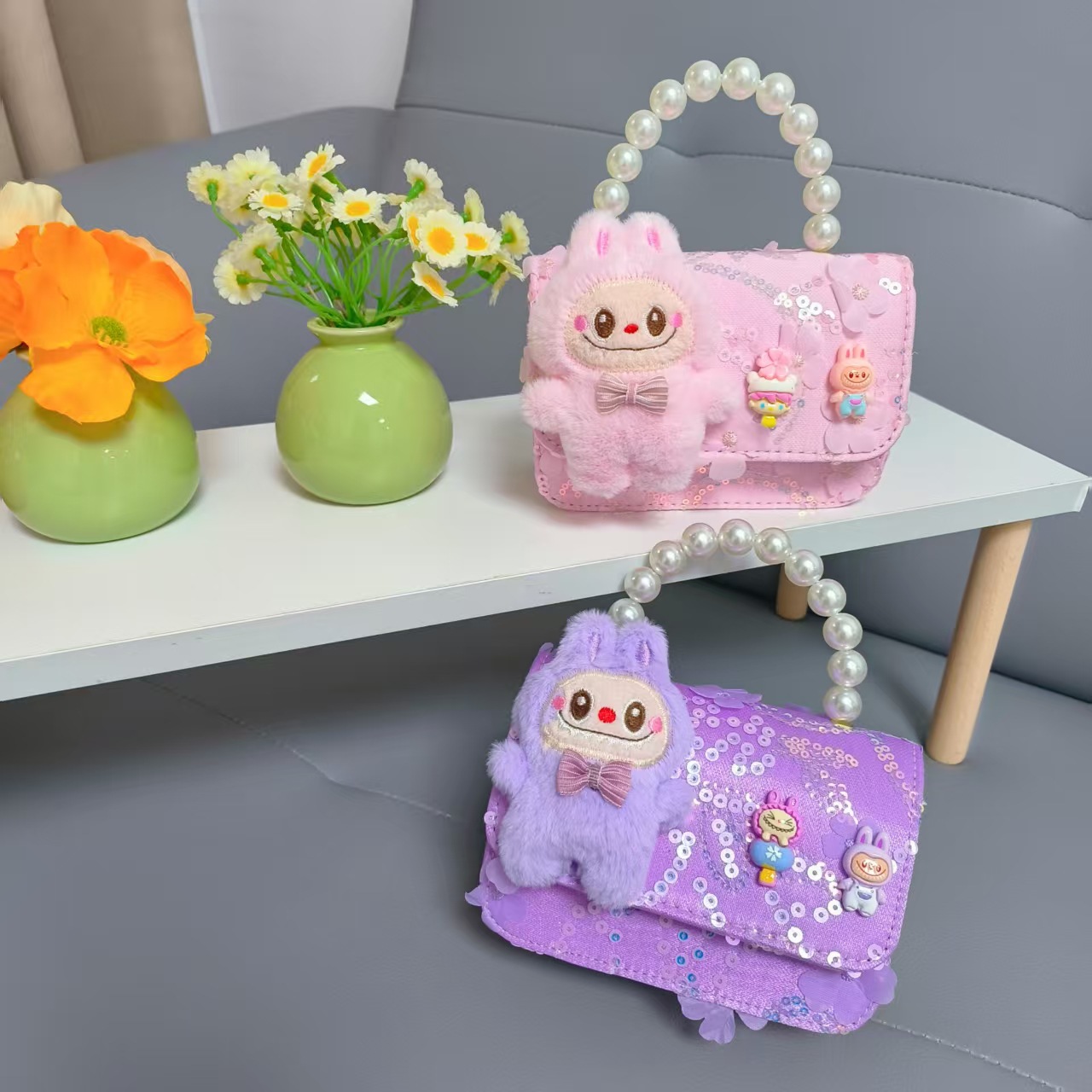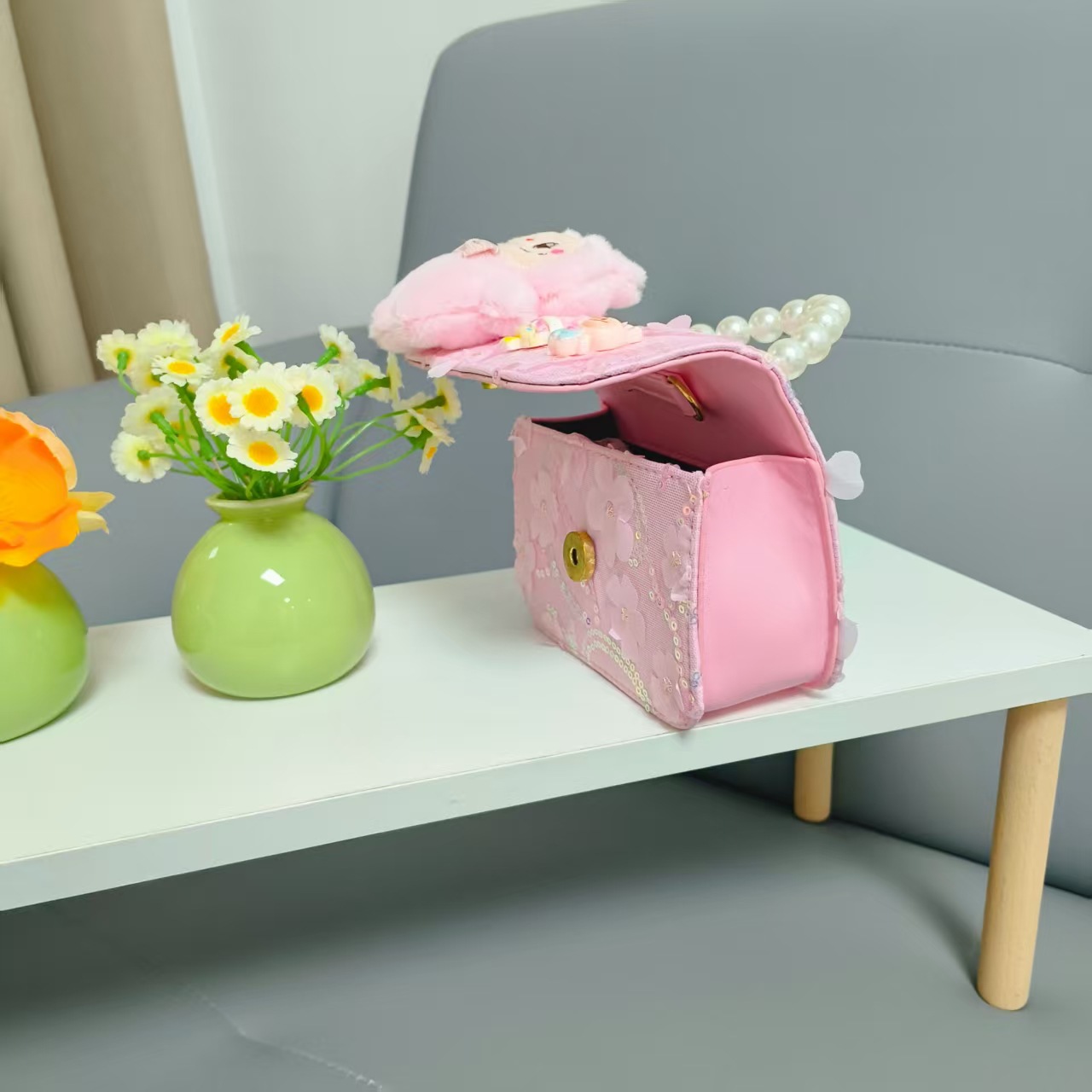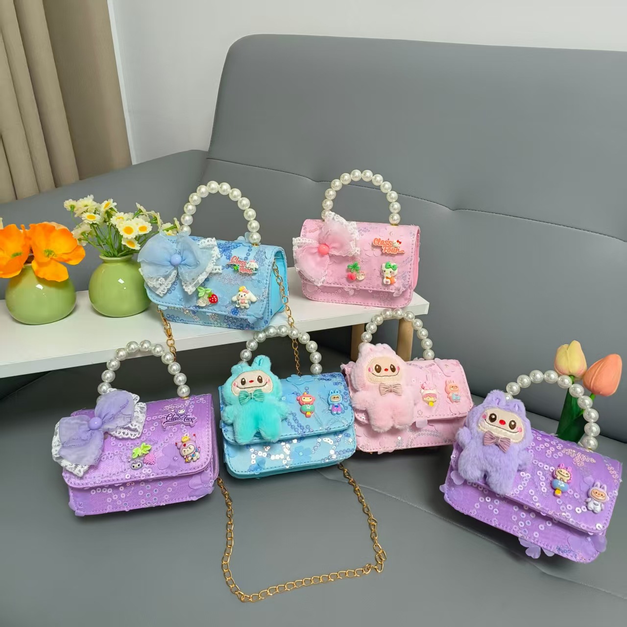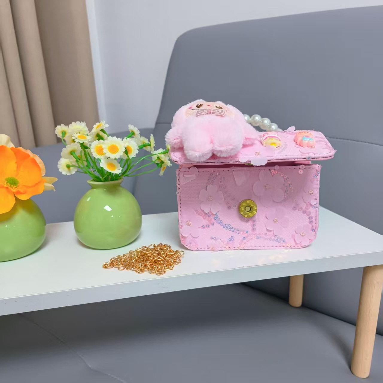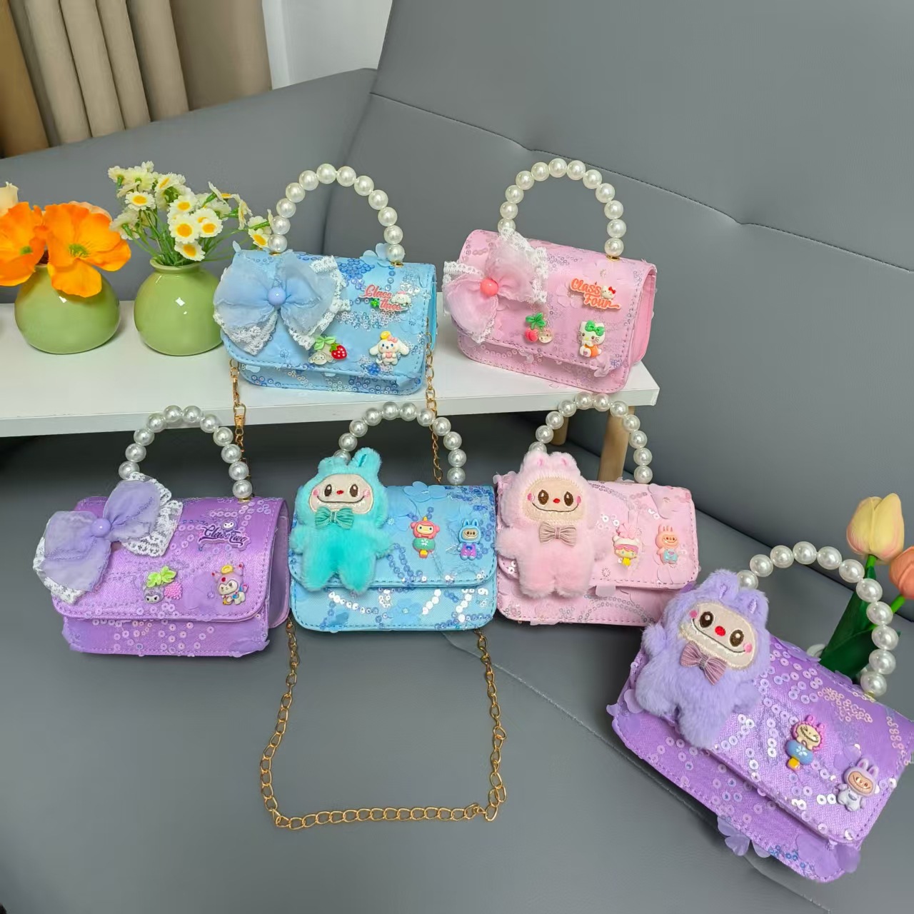 Niños perlas bolsos portátiles de princesa bolsos de cinturón de viento fragante bolsos de Año Nuevo de chicas bolsos de arco de cadena bolsos pequeños