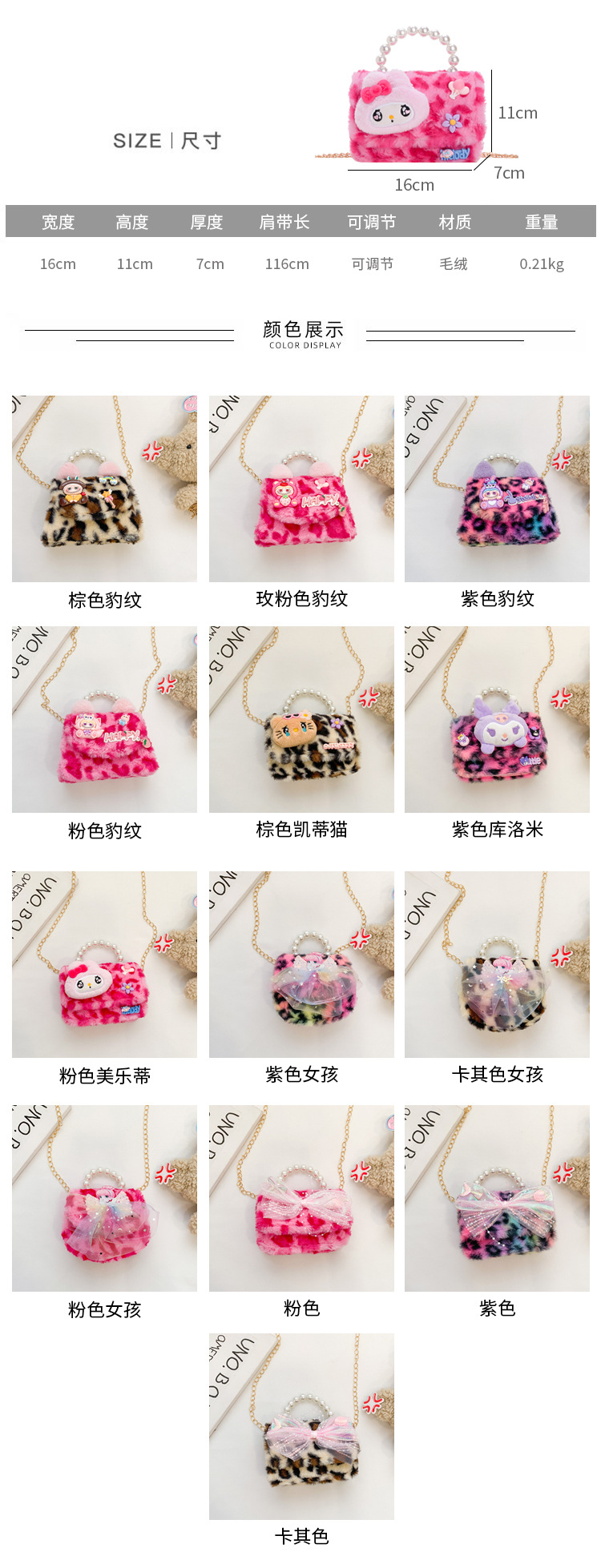 | Color | Leopardo marrón, leopardo rosa, leopardo púrpura, leopardo rosa, Kate marrón, colo púrpura, melon rosa, chica púrpura, chica khaki, chica rosa, arco rosa, arco púrpura, arco khaki |