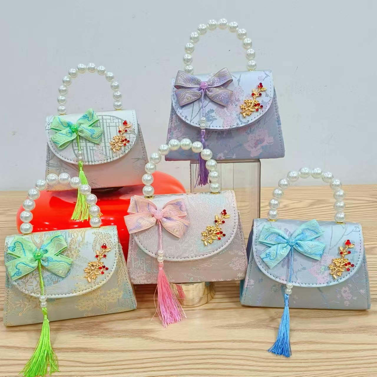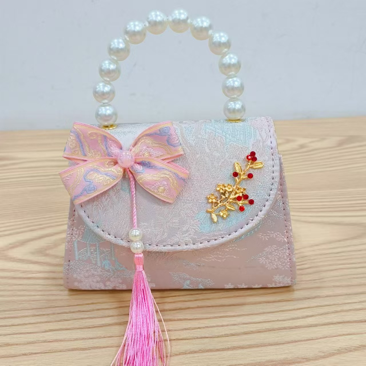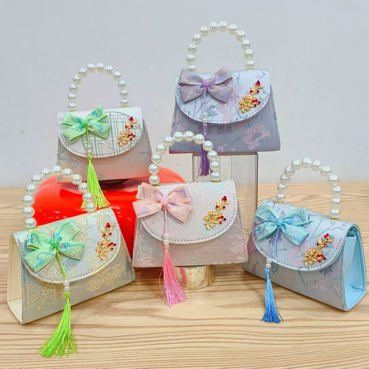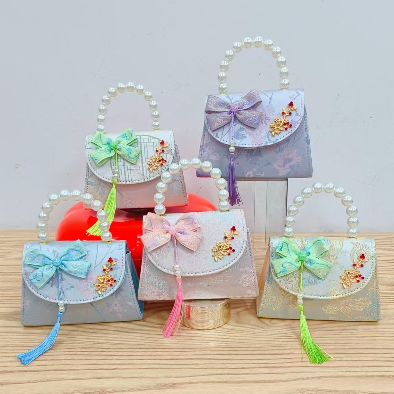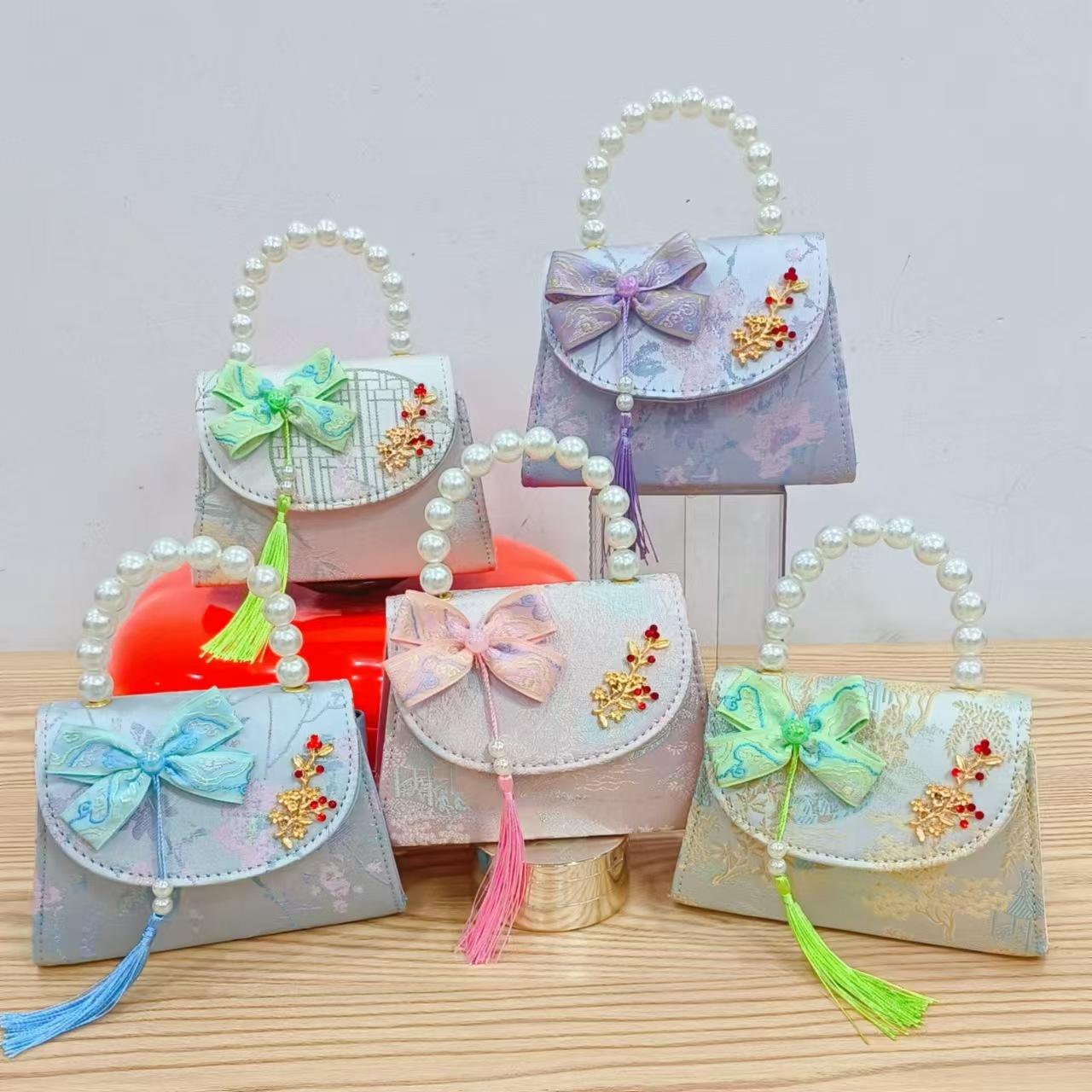 Bolsas de niños arco de estilo chino borda de niña pequeña princesa perla bolsa de cambio de mano al por mayor