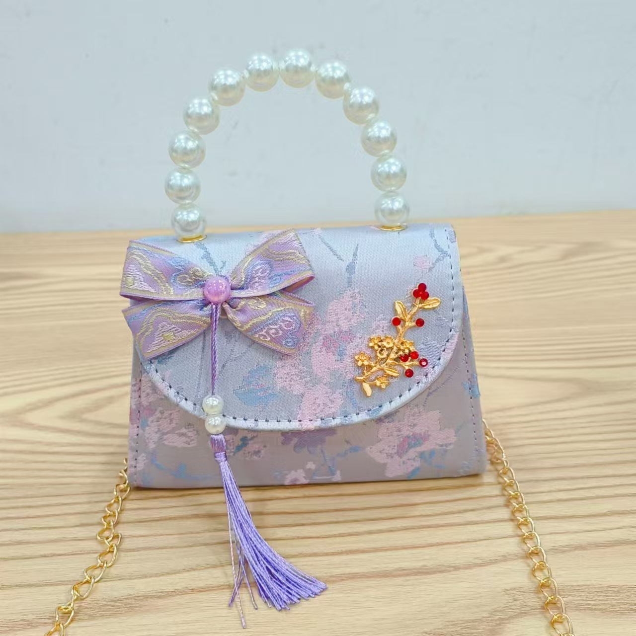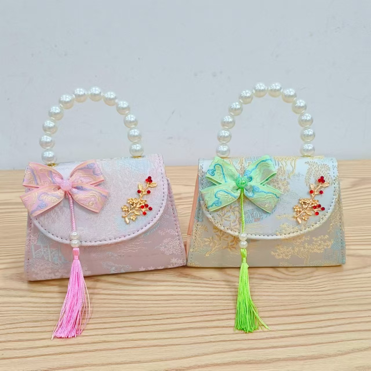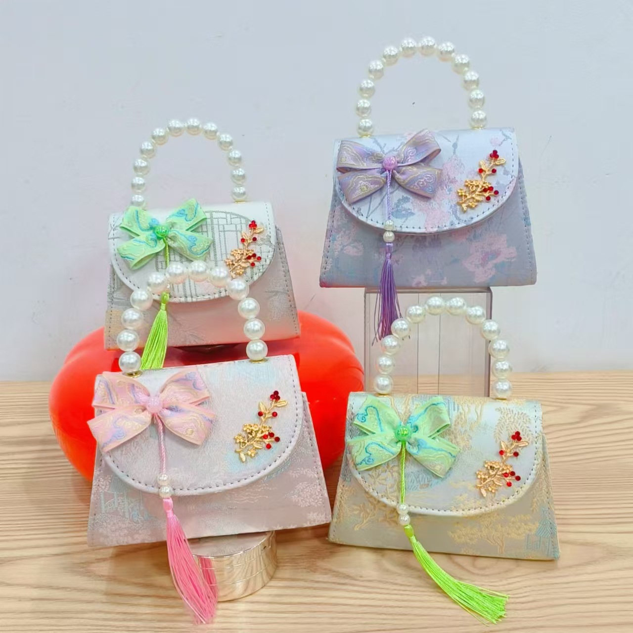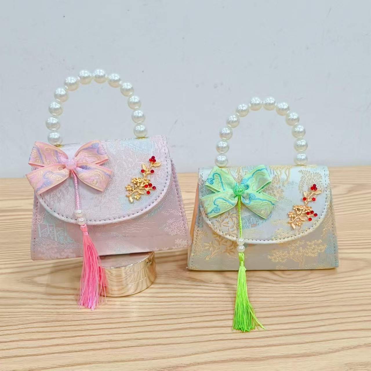 Bolsas de niños arco de estilo chino borda de niña pequeña princesa perla bolsa de cambio de mano al por mayor