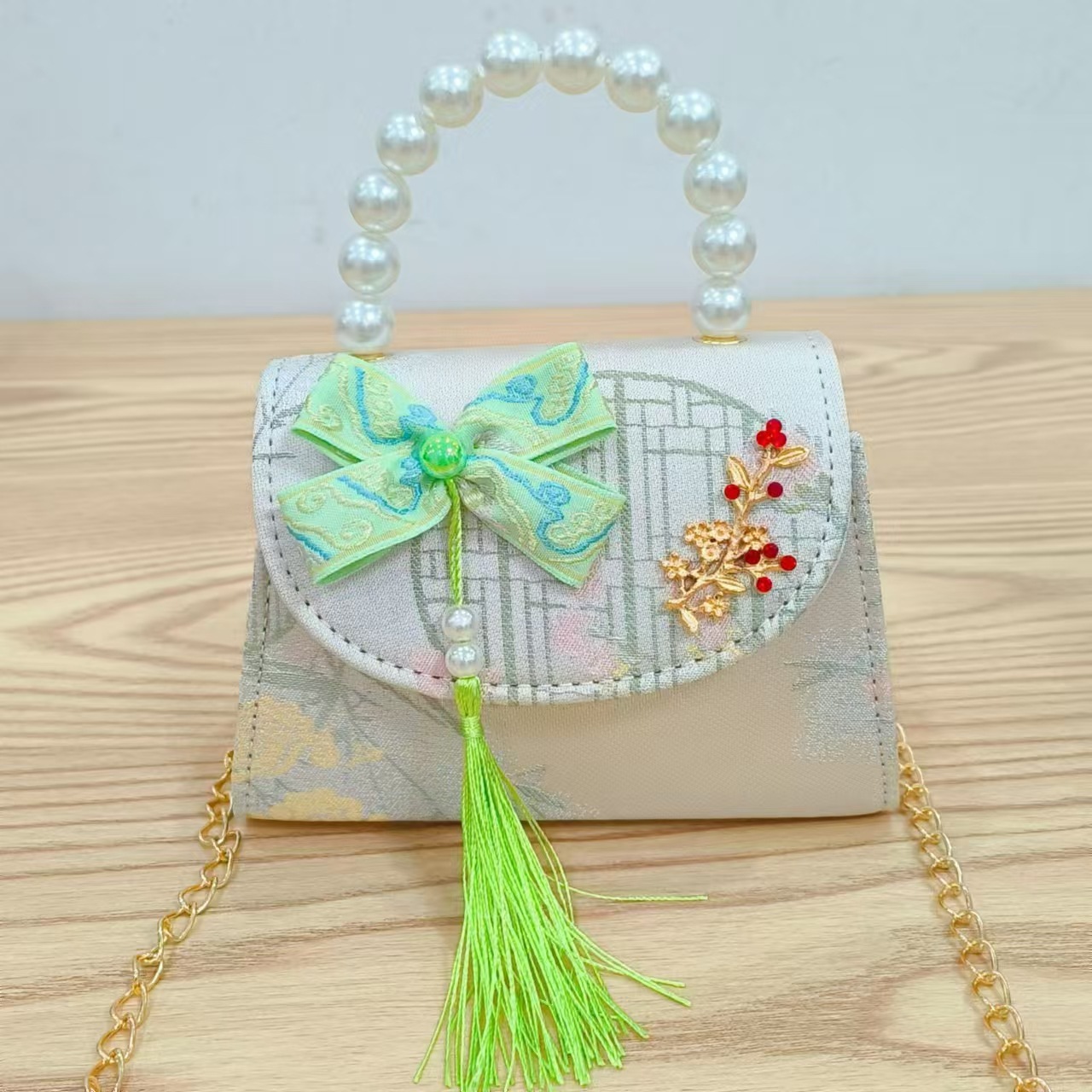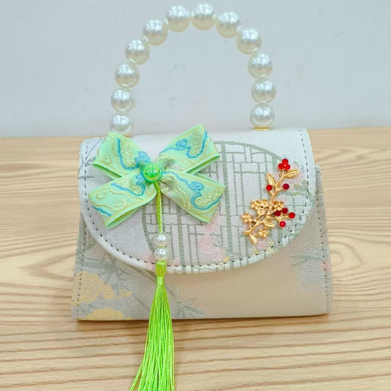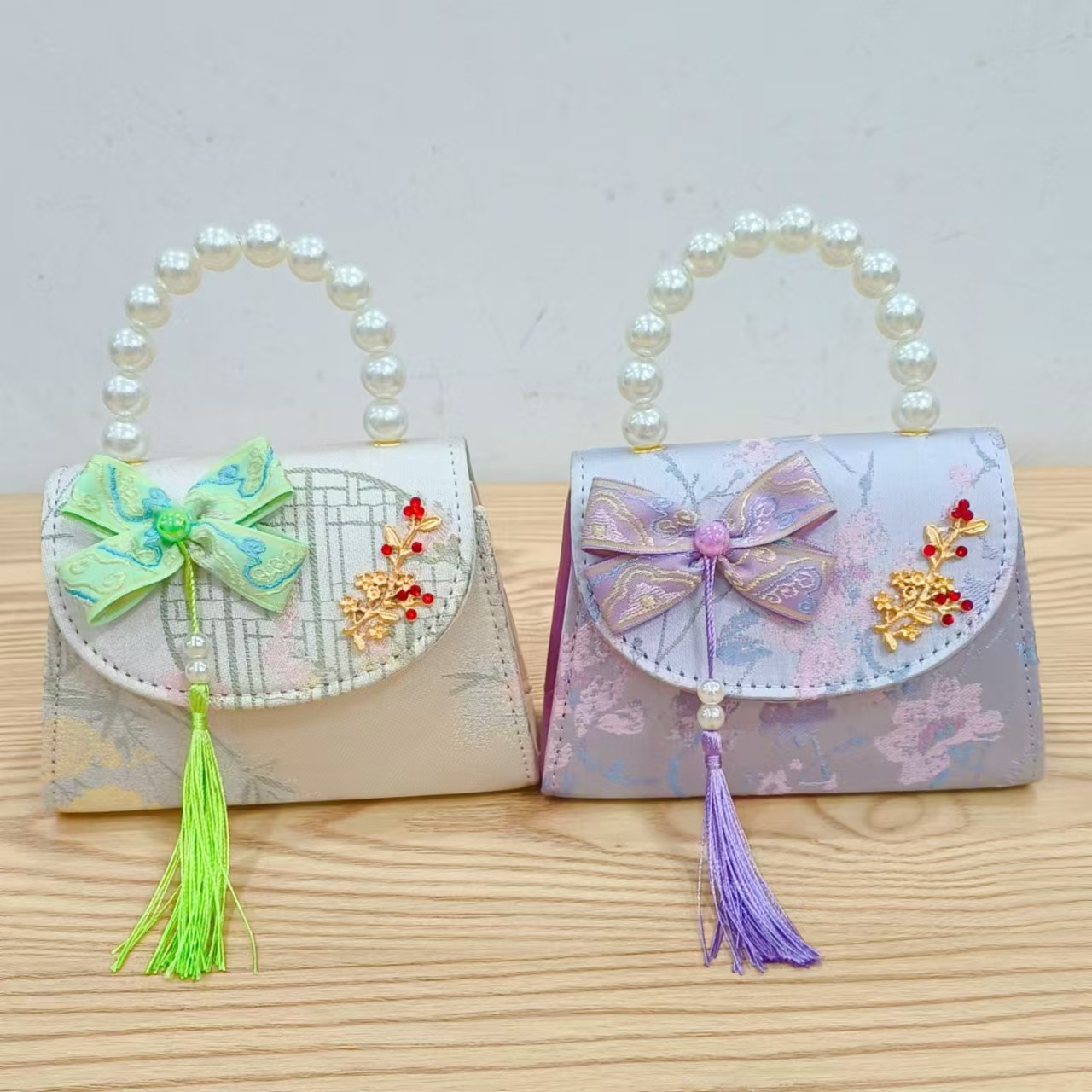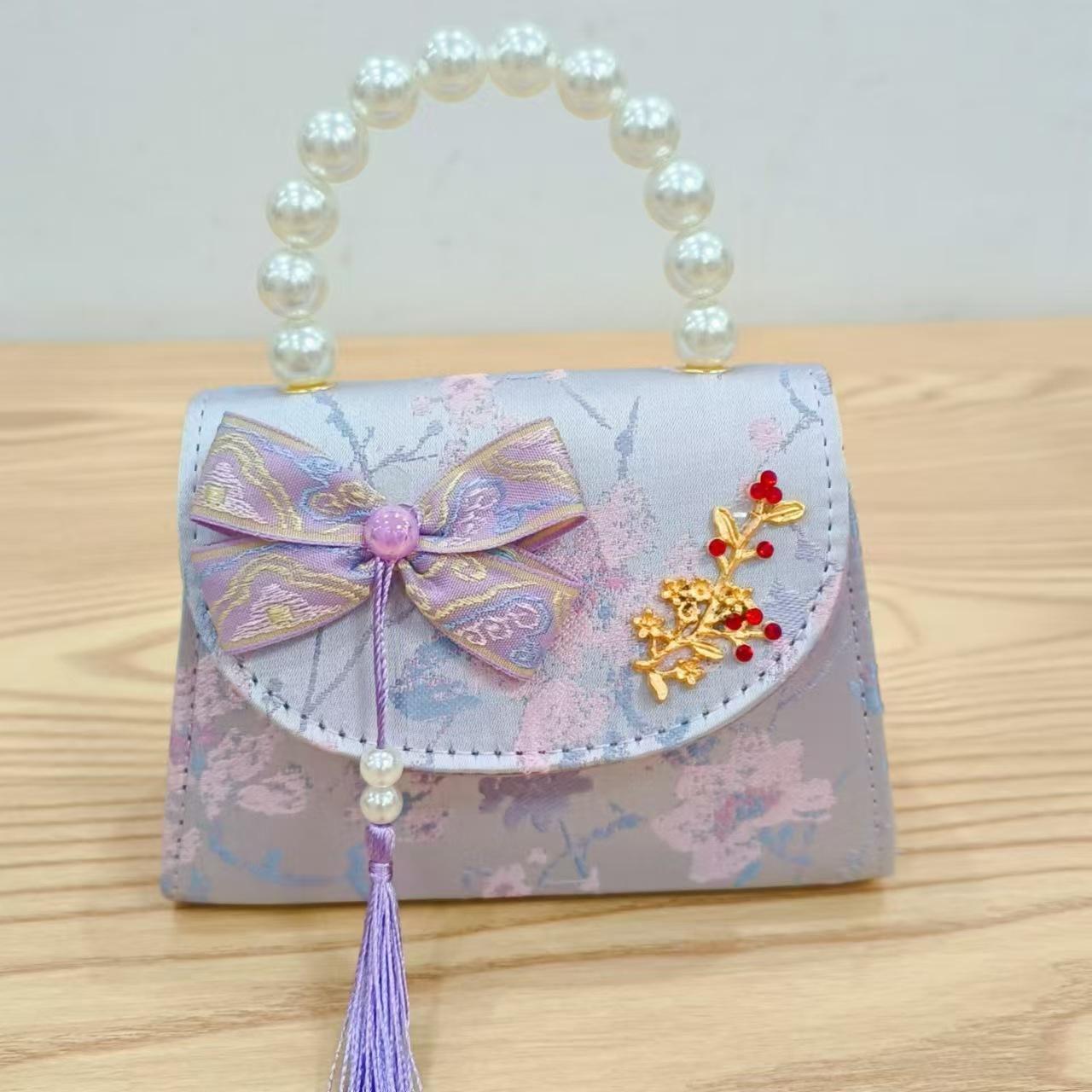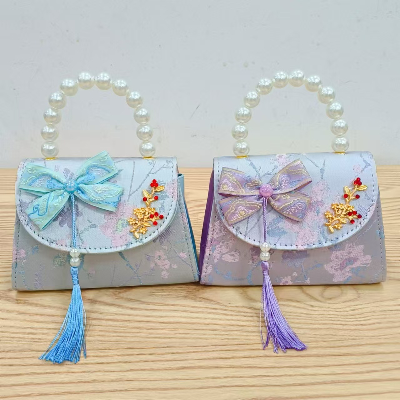 Bolsas de niños arco de estilo chino borda de niña pequeña princesa perla bolsa de cambio de mano al por mayor
