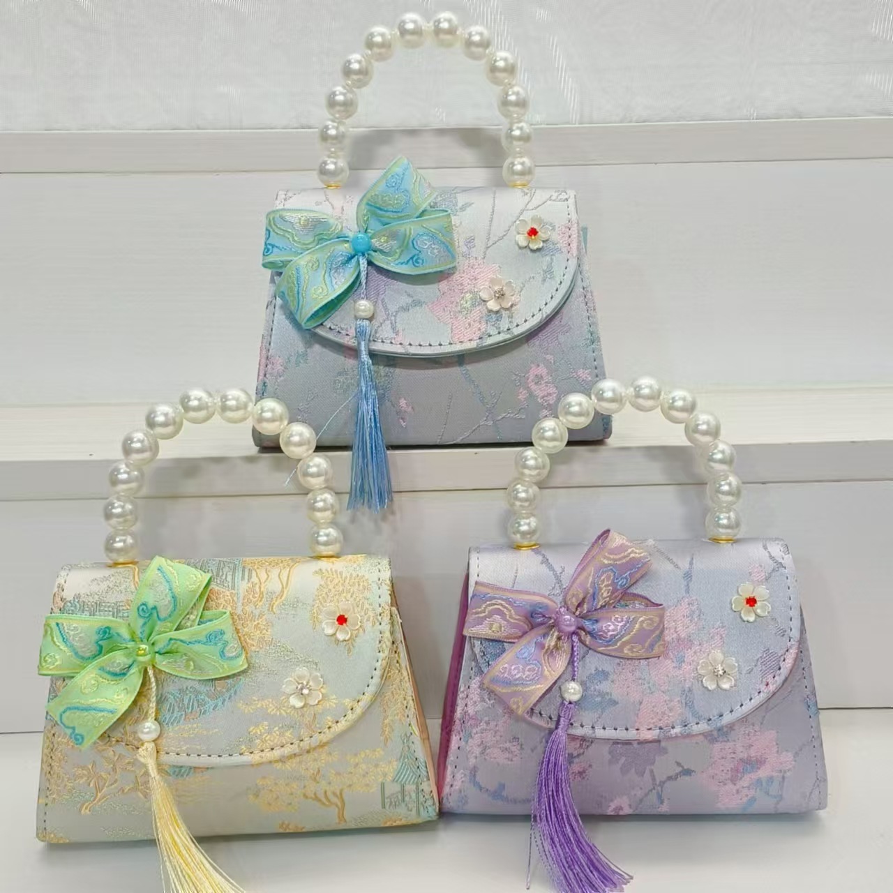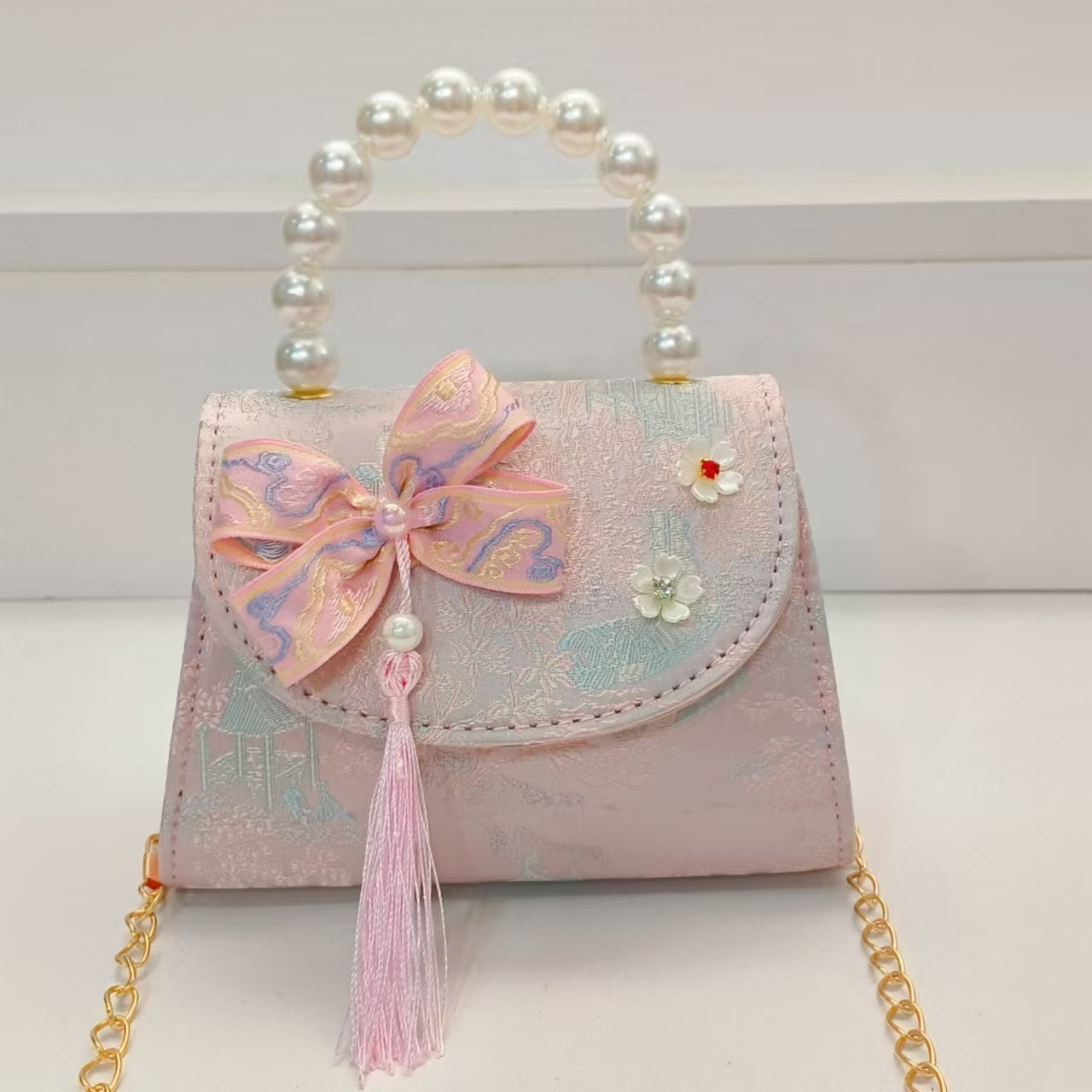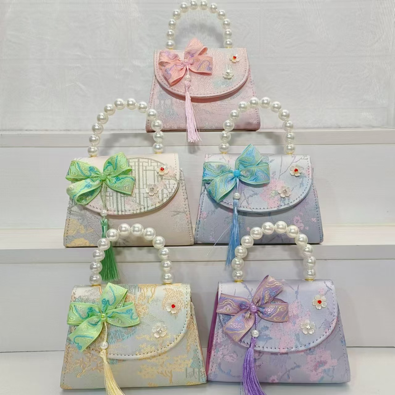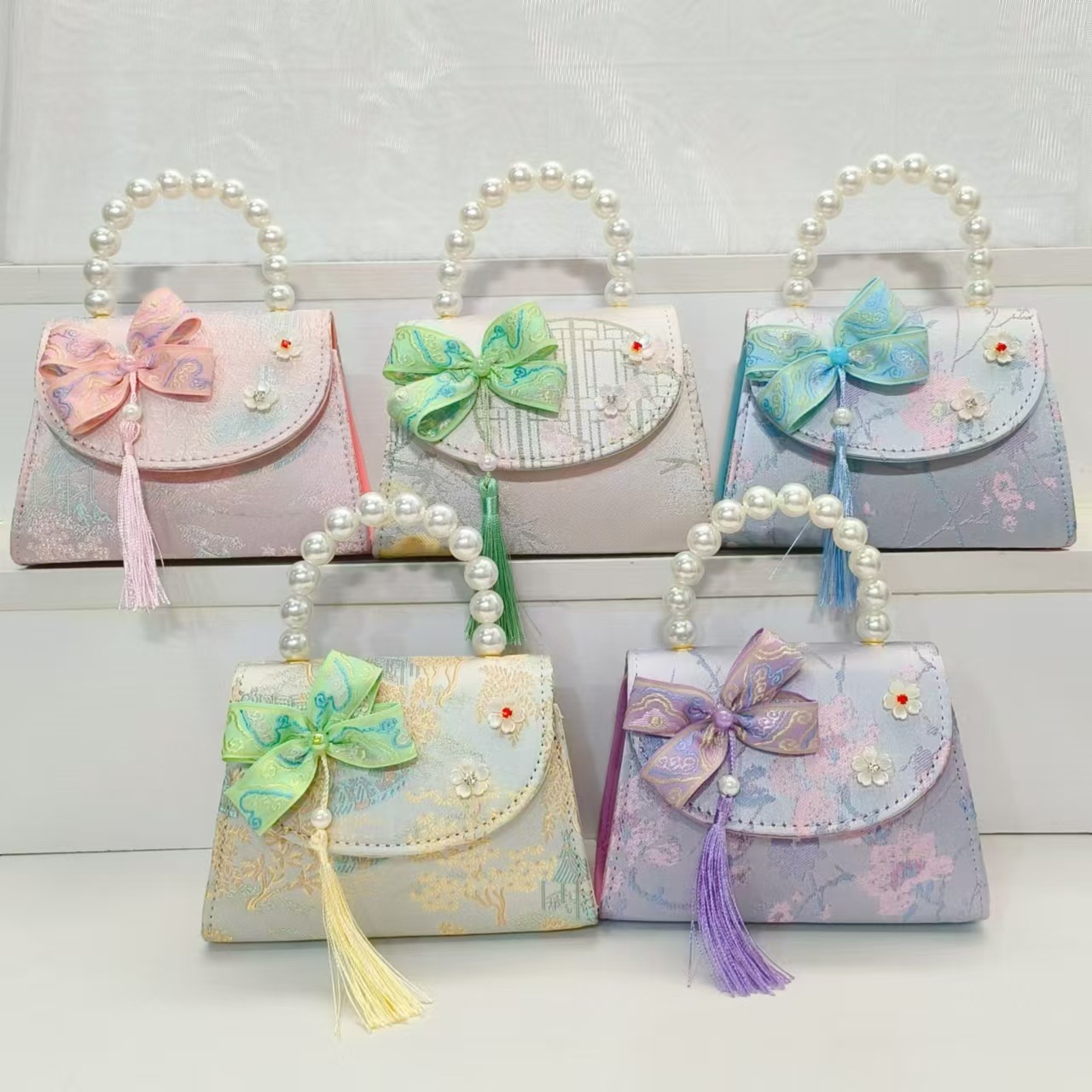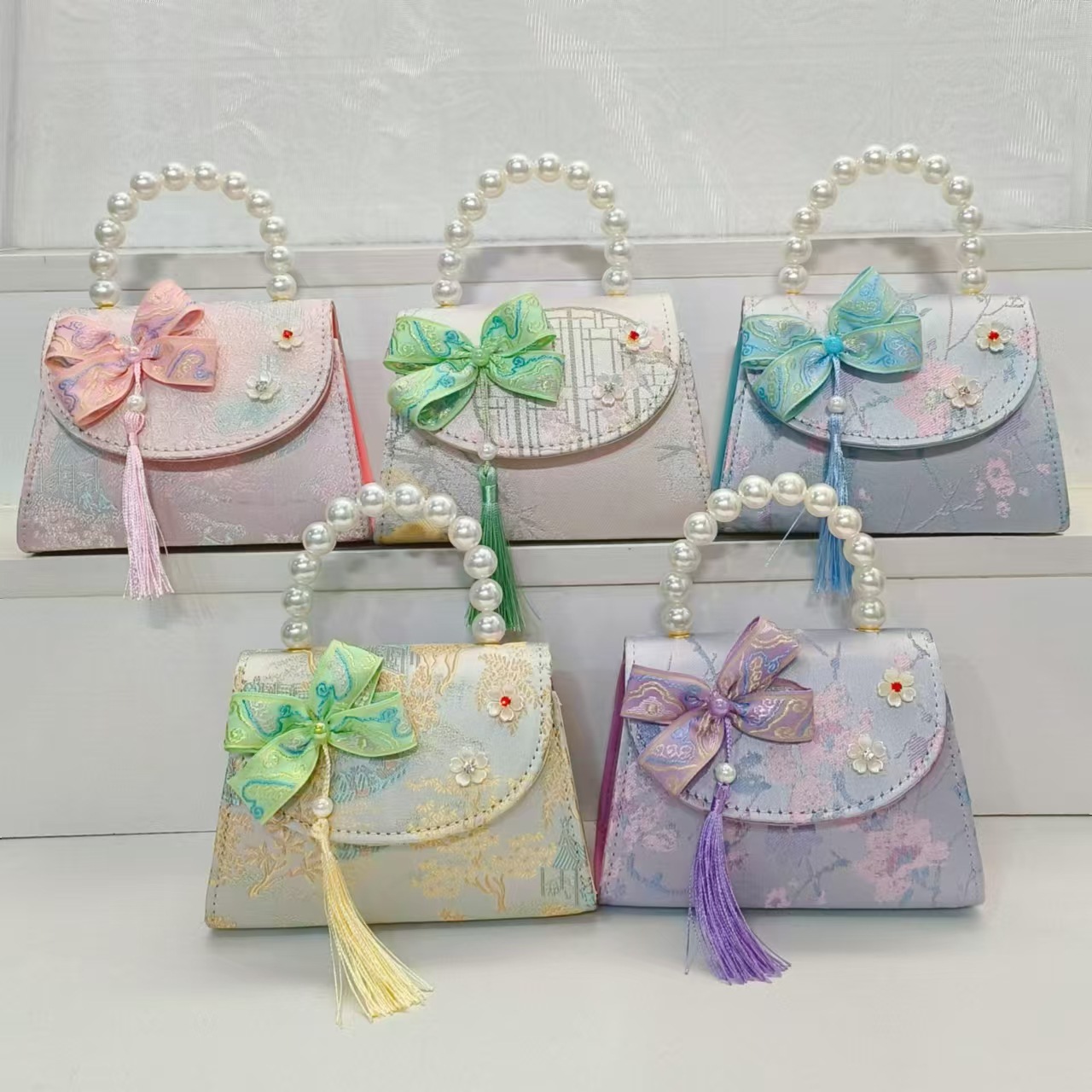 Bolsas de niños arco de estilo chino borda de niña pequeña princesa perla bolsa de cambio de mano al por mayor