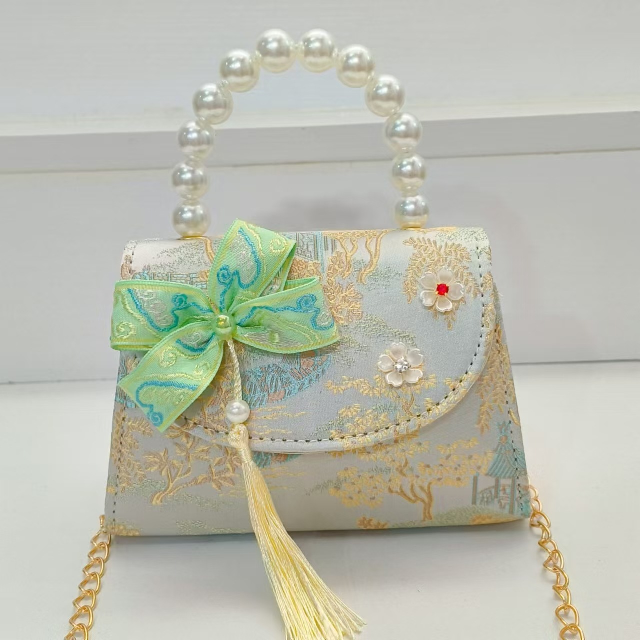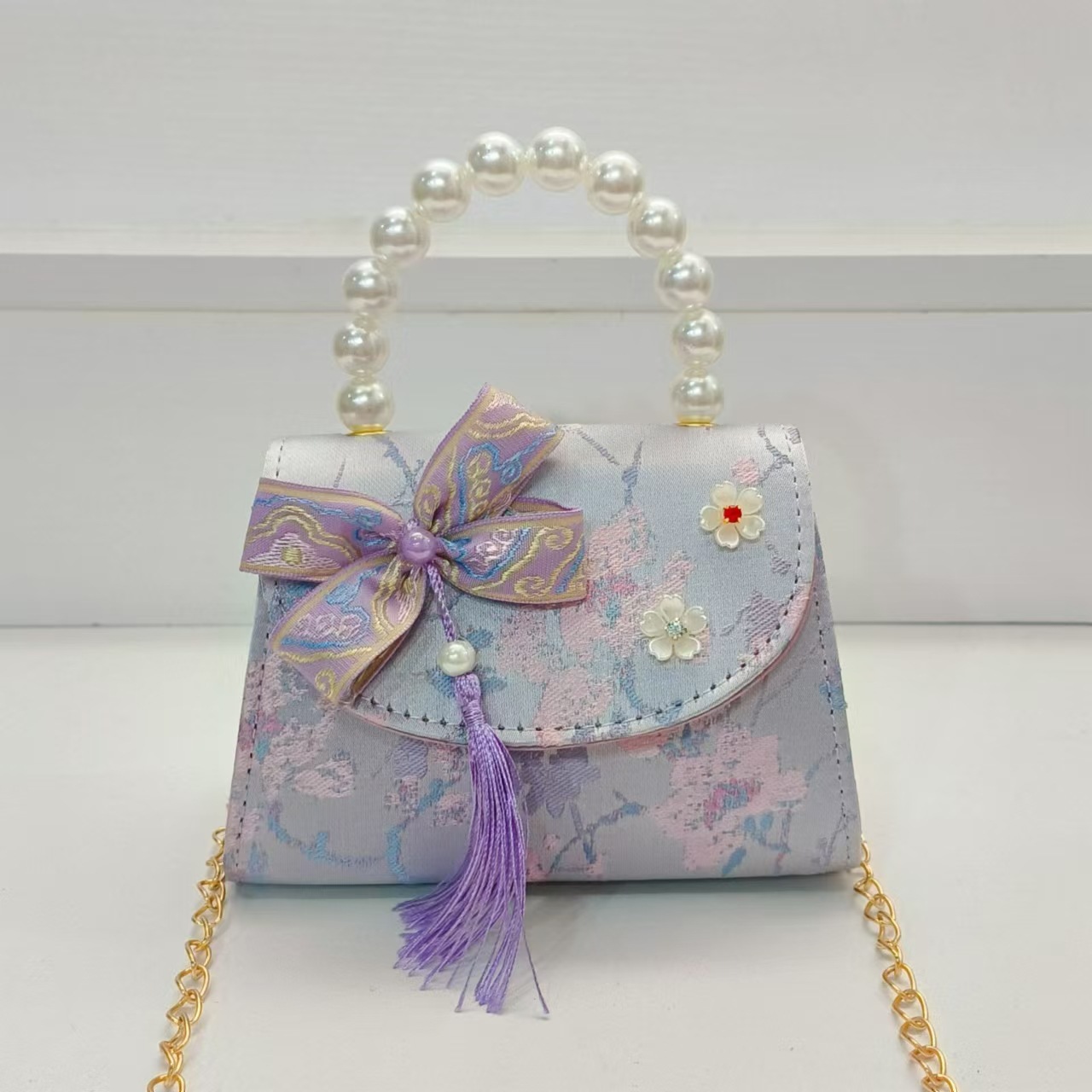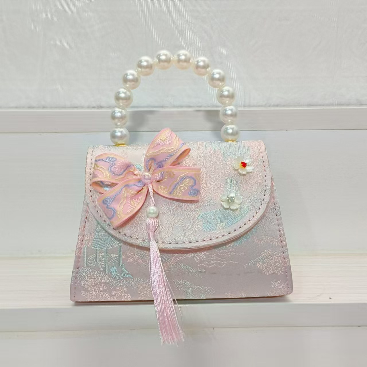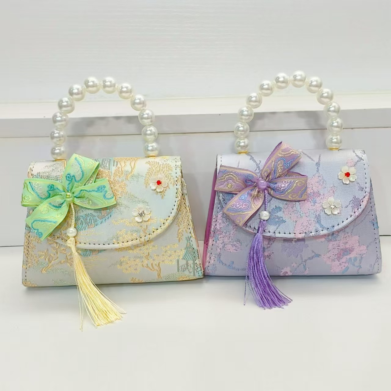 Bolsas de niños arco de estilo chino borda de niña pequeña princesa perla bolsa de cambio de mano al por mayor
