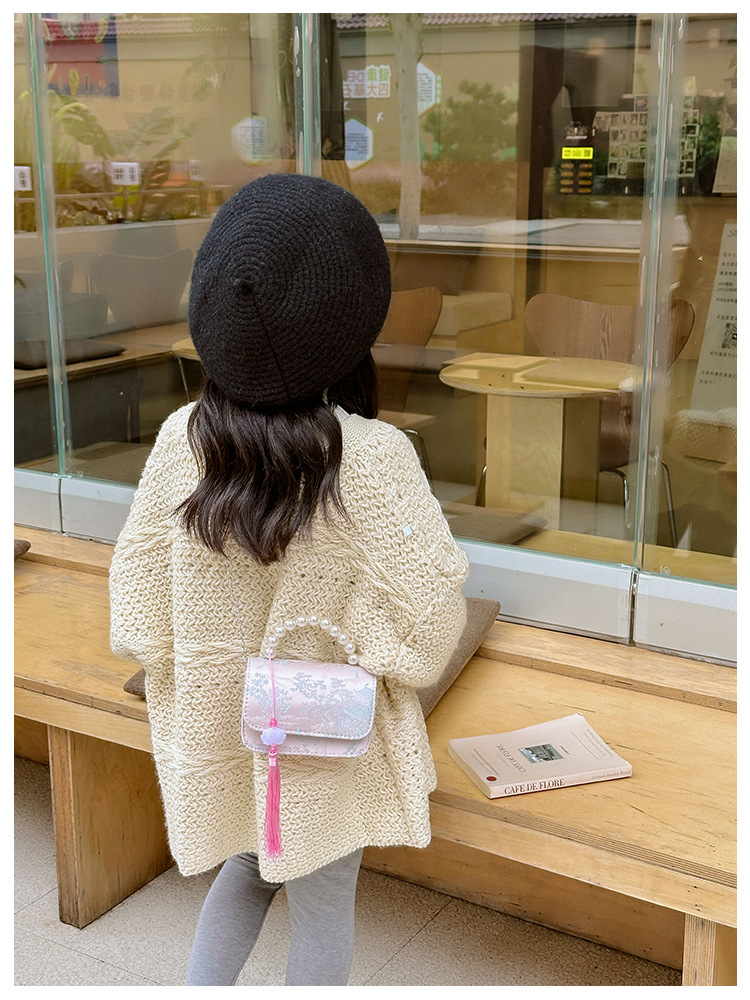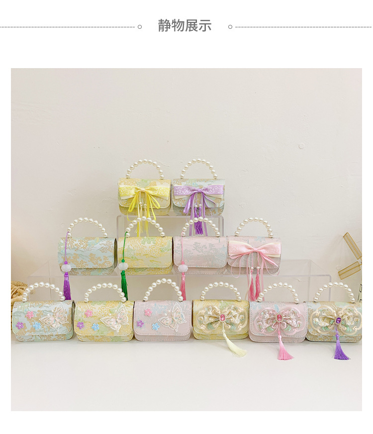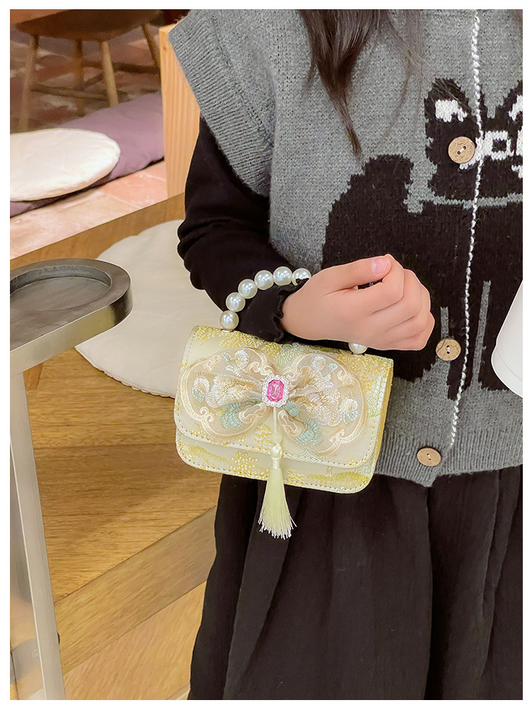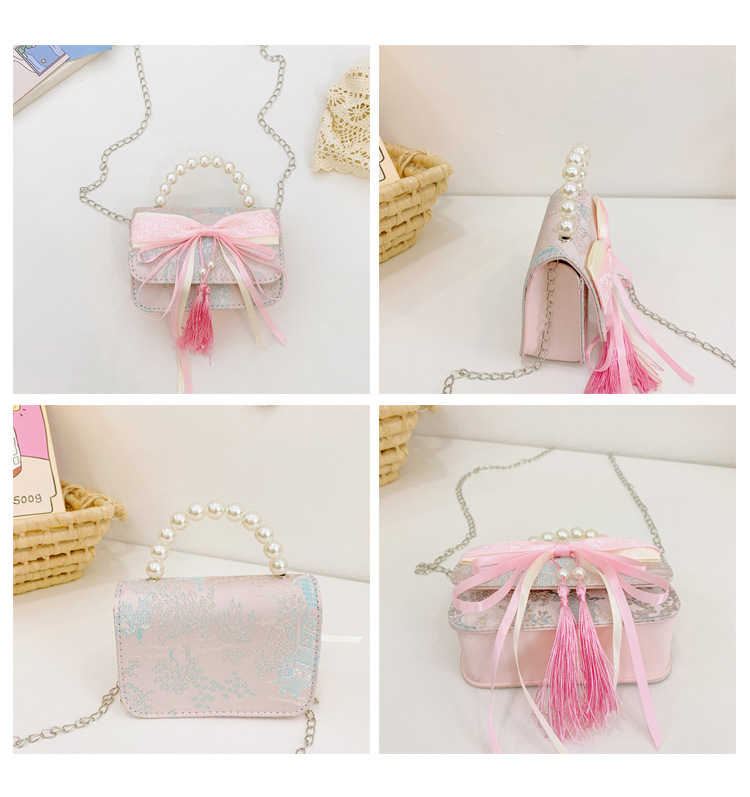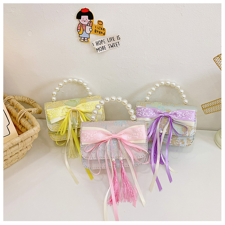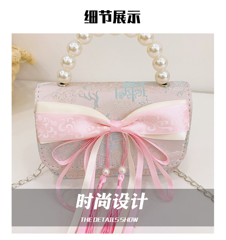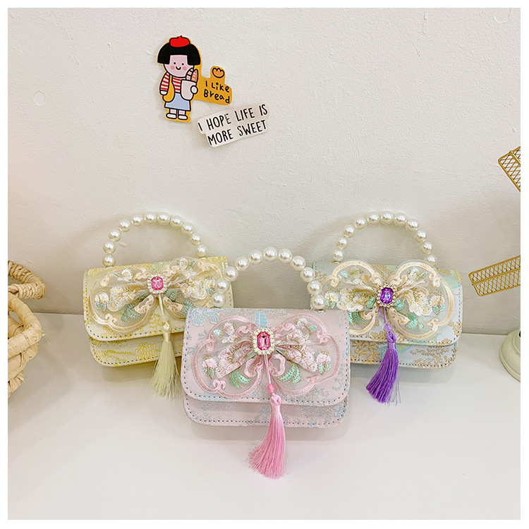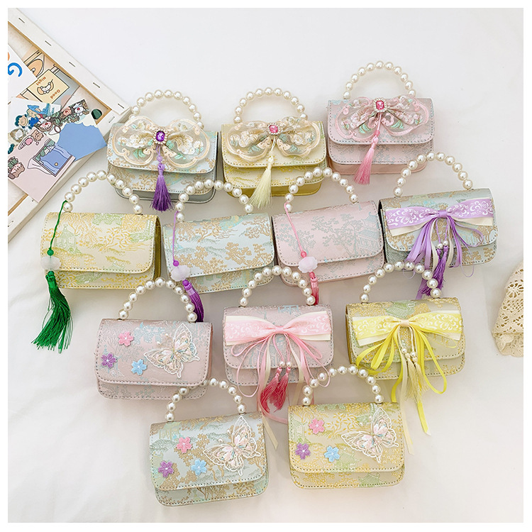 Bolsas de niños nuevas bolsas de mano de perlas de estilo nacional, bolsas de cadena de arco de bordilla princesa, bolsas de hombro de moda nacional de niñas lotes