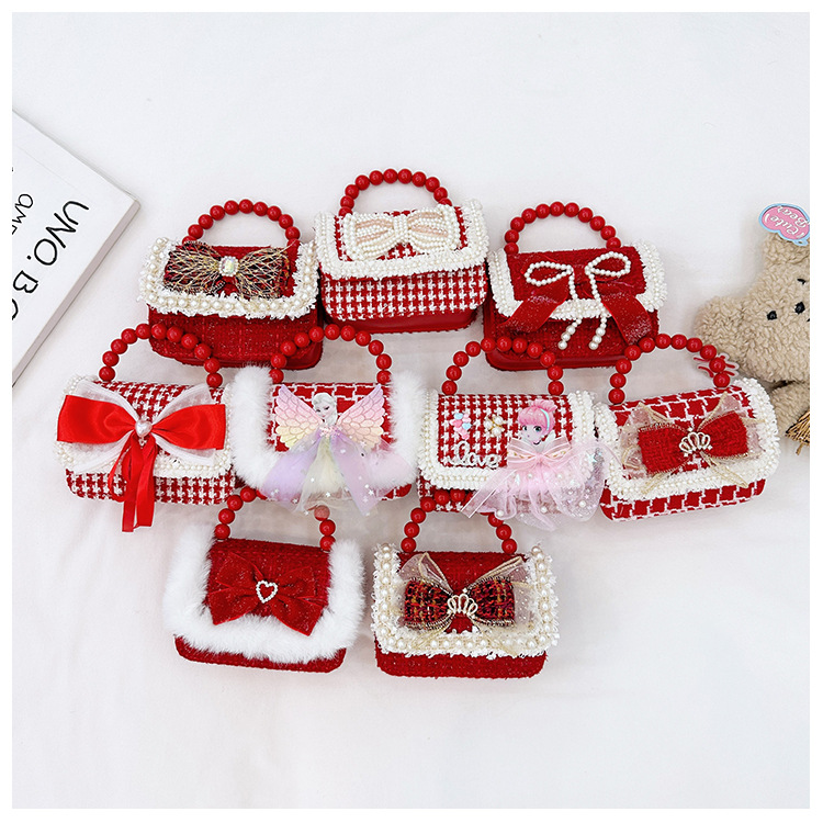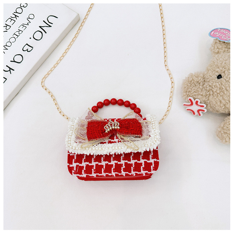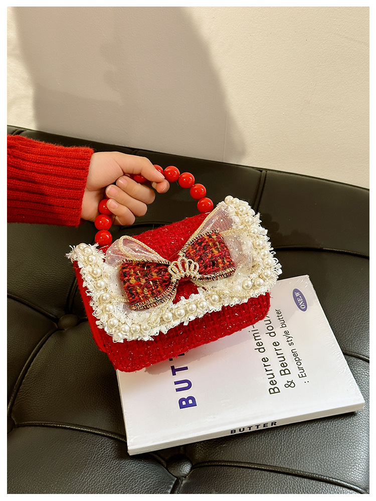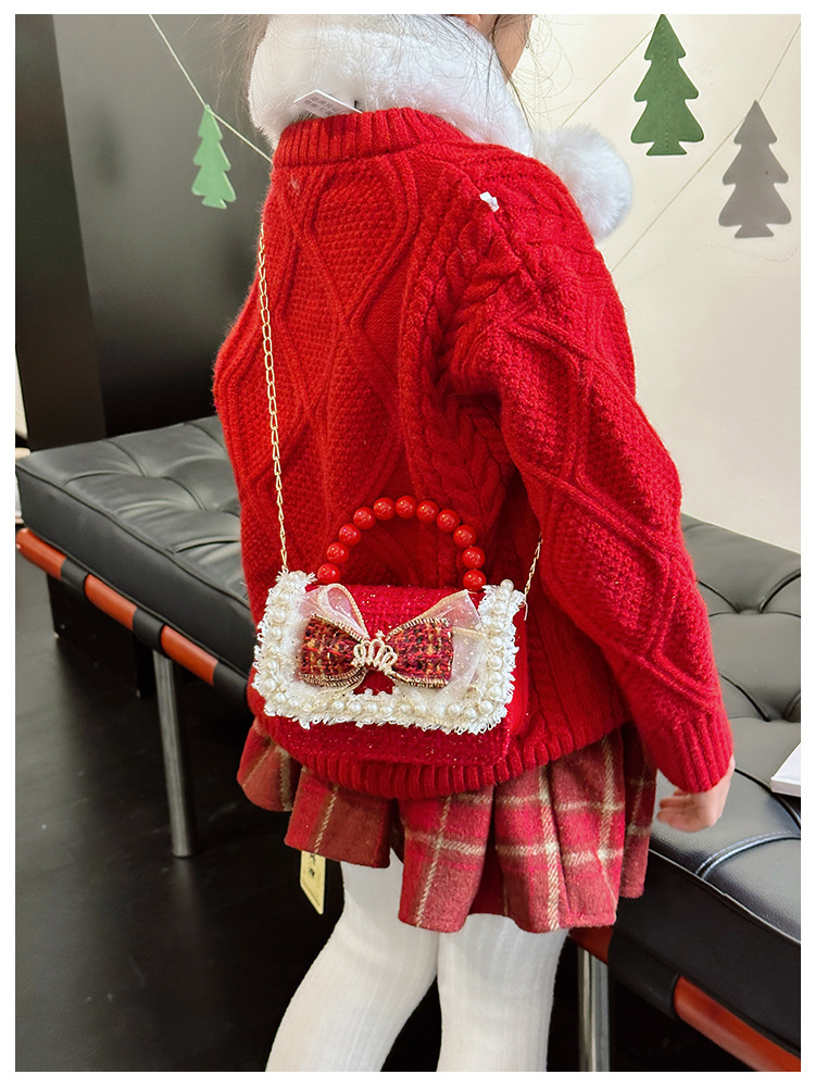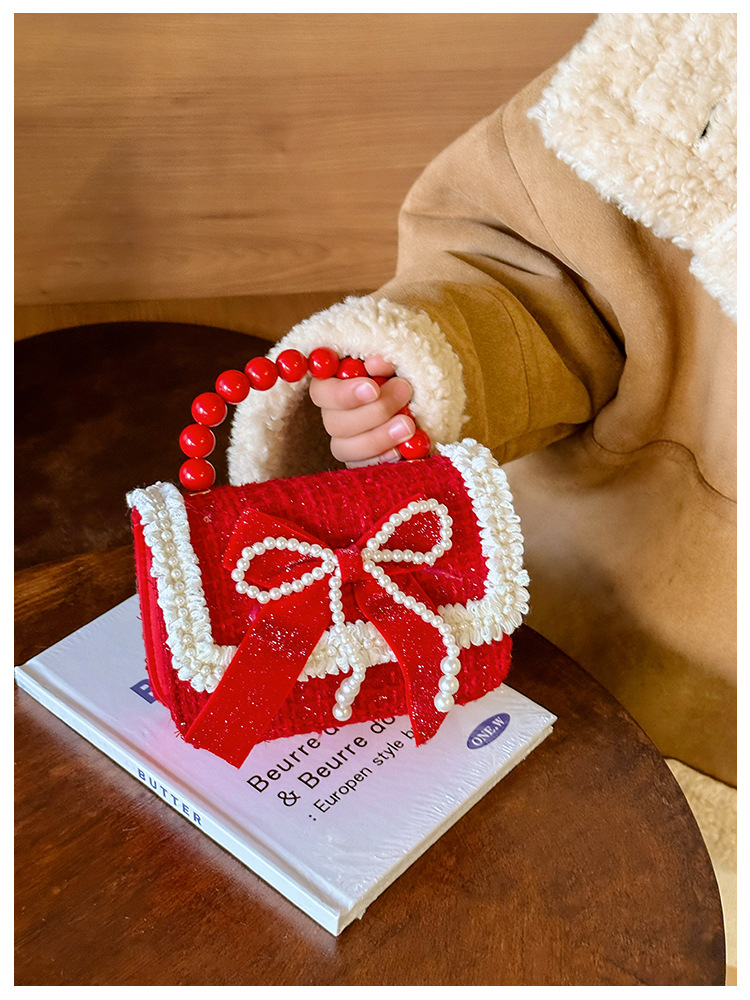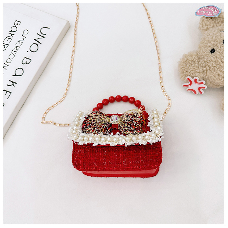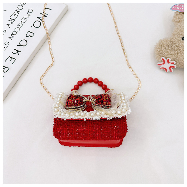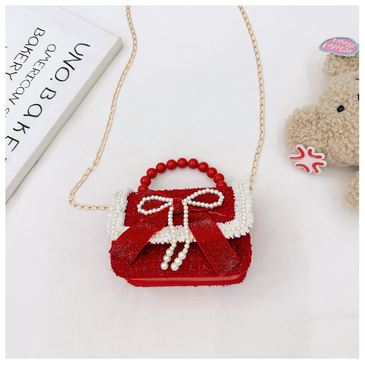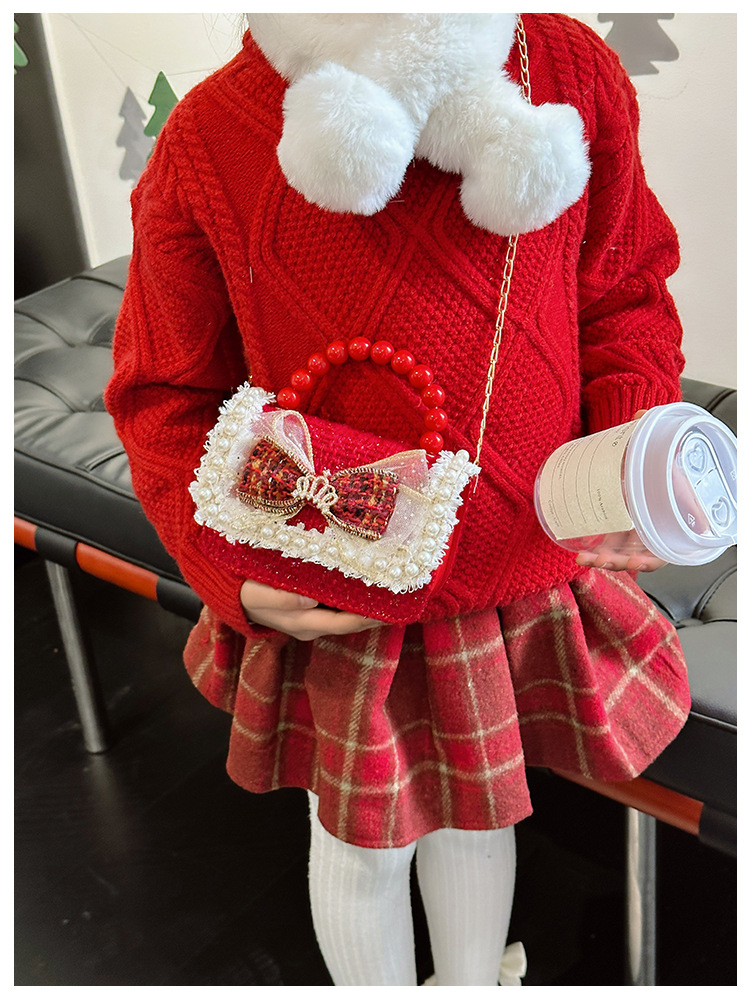 Año Nuevo gran bolso cuadrado rojo para niños bolso de perla bebé lindos bolso de cadena de arco bolso de cambio de niñas
