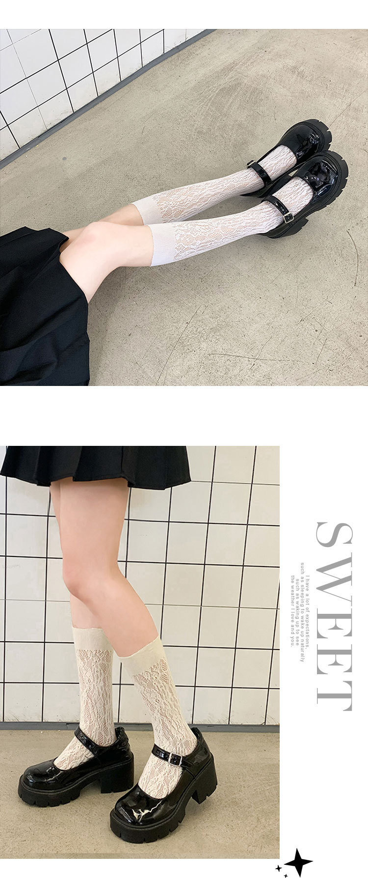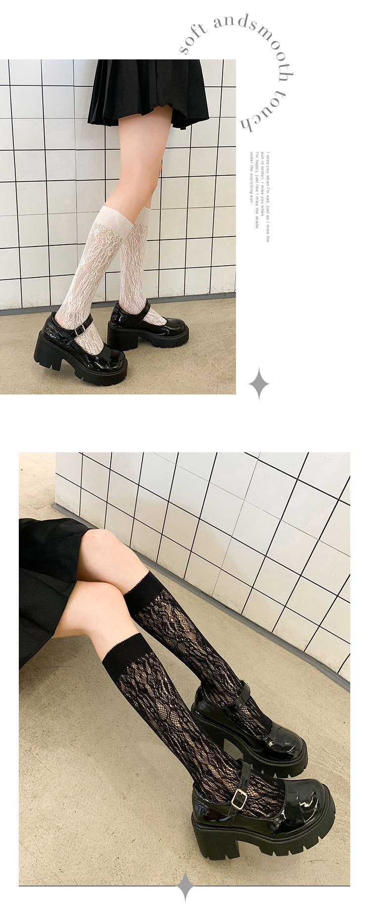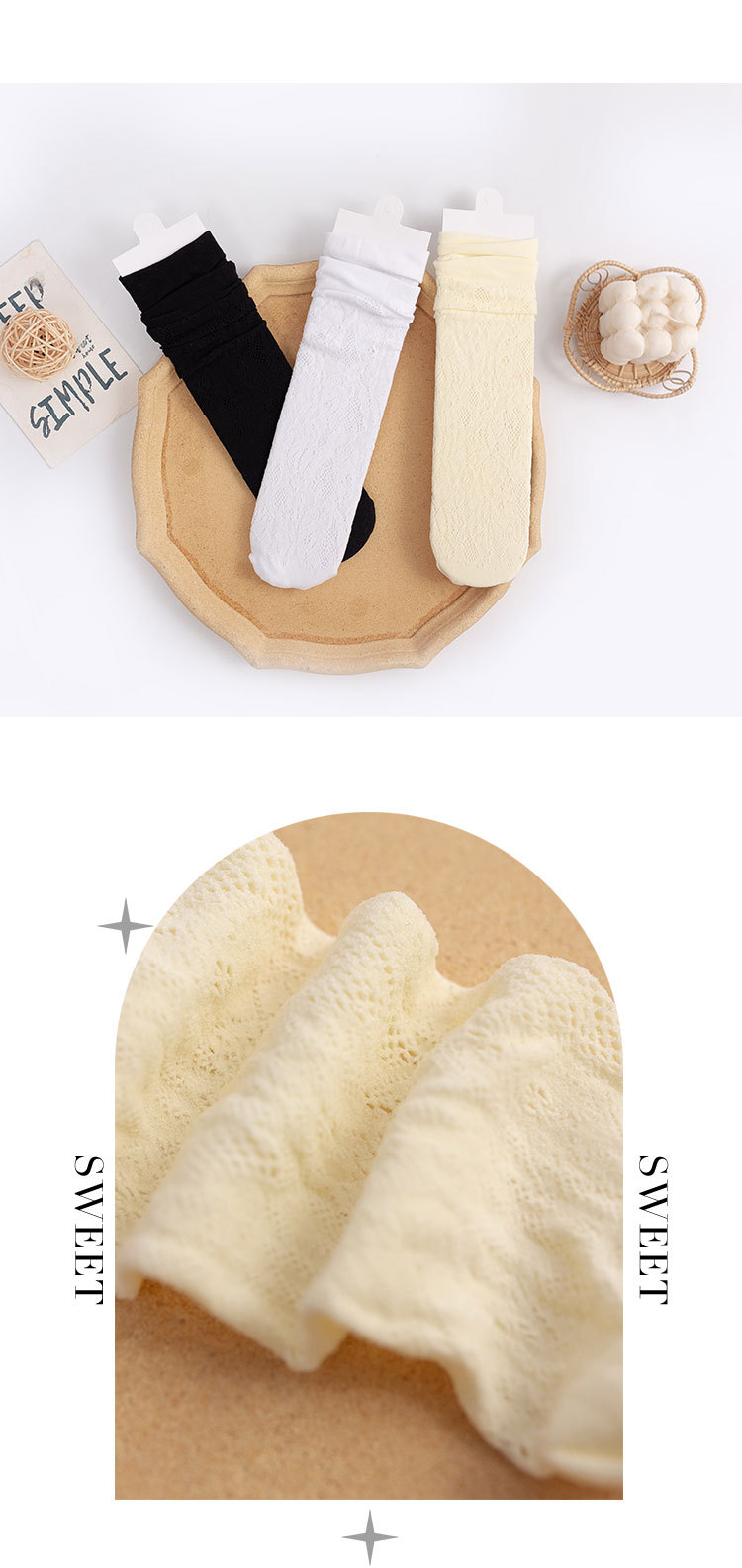 Calcetines de mujer de verano Delgado transpirable color sólido Lolita ratán flor pila calcetines negro y blanco calcetines de pantorrilla