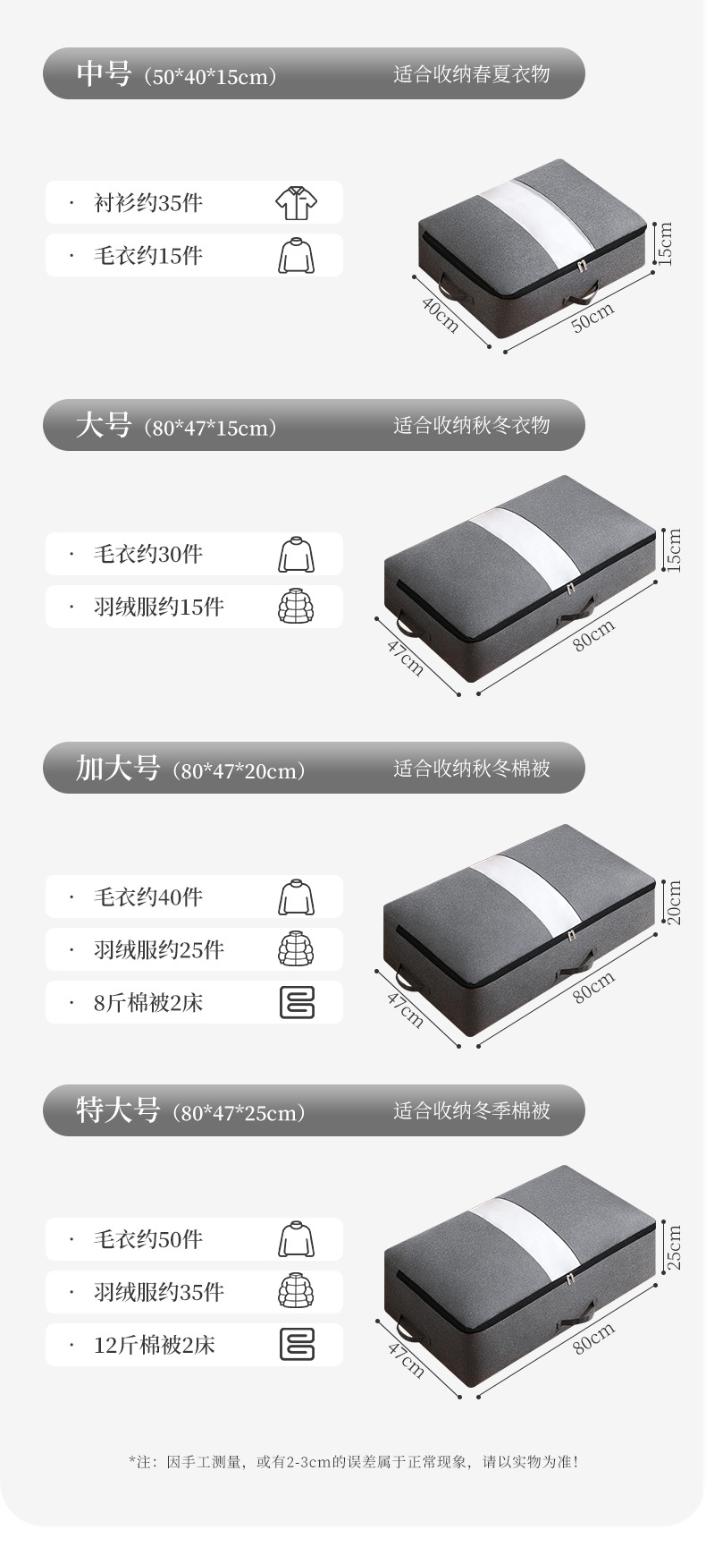 | Colores | Medio 50*40*15,Tamaño grande 80*47*15,Aumentar 80*47*20,Extraordinario 80*47*25 |