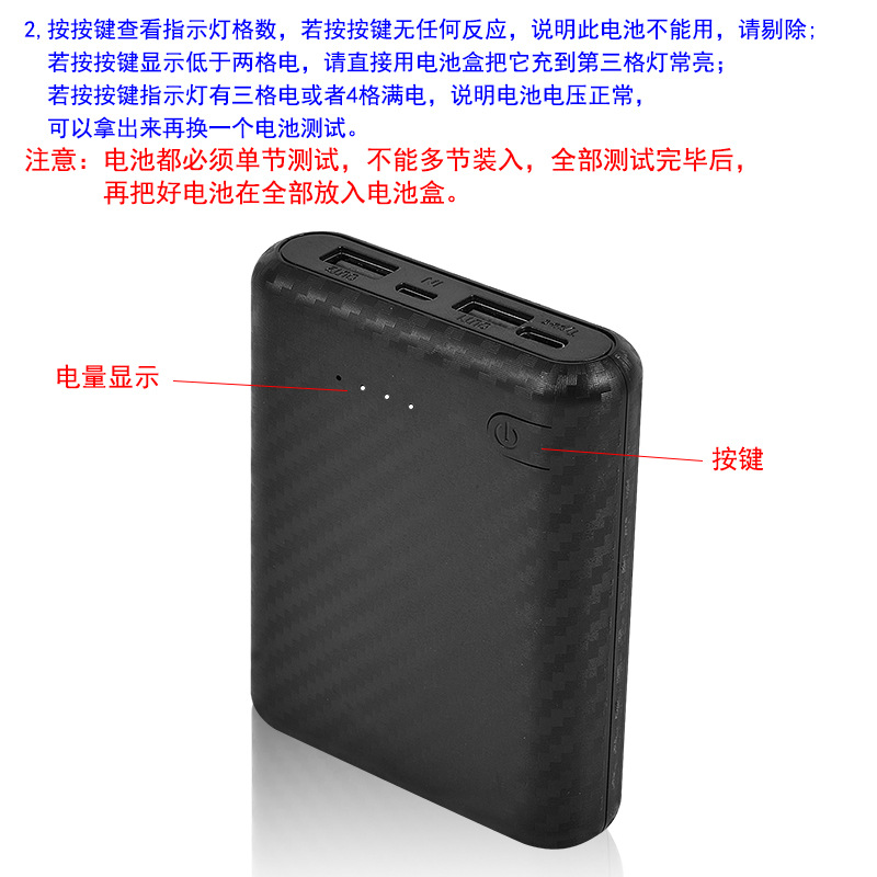 电量显示:4级指示灯电量显示,按照电压计算法计算,请使用性能比较高的,电压稳定的电池。如果电池太差会造成压降过大,指示灯电量就会掉得快,会导致输出都停留在第一或第二个电量。主板非工作状态智能自动关机