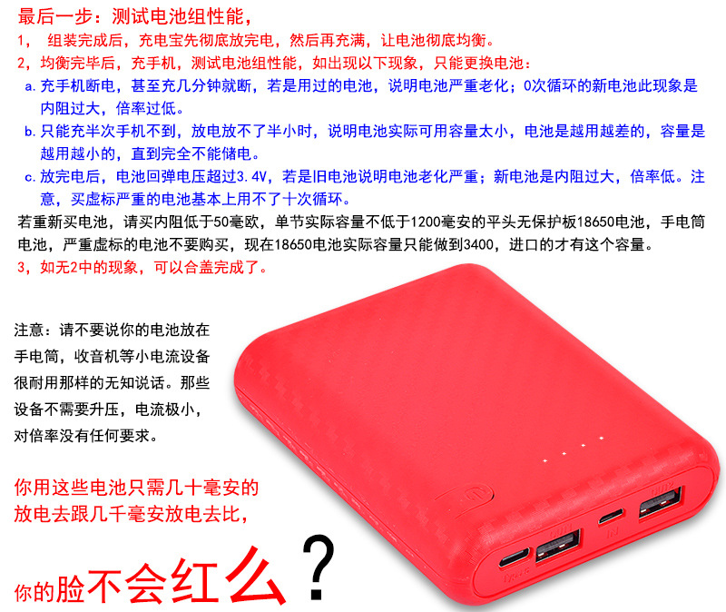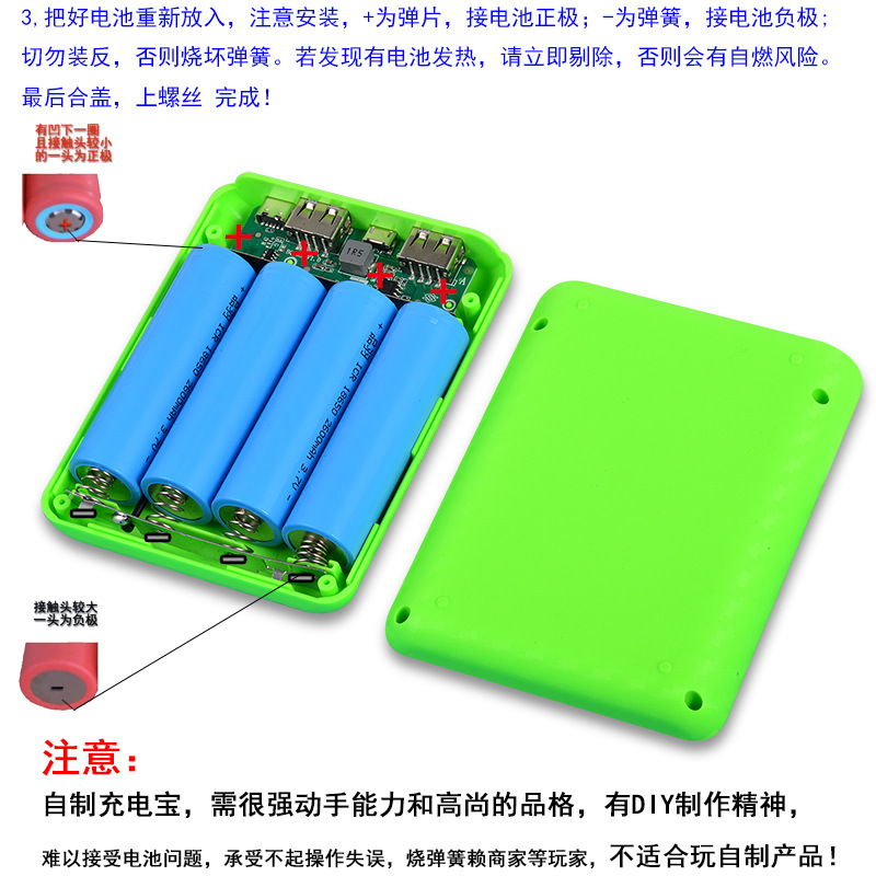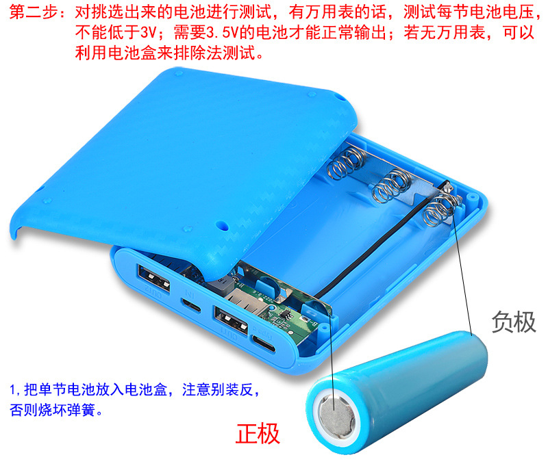 电池类型:3.7V18650电池(平头,无保护板,内阻低于50毫欧,1C放电倍率,每节电压必须在3.3-4.2V之间),不可使用尖头电池,不支持改装或放入其他不符合要求的电池!)