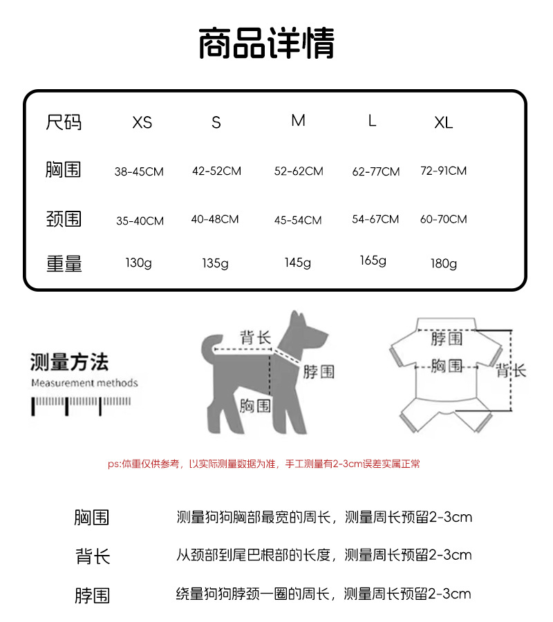 | Especificaciones (largo * ancho) | XS (busto 38-45cm),S (busto 42-52cm),M (busto 52-62cm),L (busto 62-77cm),XL (busto 77-91cm) |