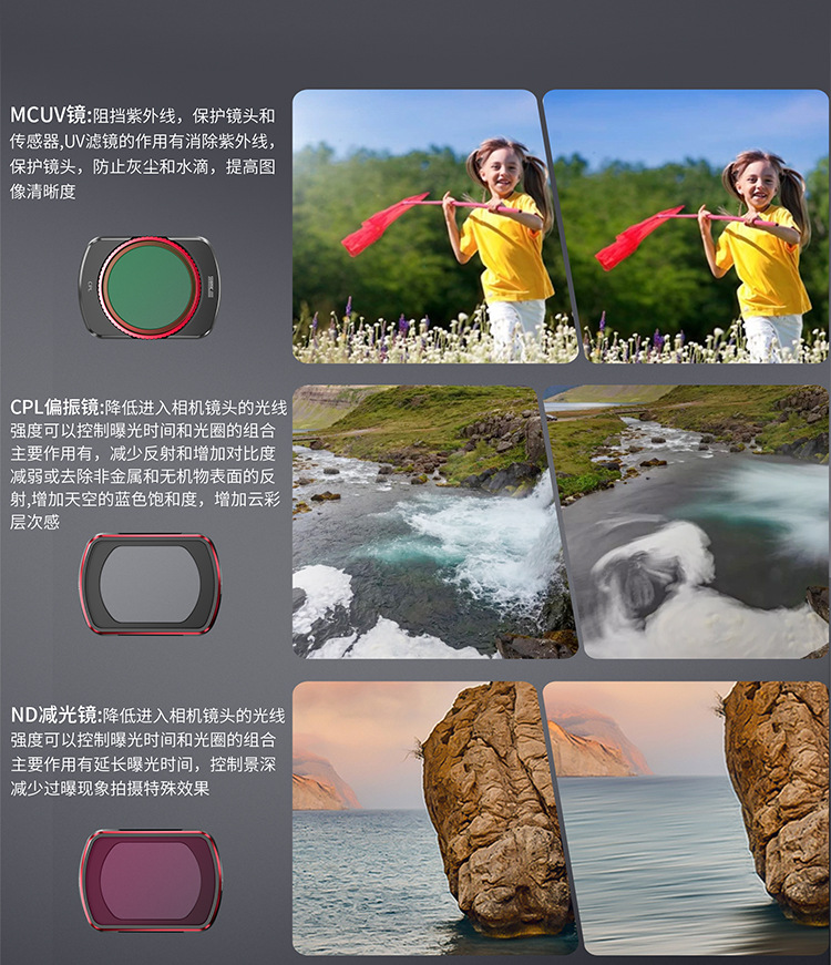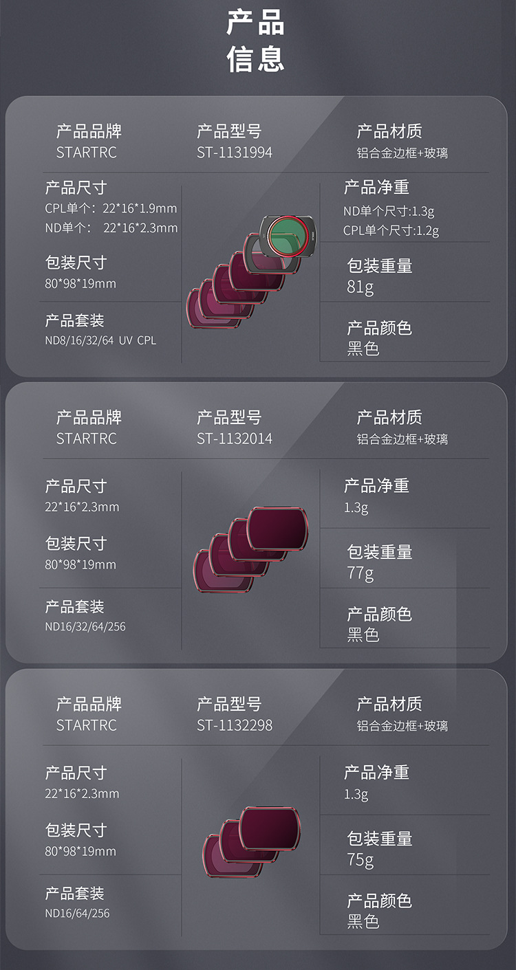 | Color | Seis piezas CPL ND8 16 32 64 256,ND16 de tres piezas nd64 nd256,Cuatro piezas ND16 ND32 ND64 ND256,CPL único,Solo espejo Starlight,Paquete individual UV |
