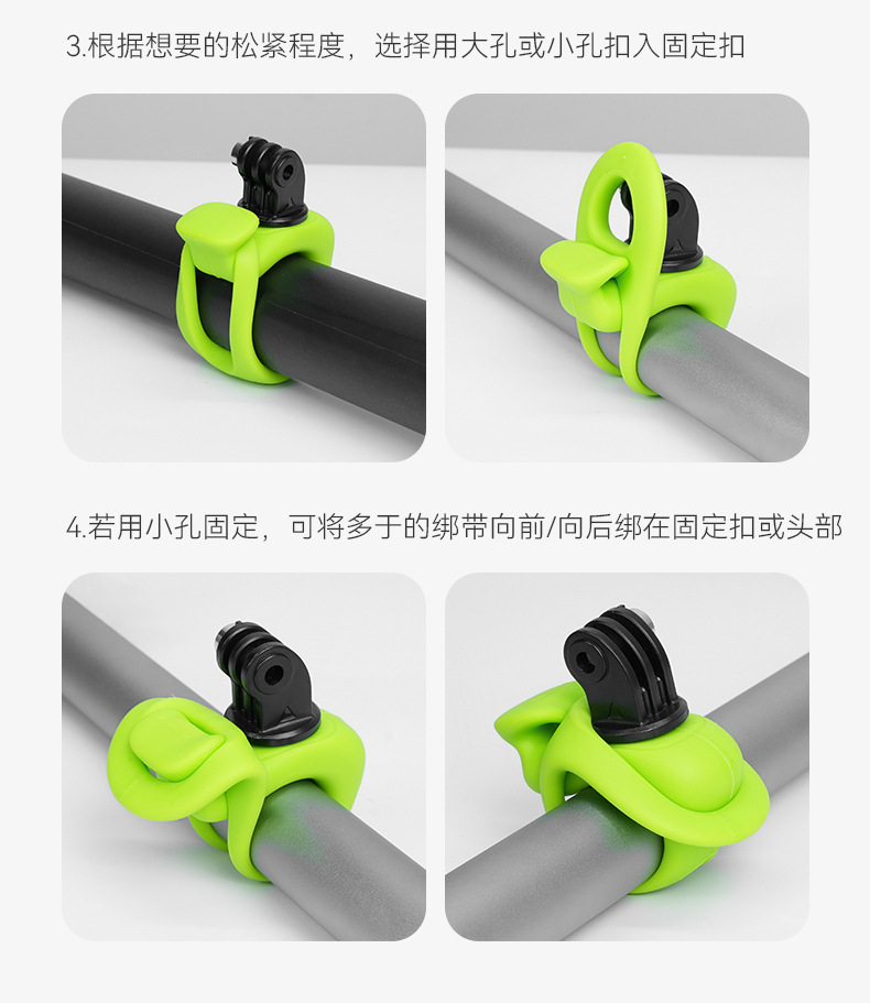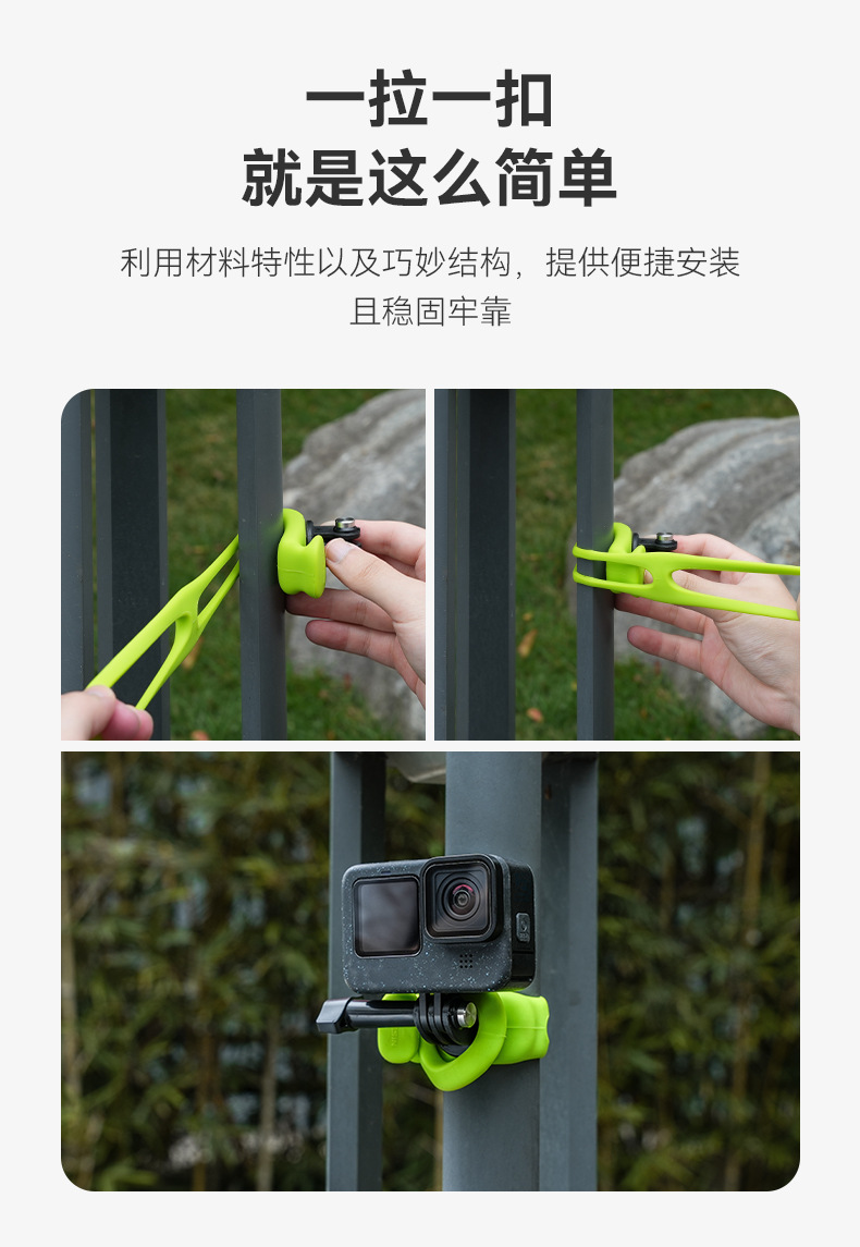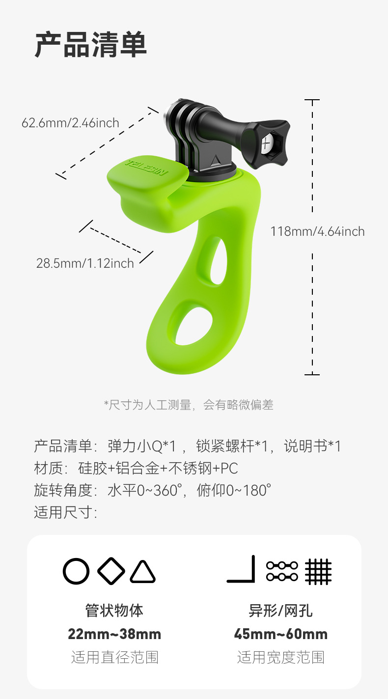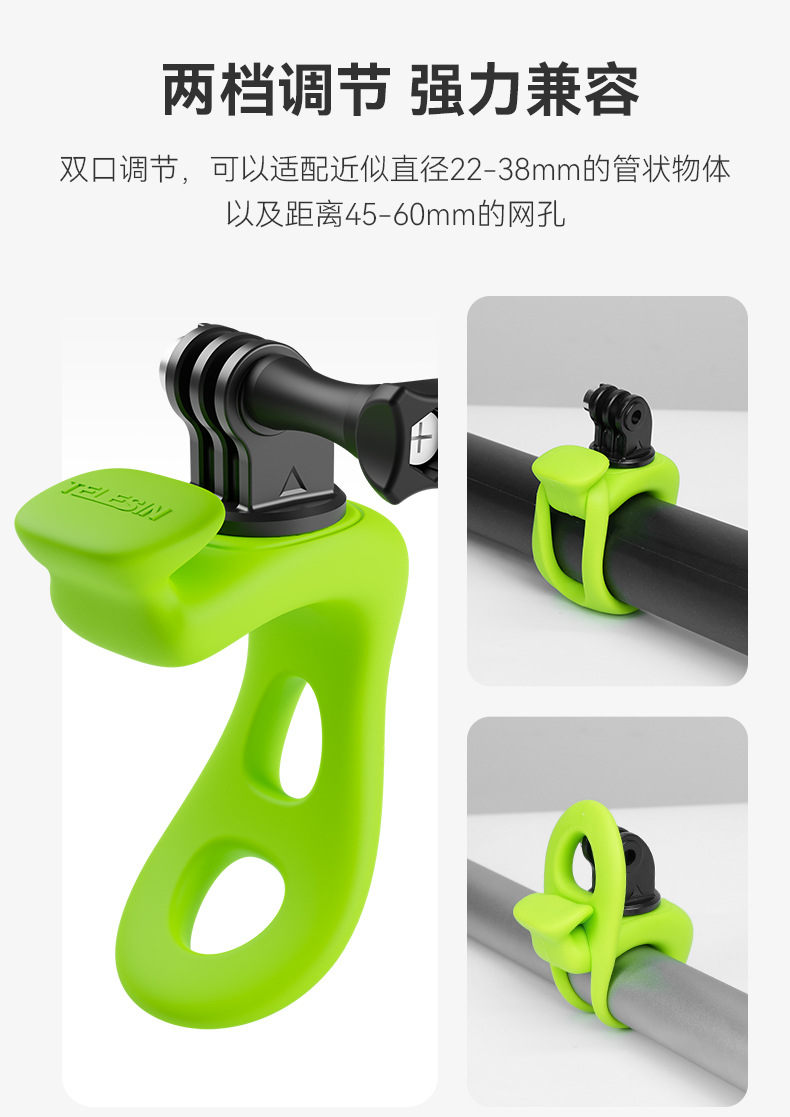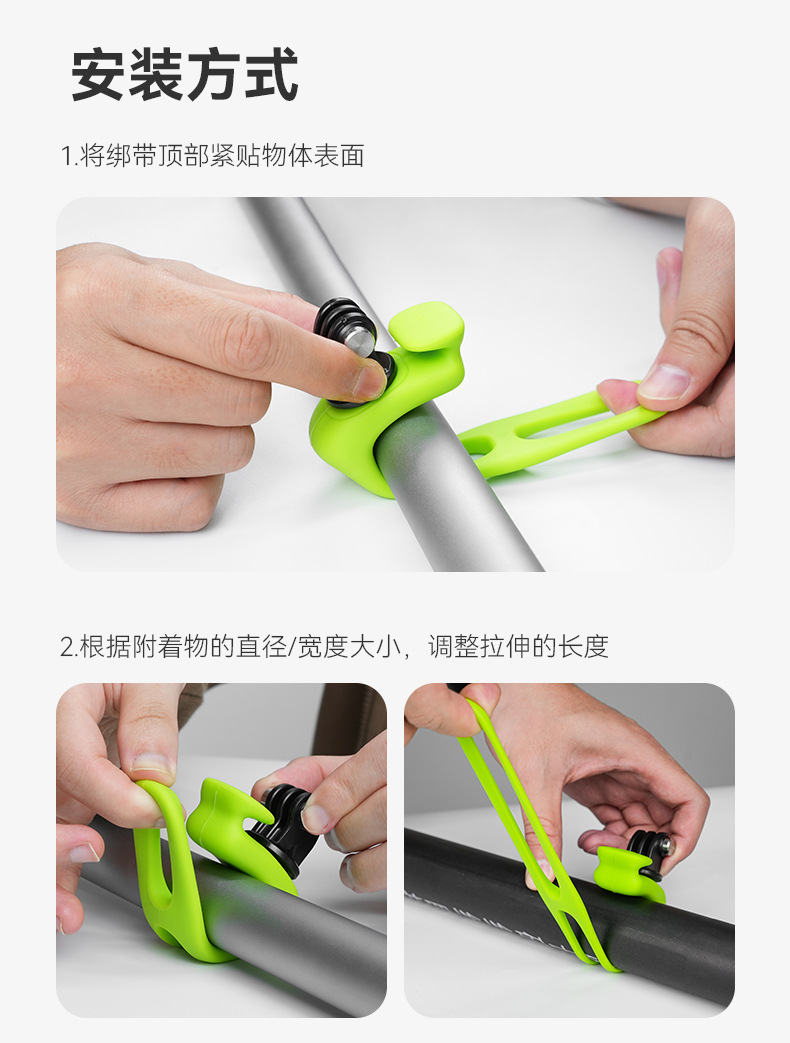 1、高弹硅胶,双孔设计,帮助安装在尺寸不一的物体表面,获得各种刁钻机位;
