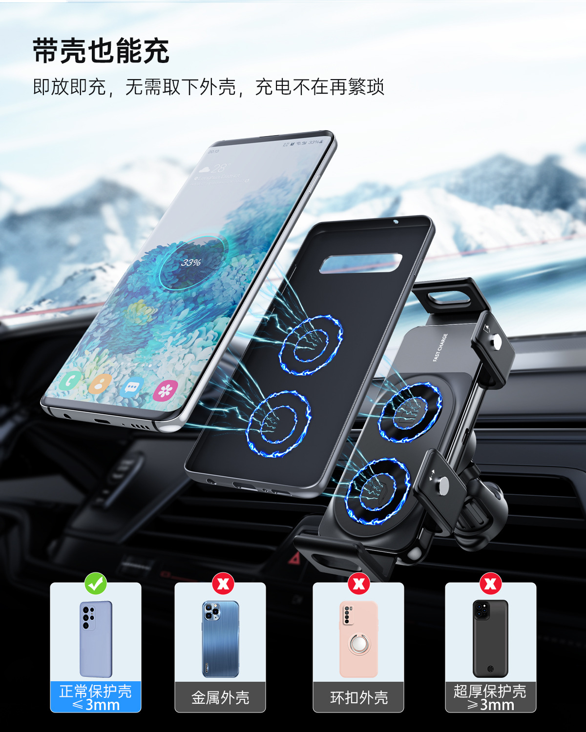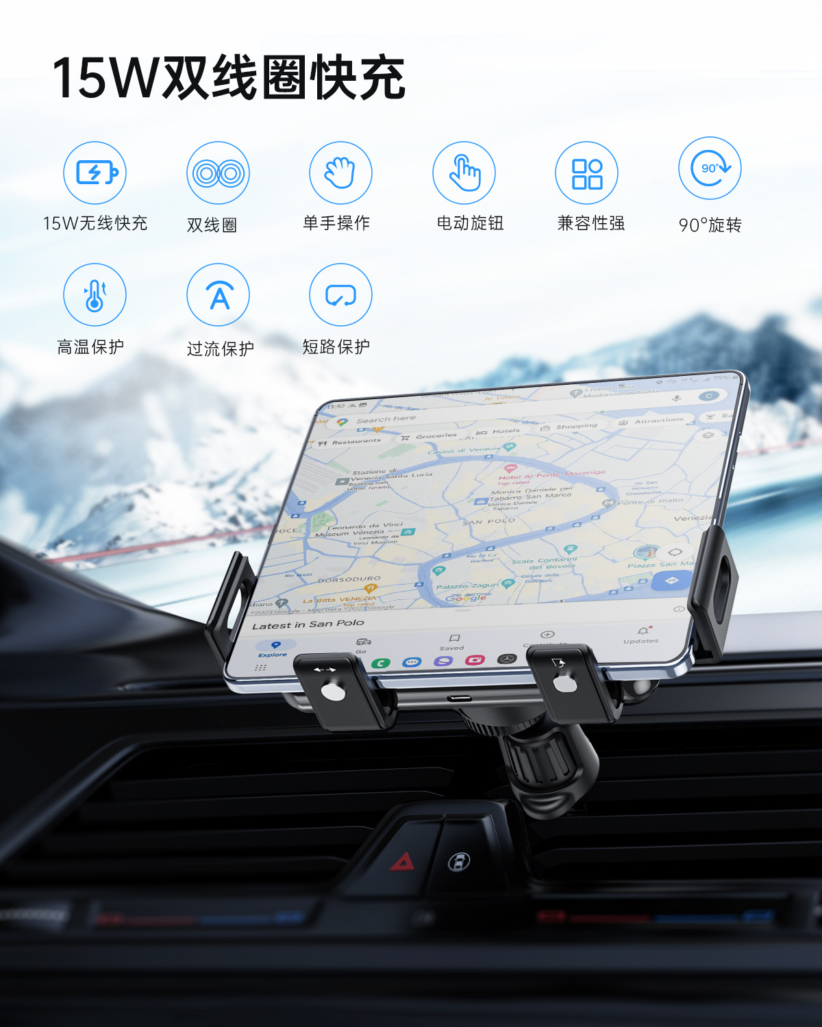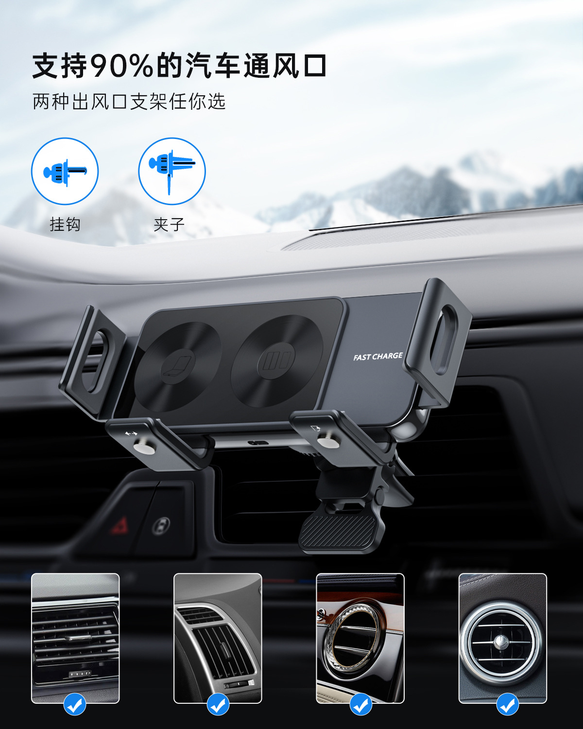 1.快速无线充电车载,夹持导航与无线充电同时进行,为您带来安全便捷的驾乘体验。