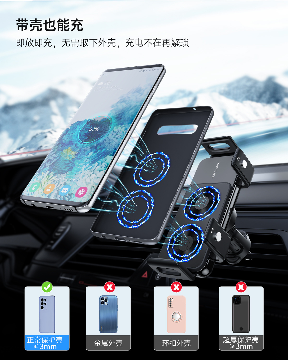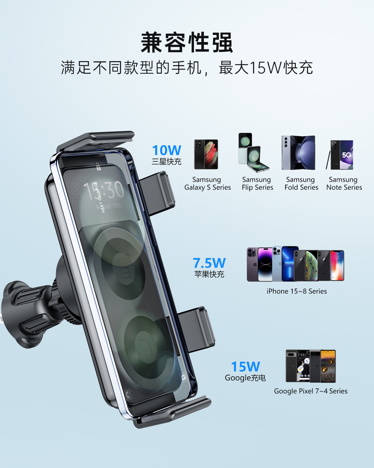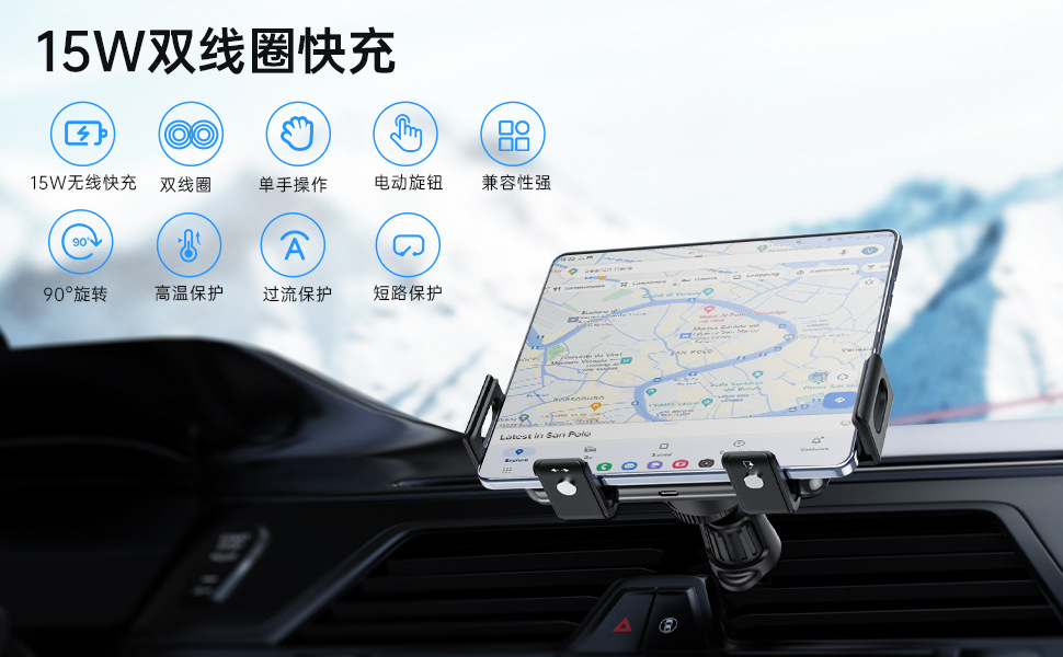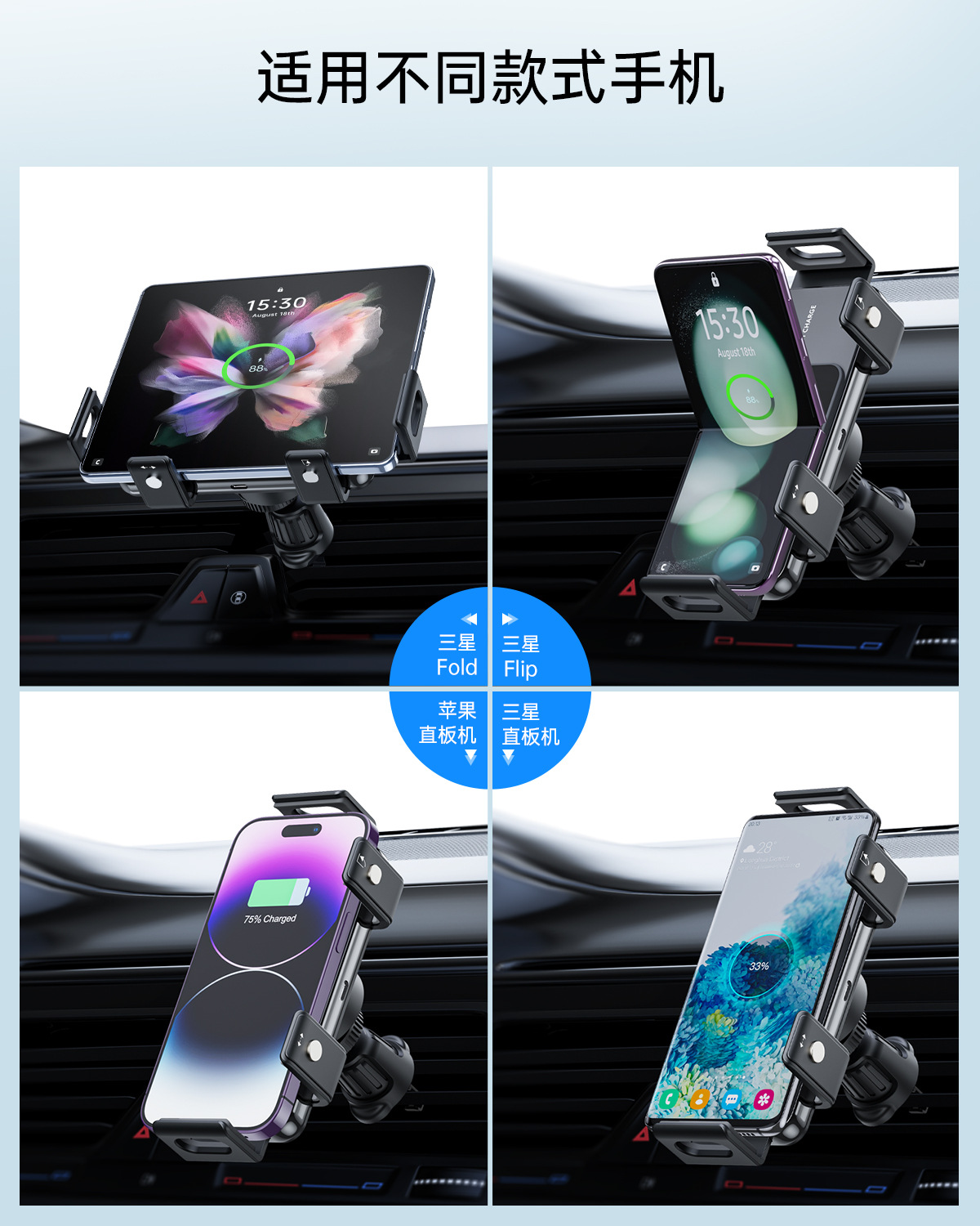 1.快速无线充电车载,夹持导航与无线充电同时进行,为您带来安全便捷的驾乘体验。