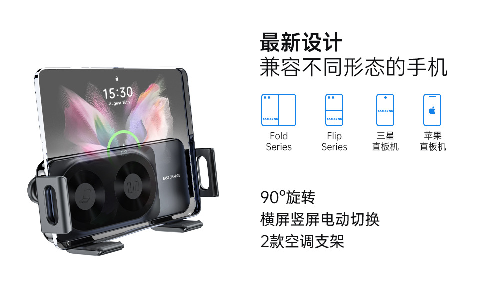 2.双线圈设计,左侧线圈为三星Galaxy Flip专用,中间线圈为Fold和普通直线手机水平使用。