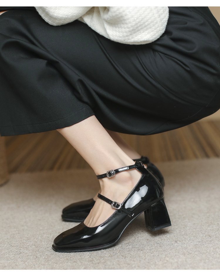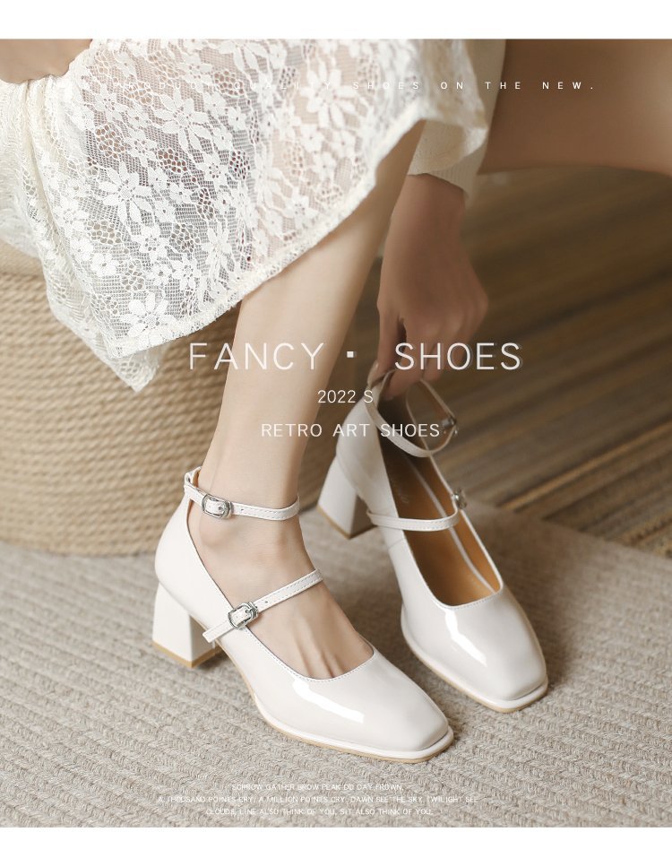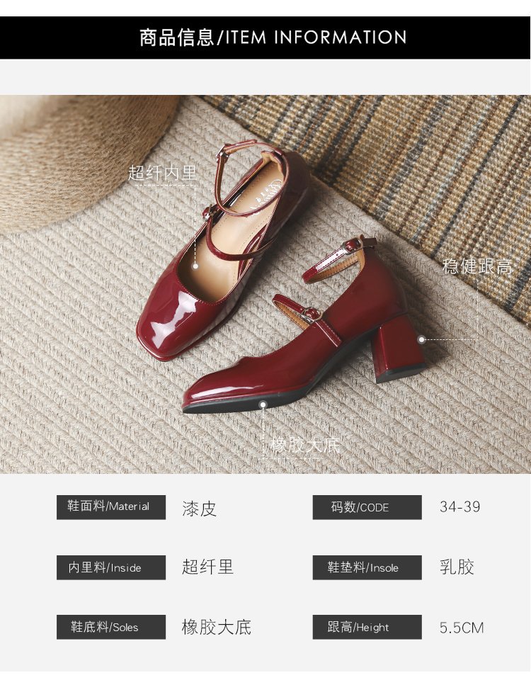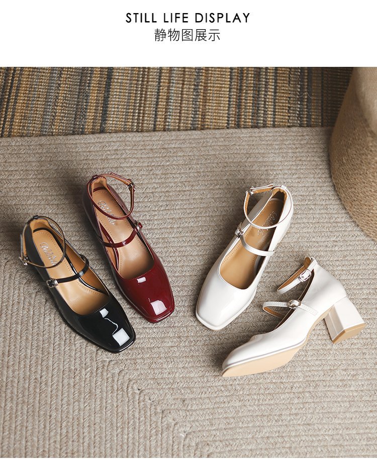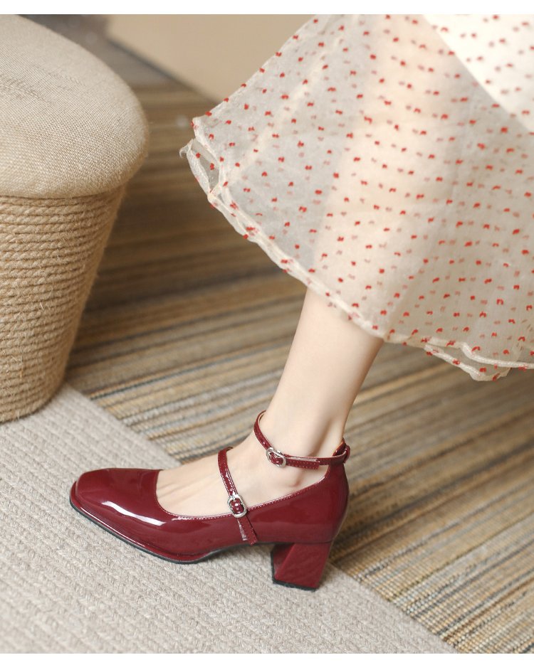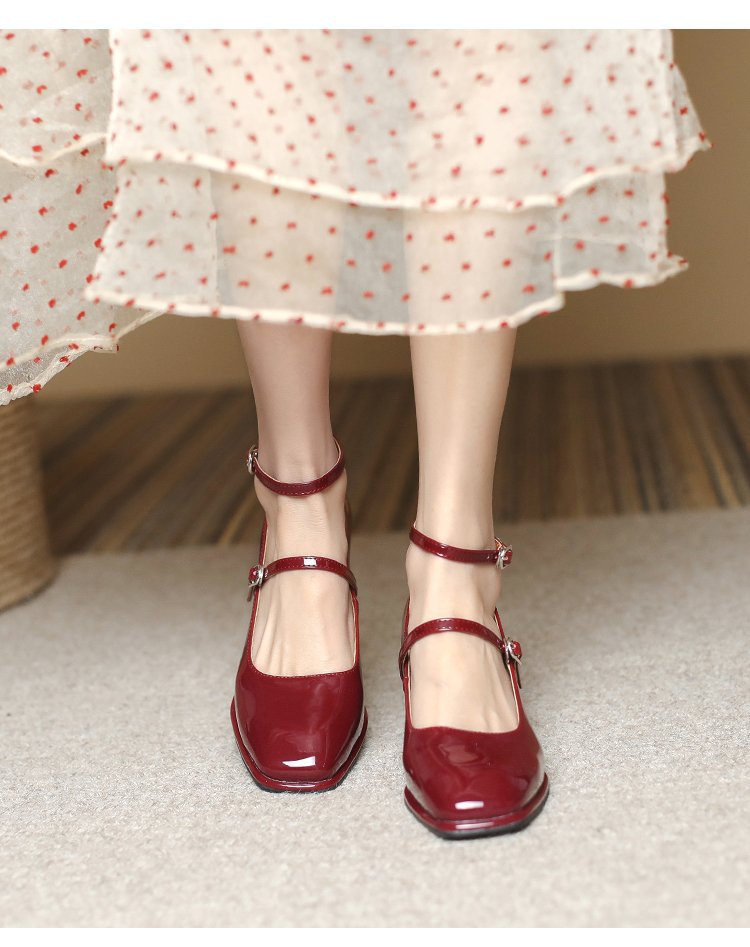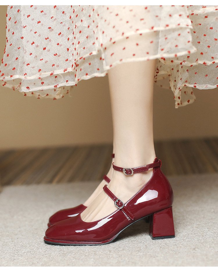 Zapatos de cuero de charol de tacón grueso retro zapatos de cuero pequeños 2023 primavera nueva hebilla roja de tacón alto Mary Jane zapatos de mujer