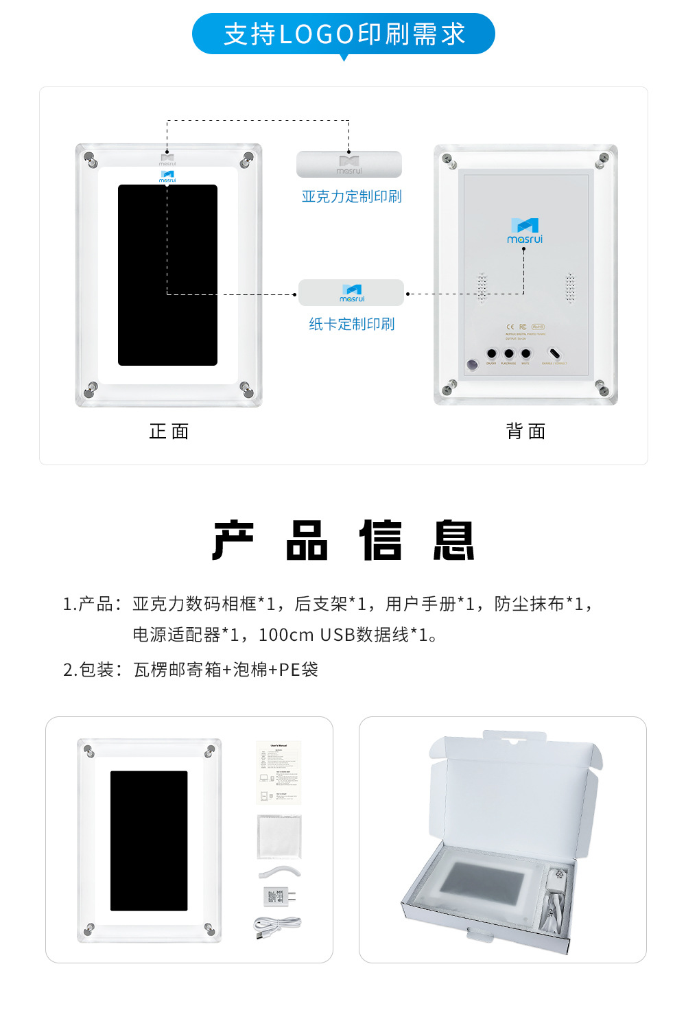| Lista de embalaje | Marco acrílico * 1, soporte trasero * 1, manual * 1, trapo a prueba de polvo * 1, adaptador * 1, cable USB de 100cm * 1 |