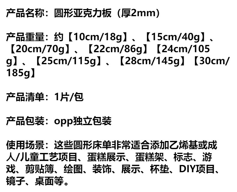 | Especificaciones | Redondo-Diámetro 10cm,Redondo-Diámetro 15cm,Redondo-Diámetro 20cm,Redondo-Diámetro 22cm,Redondo-Diámetro 24cm,Redondo-Diámetro 25cm,Círculo-Diámetro 28cm,Redondo-Diámetro 30cm |