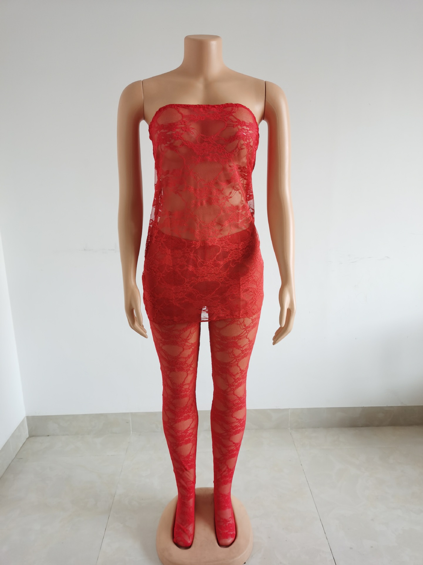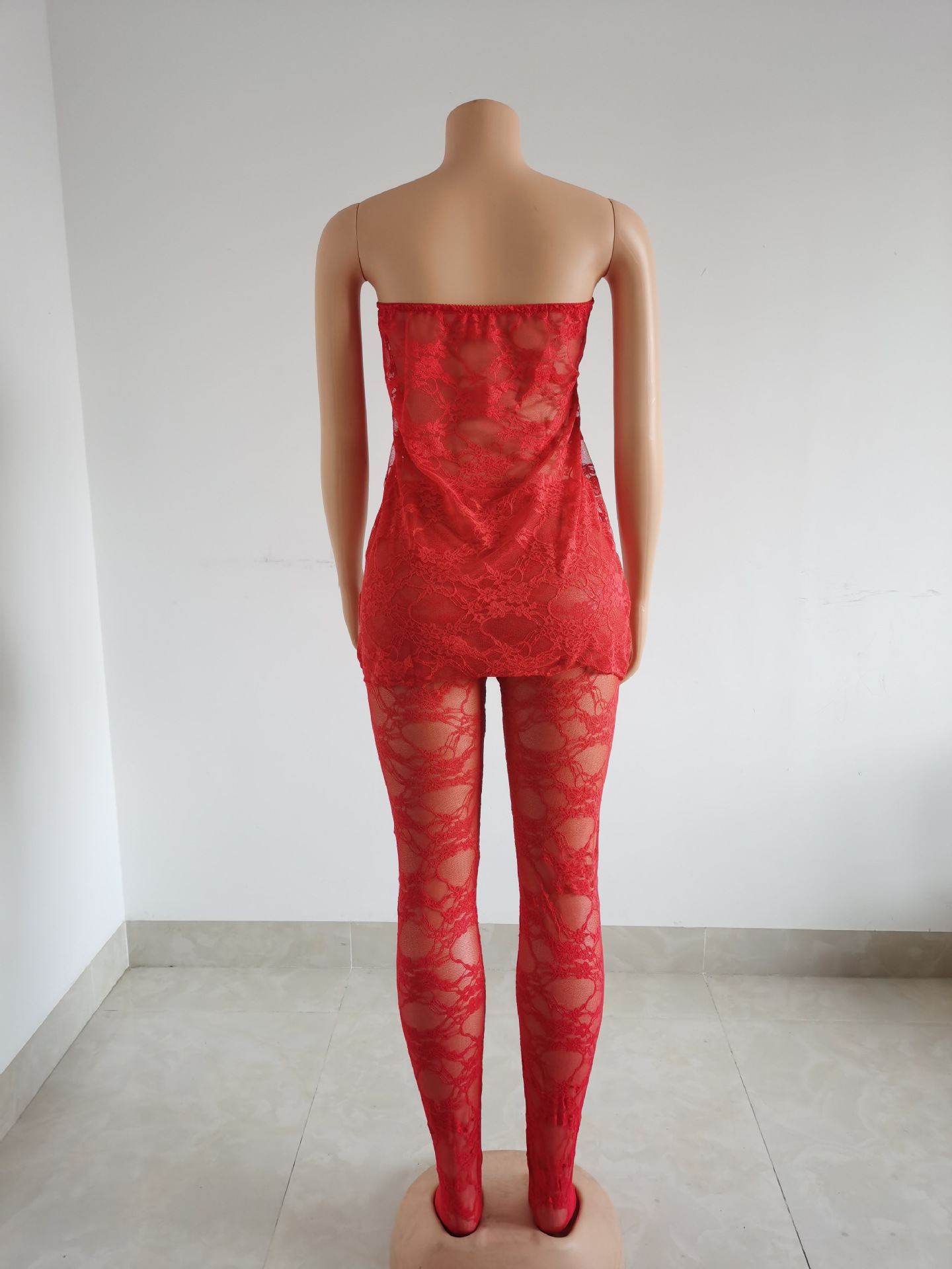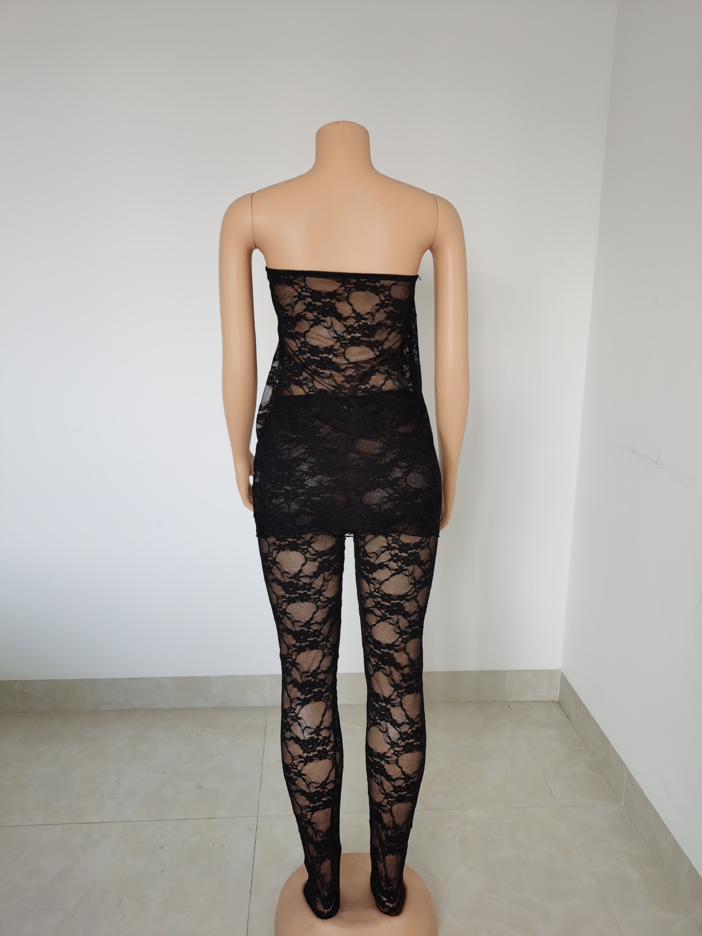 FF1304 mujeres europeas y americanas sexy encaje hueco perspectiva envuelto pecho vestido pantalones conjunto de dos piezas