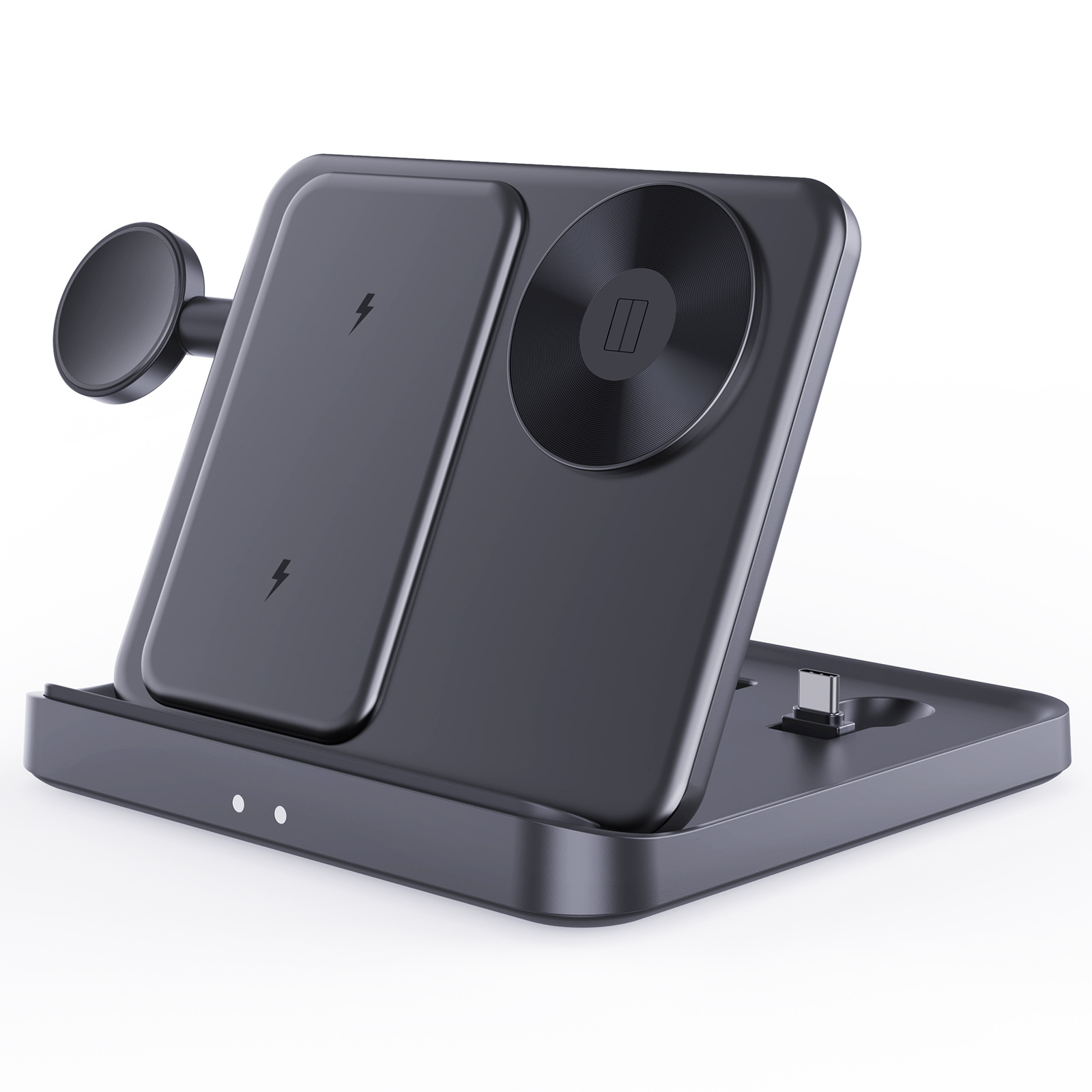 1.这款无线充电器可以支持三星Galaxy Fold系列手机、耳机智能手表同时充电,是三合一形式的无线充电站。
