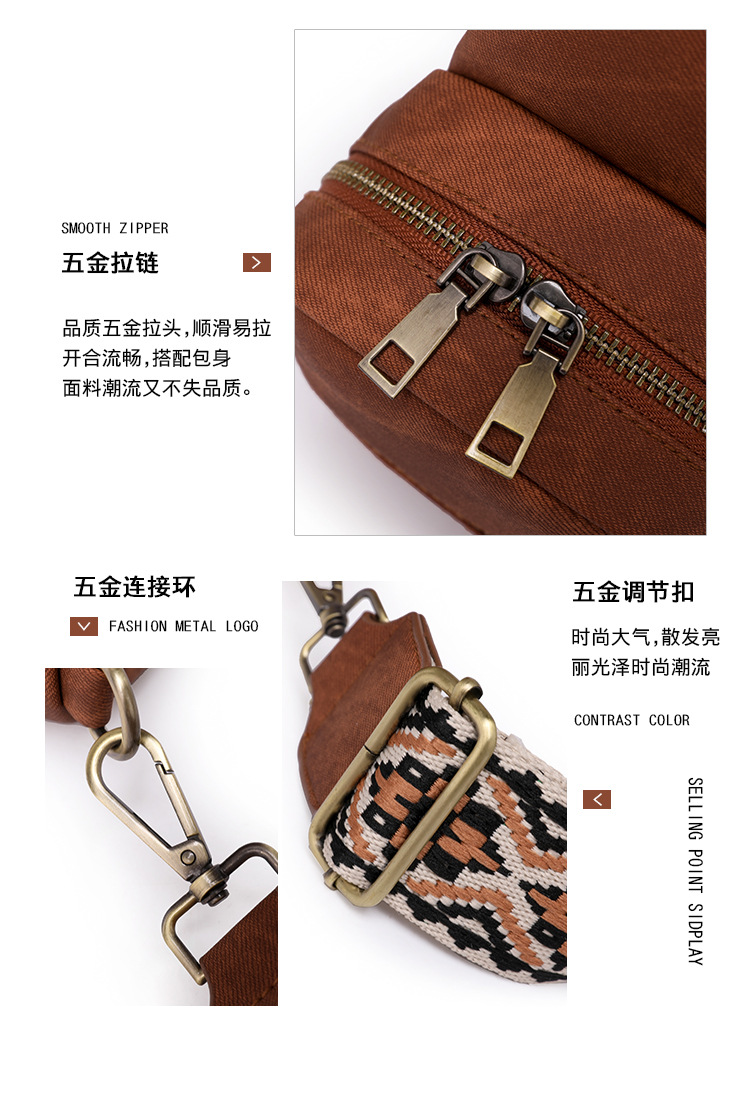 包包顶部使用5CM加粗全金属复古方环,搭配定制编织工艺织带