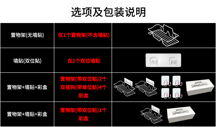 | Color | Estante cuadrado de una sola capa (sin pegatina de pared),Estante de almacenamiento cuadrado de una sola capa + pegatinas de Doble posición + bolsa,Rack cuadrado + pegatinas + caja (1 Pack),Nuevo almacenamiento de una sola capa + pegatinas (tamaño pequeño),Nuevo almacenamiento de una sola capa + pegatinas + en caja (tamaño pequeño),Nuevo almacenamiento de una sola capa + pegatinas (Grande),Nuevo almacenamiento de una sola capa + pegatinas + caja de gran tamaño) |