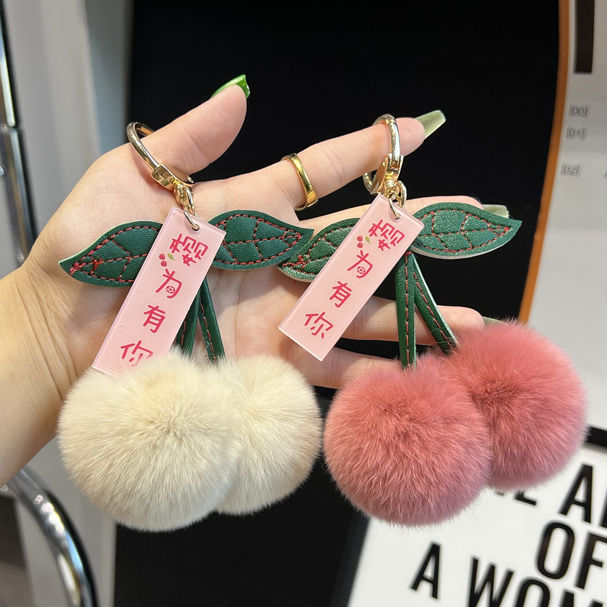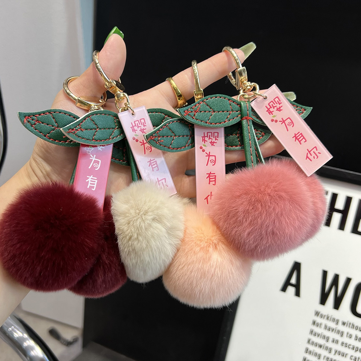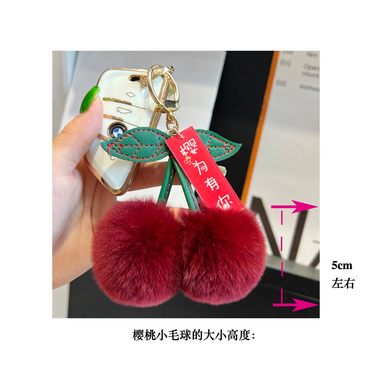 [Cereza para usted] Real Rex conejo piel pequeña cereza coche llavero colgante lindo peluche bolsa adornos