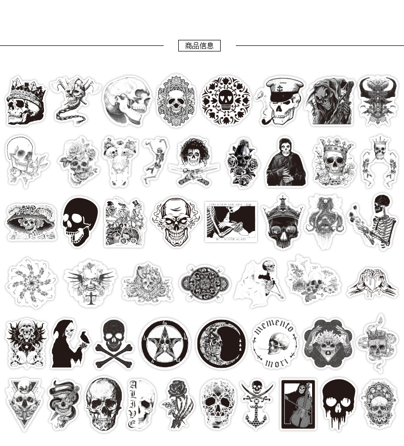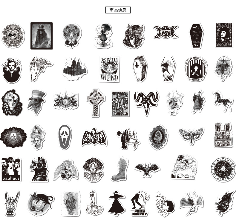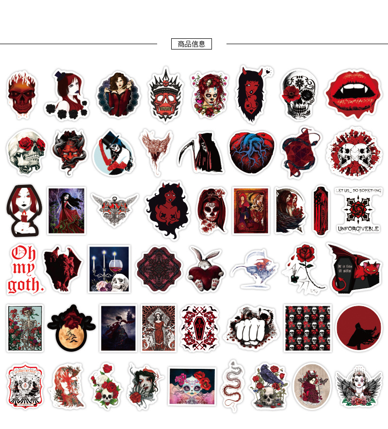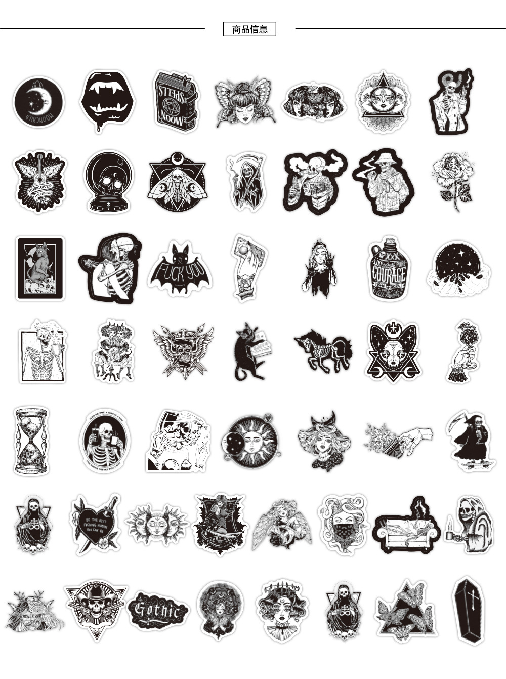 | Colores | 50 hojas-Serie Gothic,50 hojas-Serie de calavera gótica,50 hojas-Serie rojo oscuro gótico,60 graffiti en blanco y negro de estilo europeo y americano,50 hojas-demonio gótico,50 hojas-Pegatina gótica púrpura A,50 hojas-Pegatina gótica púrpura tipo B,50 hojas-Pegatinas góticas oscuras,100 hojas de pegatinas góticas en blanco y negro (exquisito embalaje de tarjetas de papel),100 hojas-pegatinas de graffiti en blanco y negro |