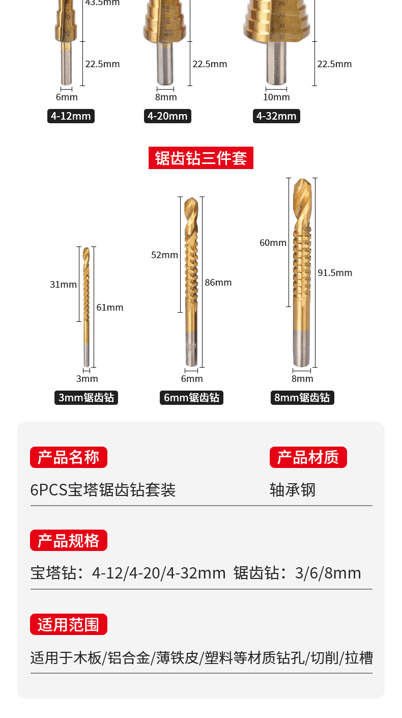 Venta directa de fábrica, juego de 6 brocas de torreta para taladro eléctrico, herramienta perforadora, broca helicoidal con dientes de sierra para ranuras, broca para carpintería