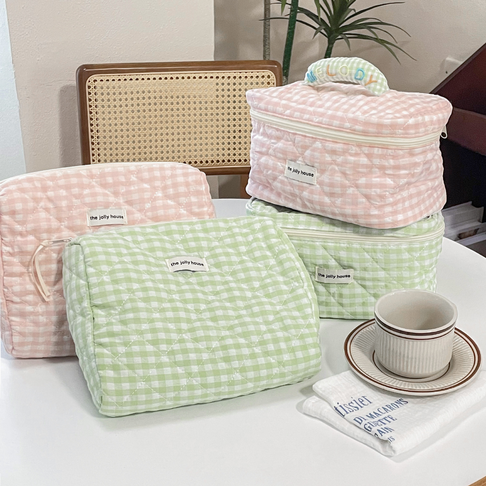 Rosa verde bolsa de cosméticos a cuadros de gran capacidad Corea del Sur ins lindo Portátil Bolsa de almacenamiento de cosméticos de algodón acolchado bolsa de lavado