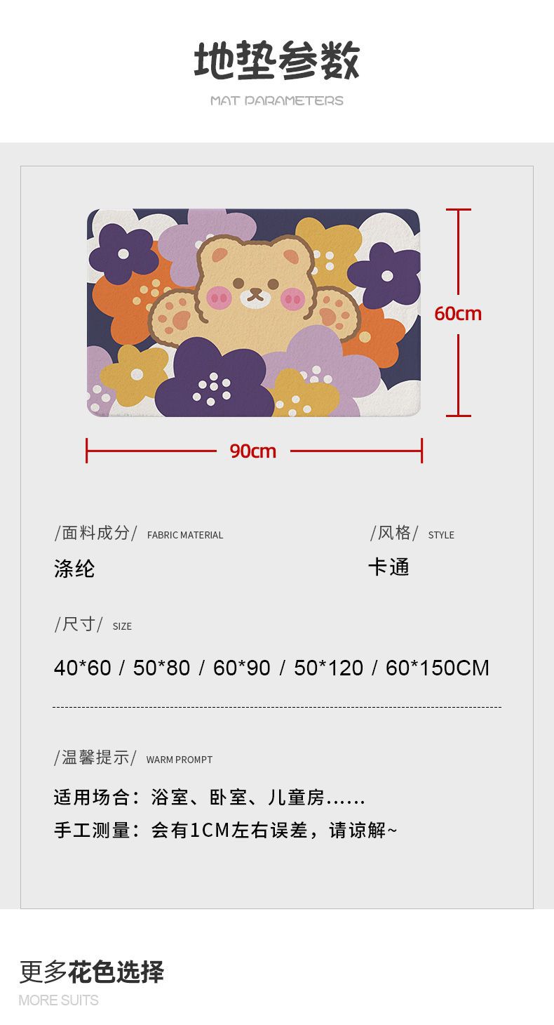 | Tamaño | 40X60cm [lindo oso],50 X80cm [punto de plástico antideslizante],60x90cm [textura suave],50x120cm [grueso y duradero],60 X150cm [manta de cabecera recomendar] |