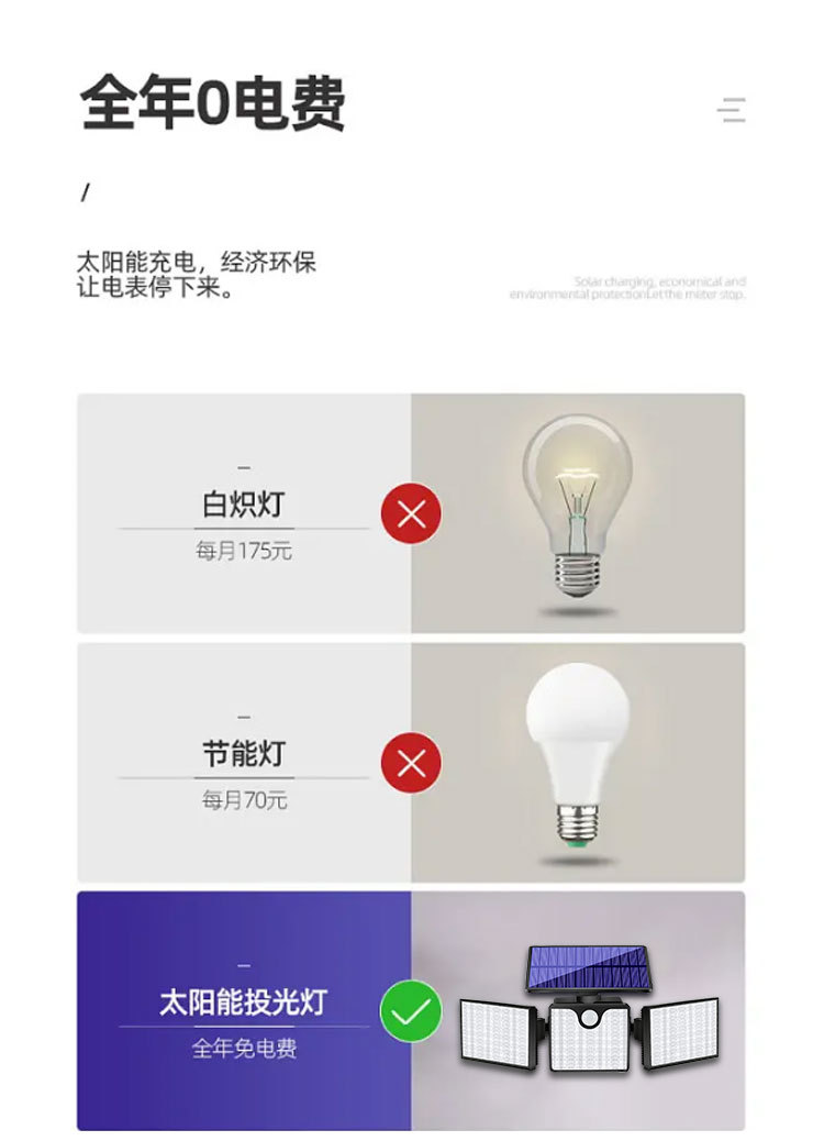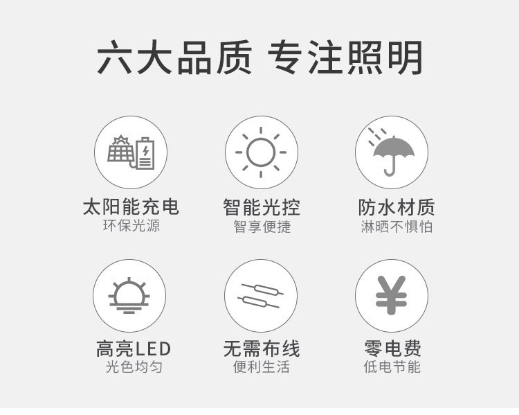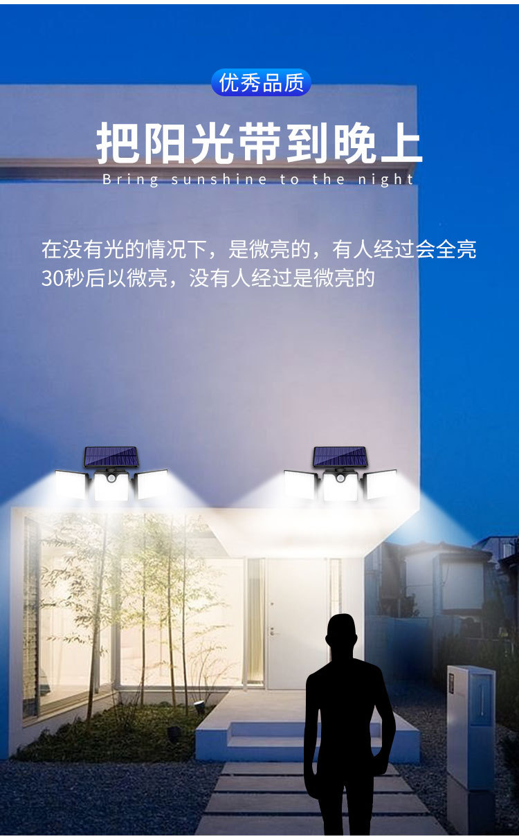 【工作模式】:人体感应+光控(有人经过变为强光,强亮30S,直到人离开感应范围30S后变为弱光