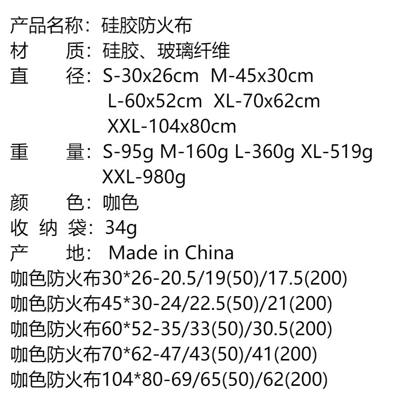 | Colores | [S] Paño ignífugo-30x26cm [espesor 0,8 T],[M] Paño ignífugo-45x30cm [espesor 0,8 T],L】 Paño ignífugo-60x52cm [espesor 0,8 T],[XL] Paño ignífugo-70x62cm [espesor 0,8 T],XXL Tela ignífuga-104x80cm [espesor 0,8 T] |