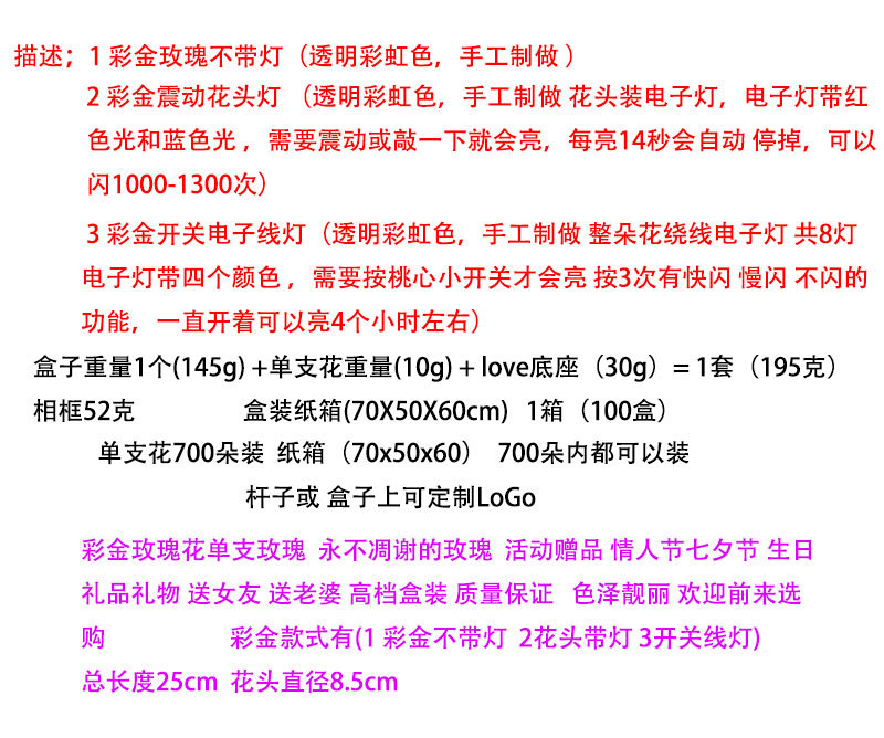 | Especificaciones | Color dorado,Rojo,Rosa roja,Azul,Púrpura,Amarillo,Polvo de color,Negro,Caja plegable transparente,Lámpara de corazón dorado,Lámpara de corazón rojo dorado,Lámpara de corazón rosa rosa dorada,Lámpara de corazón de melocotón azul dorado,Lámpara de corazón púrpura dorado,Lámpara de corazón amarillo dorado,Lámpara de corazón naranja dorado,Lámpara de corazón rosa,Bolso de mano de caja de cielo estrellado,Bolso de mano de caja rosa,Bolso de mano de caja morada,Base de amor,Base de amor,Caja de antorcha pequeña,Lámpara de corazón de melocotón |