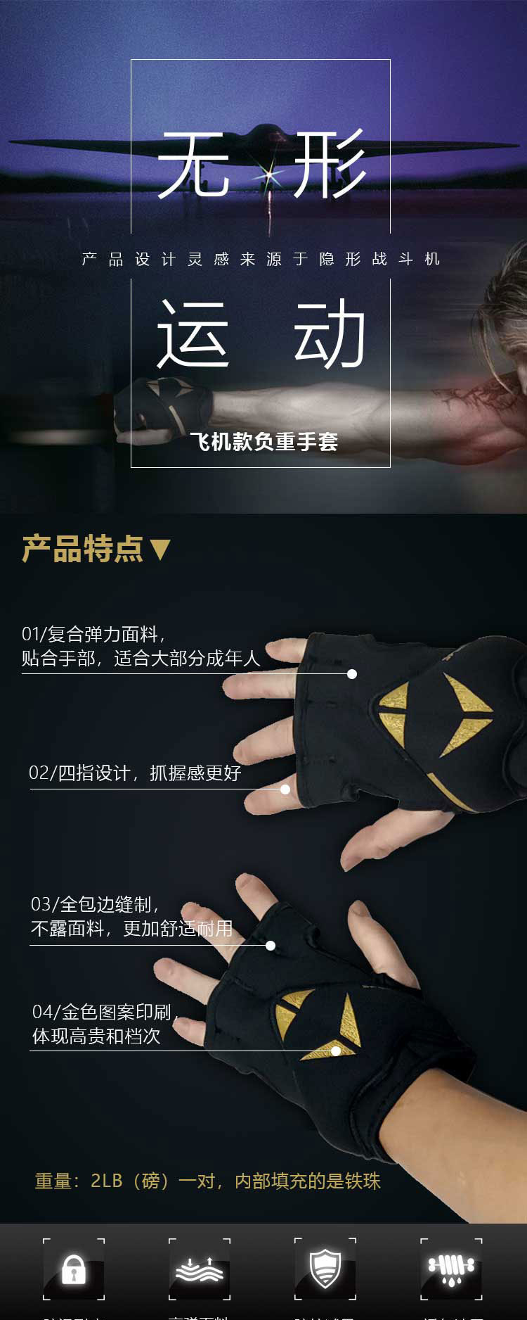 负重手套采用橡胶复合面料,里面填充物为铁砂材质的,戴在手上非常舒适。根据手的形状设计了手指头,使得使用时更加的贴合不松动,是跑步、练瑜伽等健身活动的必备装备。