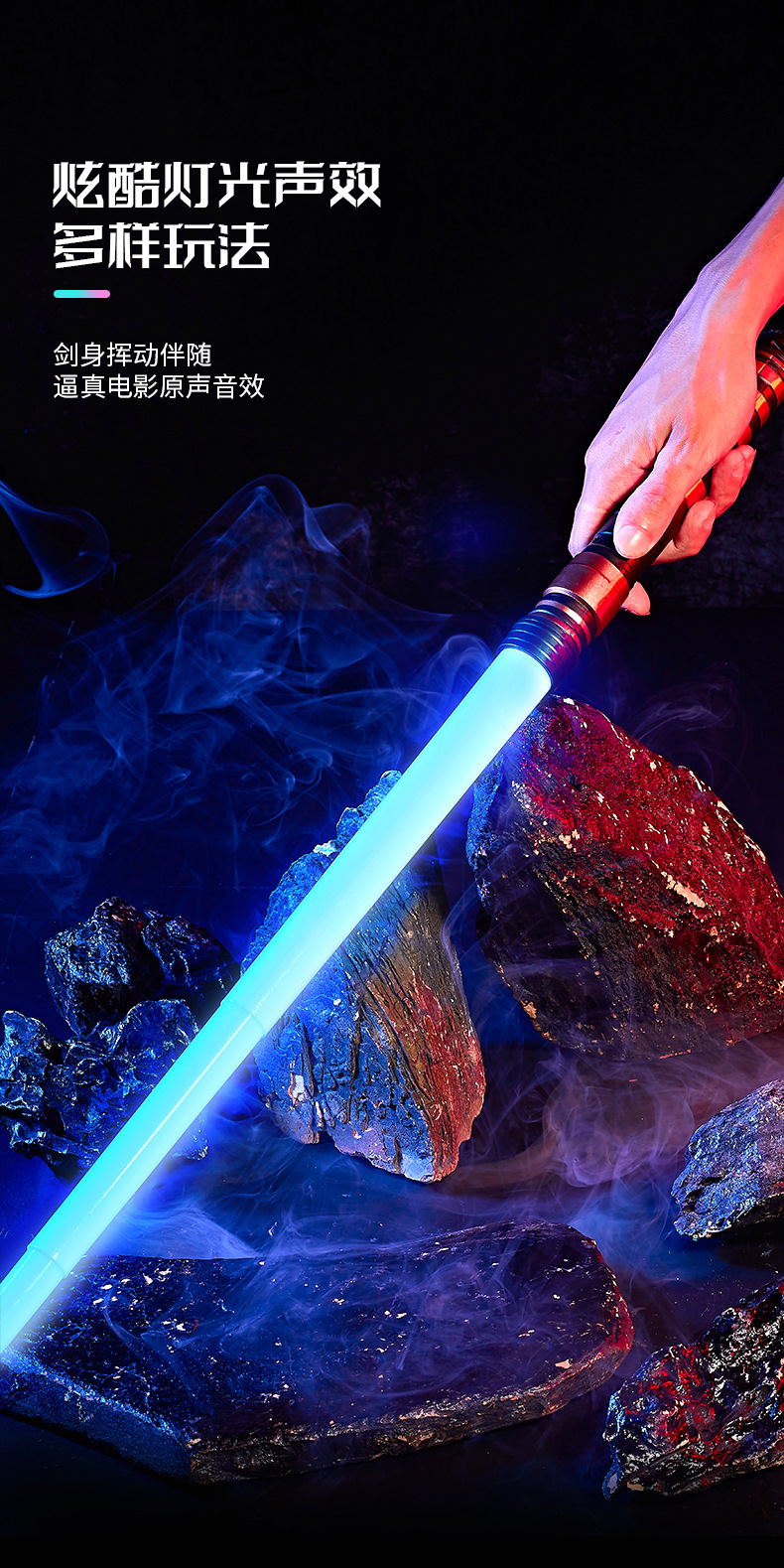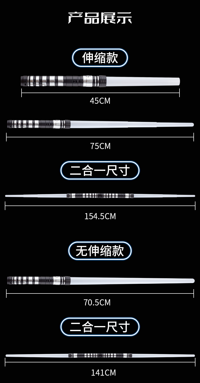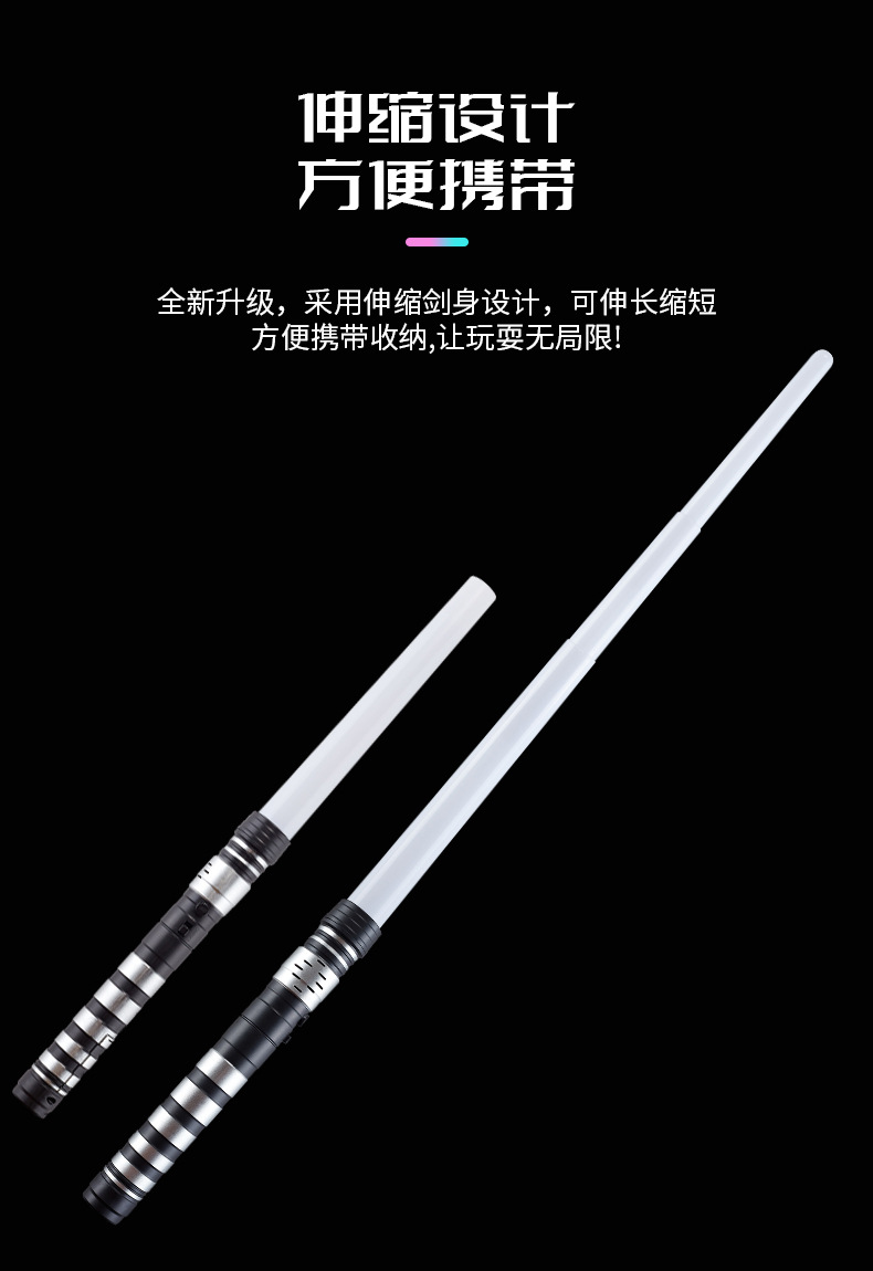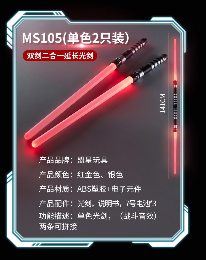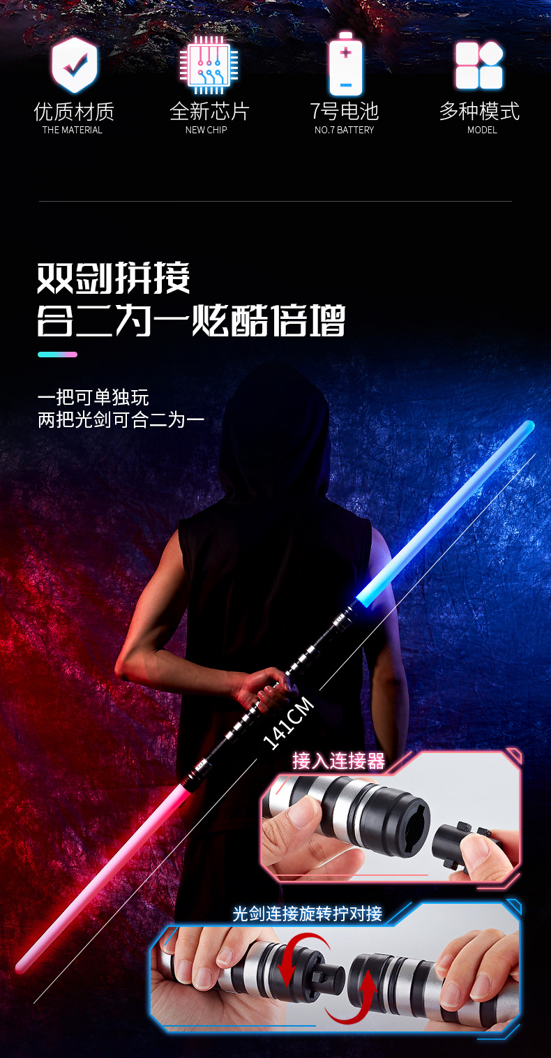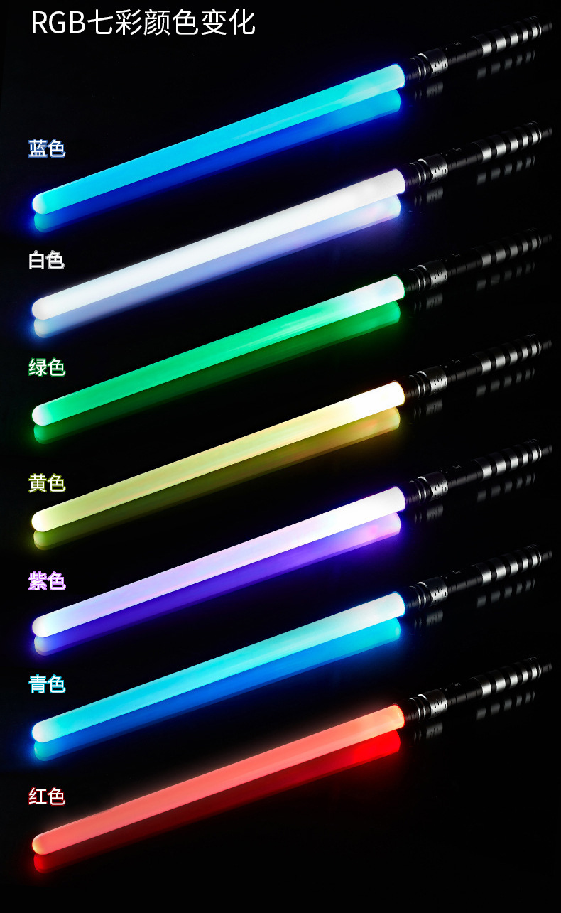 塑料光剑分伸缩和无伸缩,有单色光剑(红灯或蓝灯)、七色光剑,单剑是一盒包含1支光剑,双剑是一盒包含2支光剑配连接器