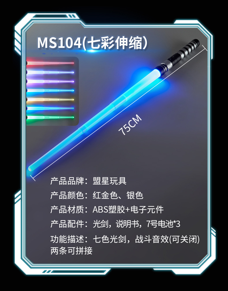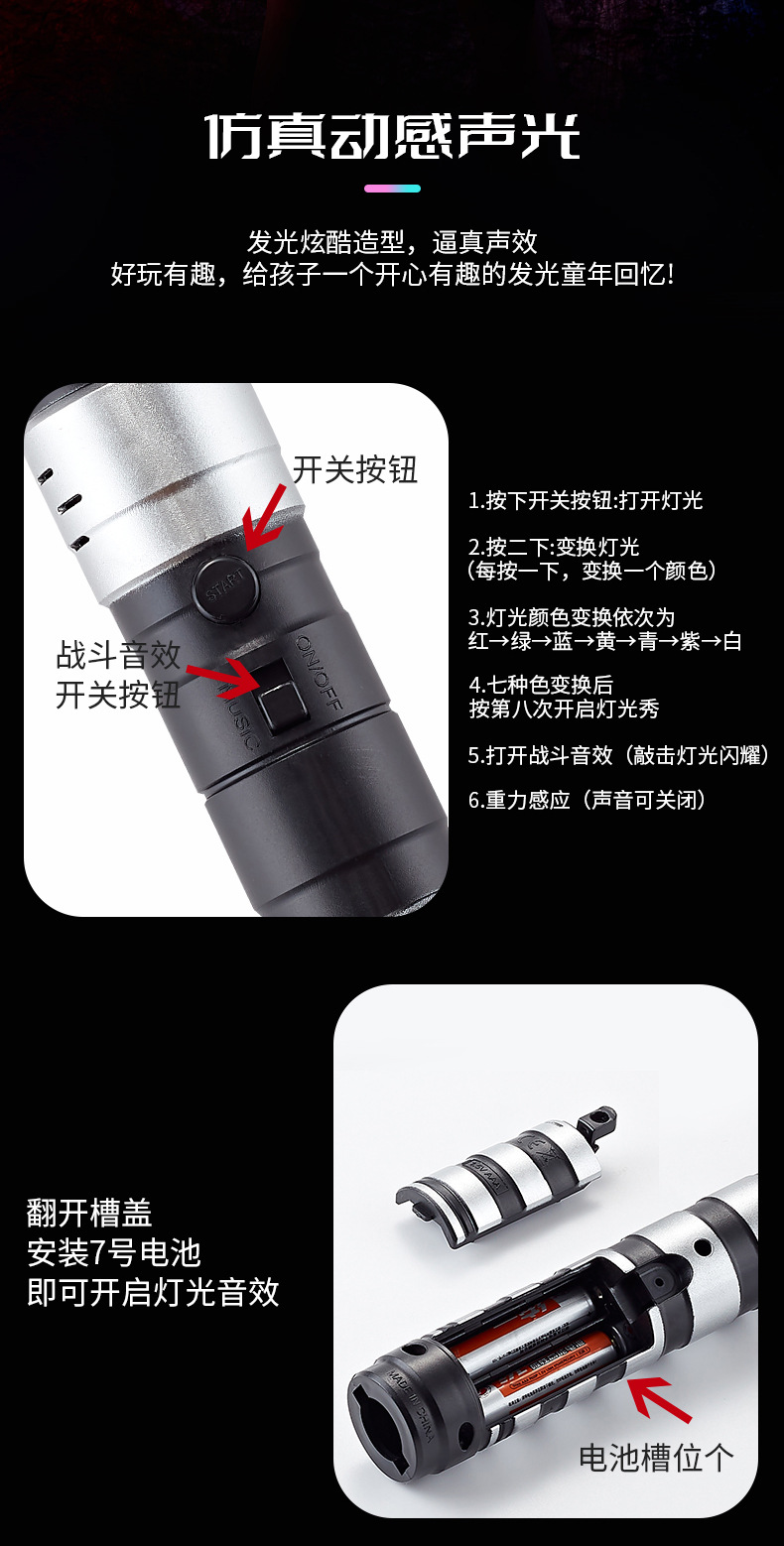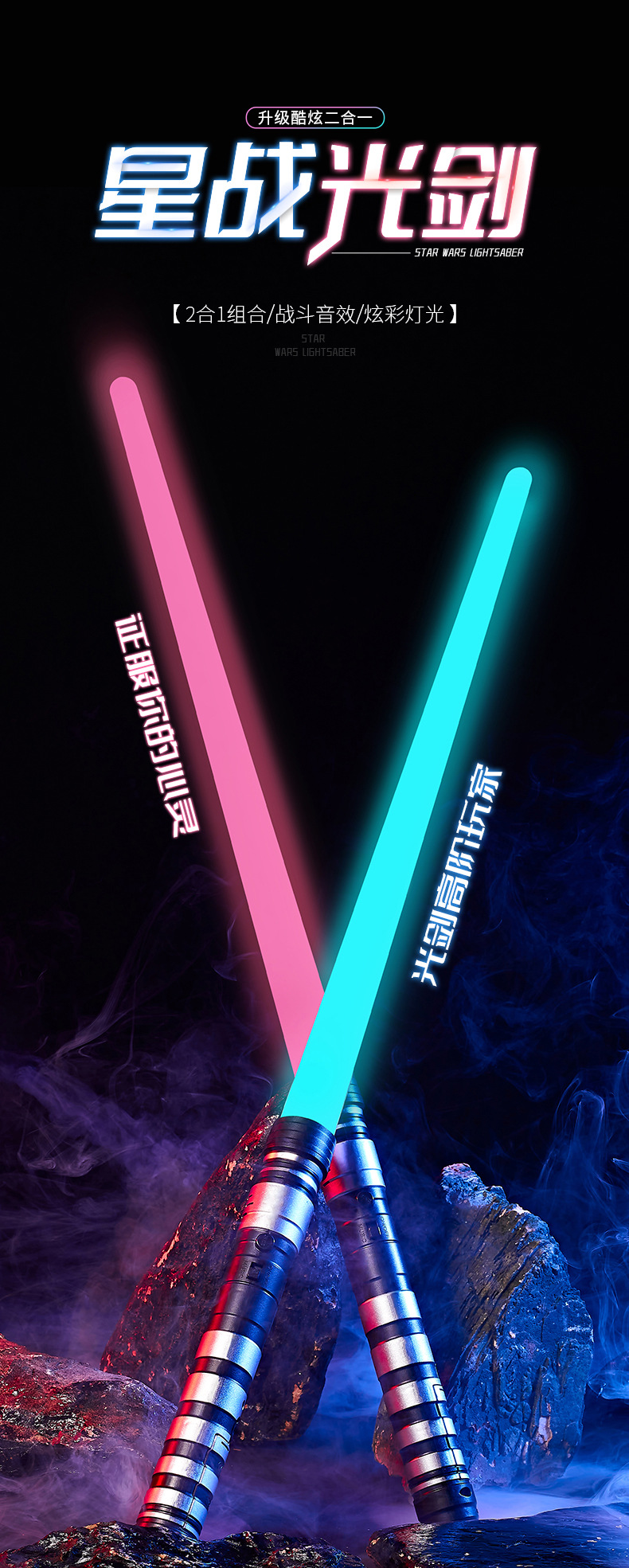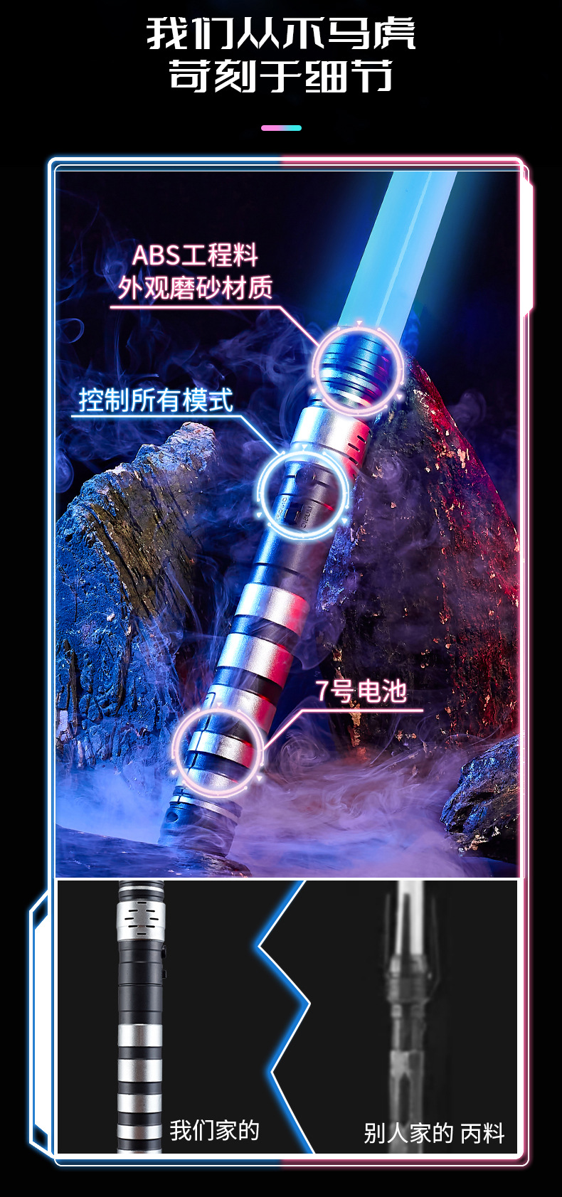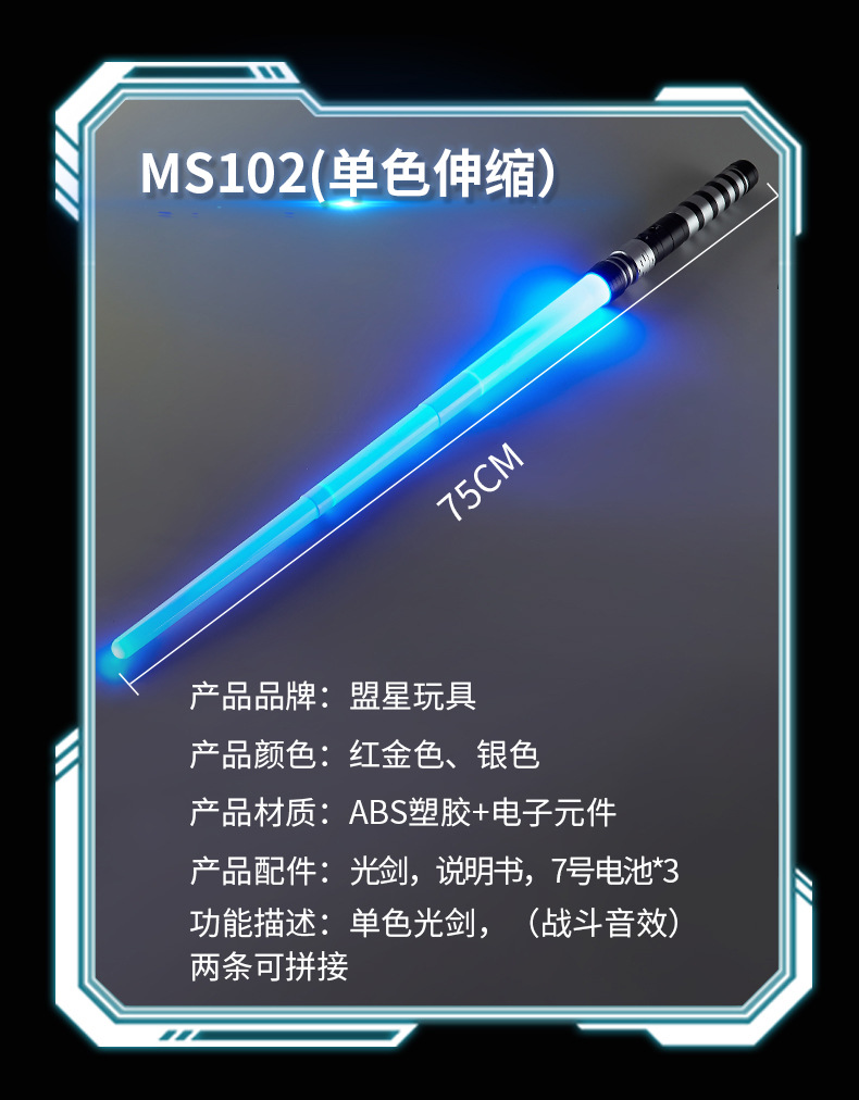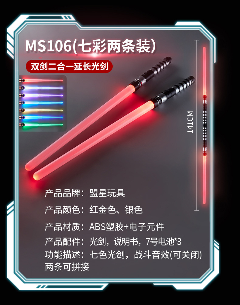 塑料光剑分伸缩和无伸缩,有单色光剑(红灯或蓝灯)、七色光剑,单剑是一盒包含1支光剑,双剑是一盒包含2支光剑配连接器
