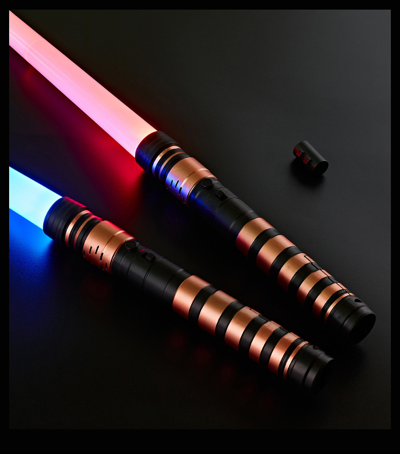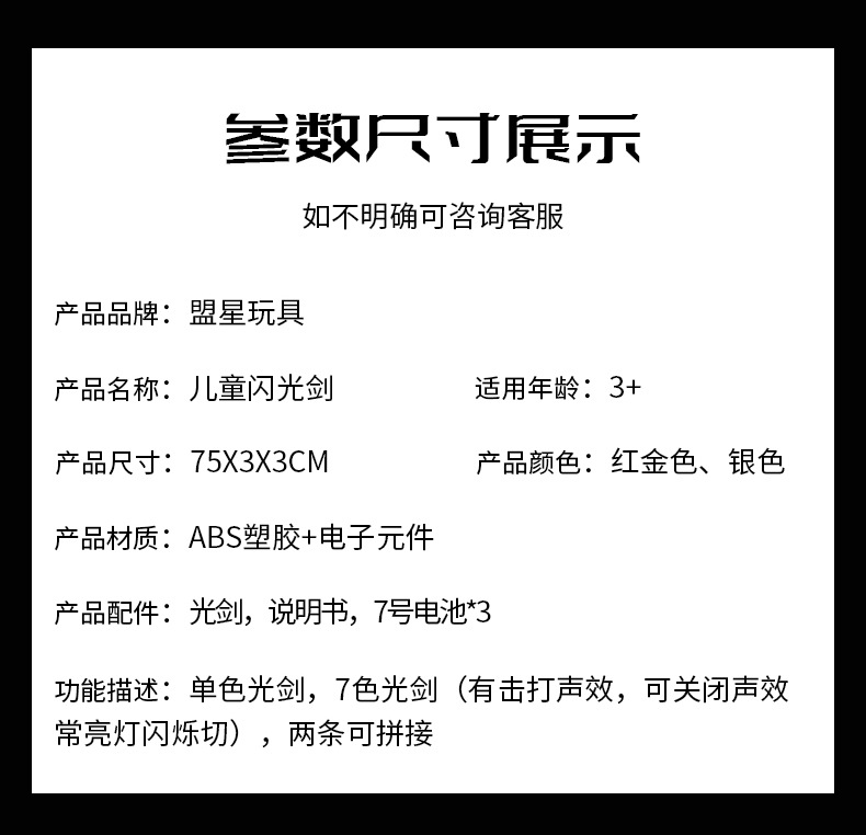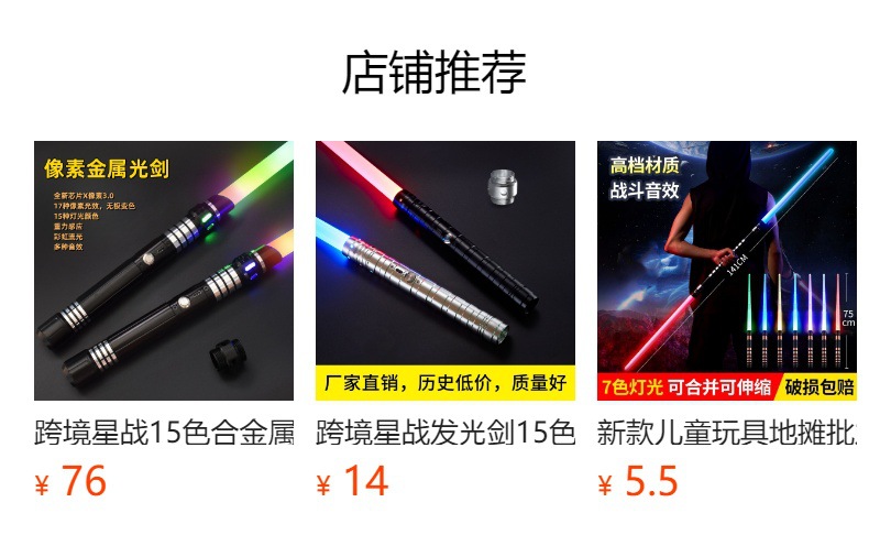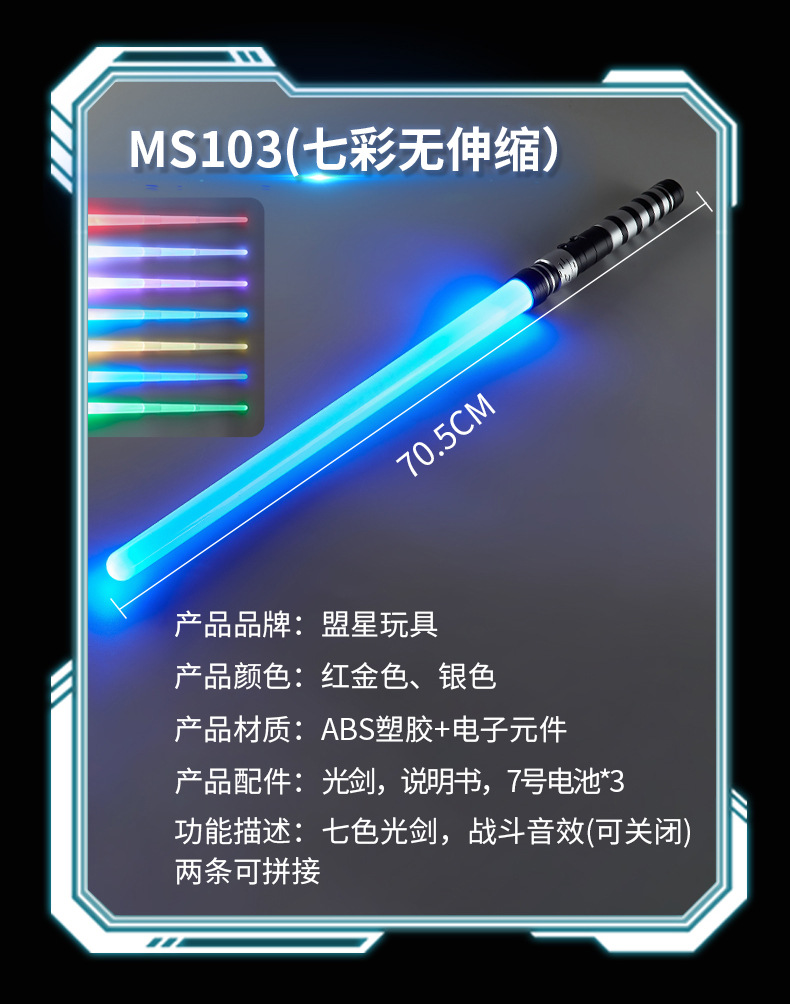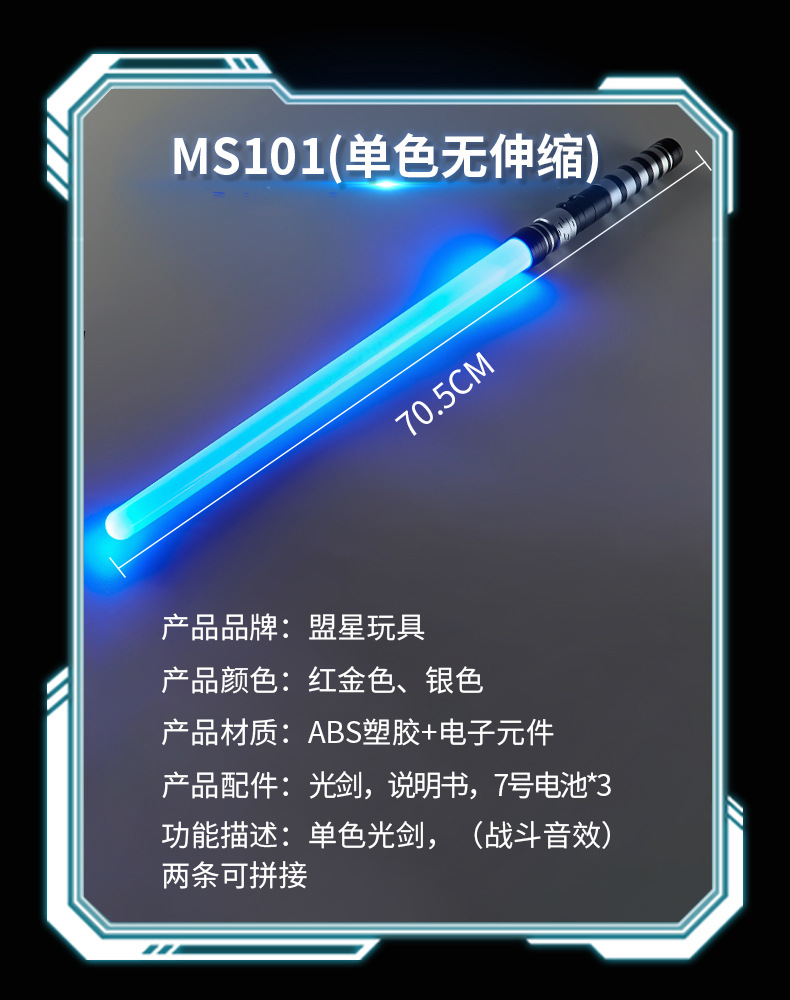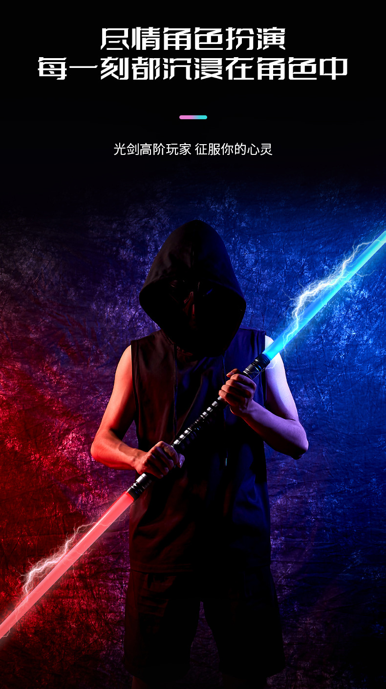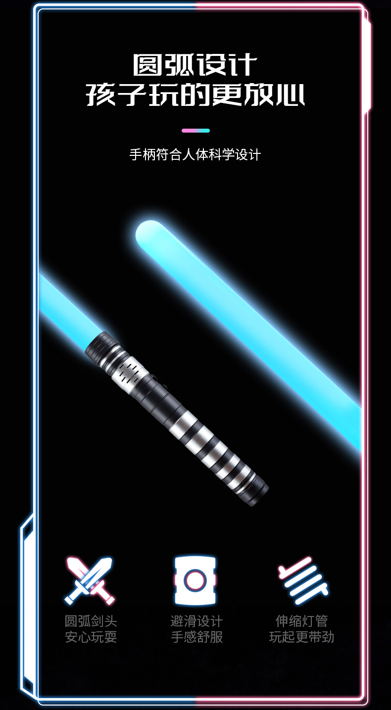 塑料光剑分伸缩和无伸缩,有单色光剑(红灯或蓝灯)、七色光剑,单剑是一盒包含1支光剑,双剑是一盒包含2支光剑配连接器