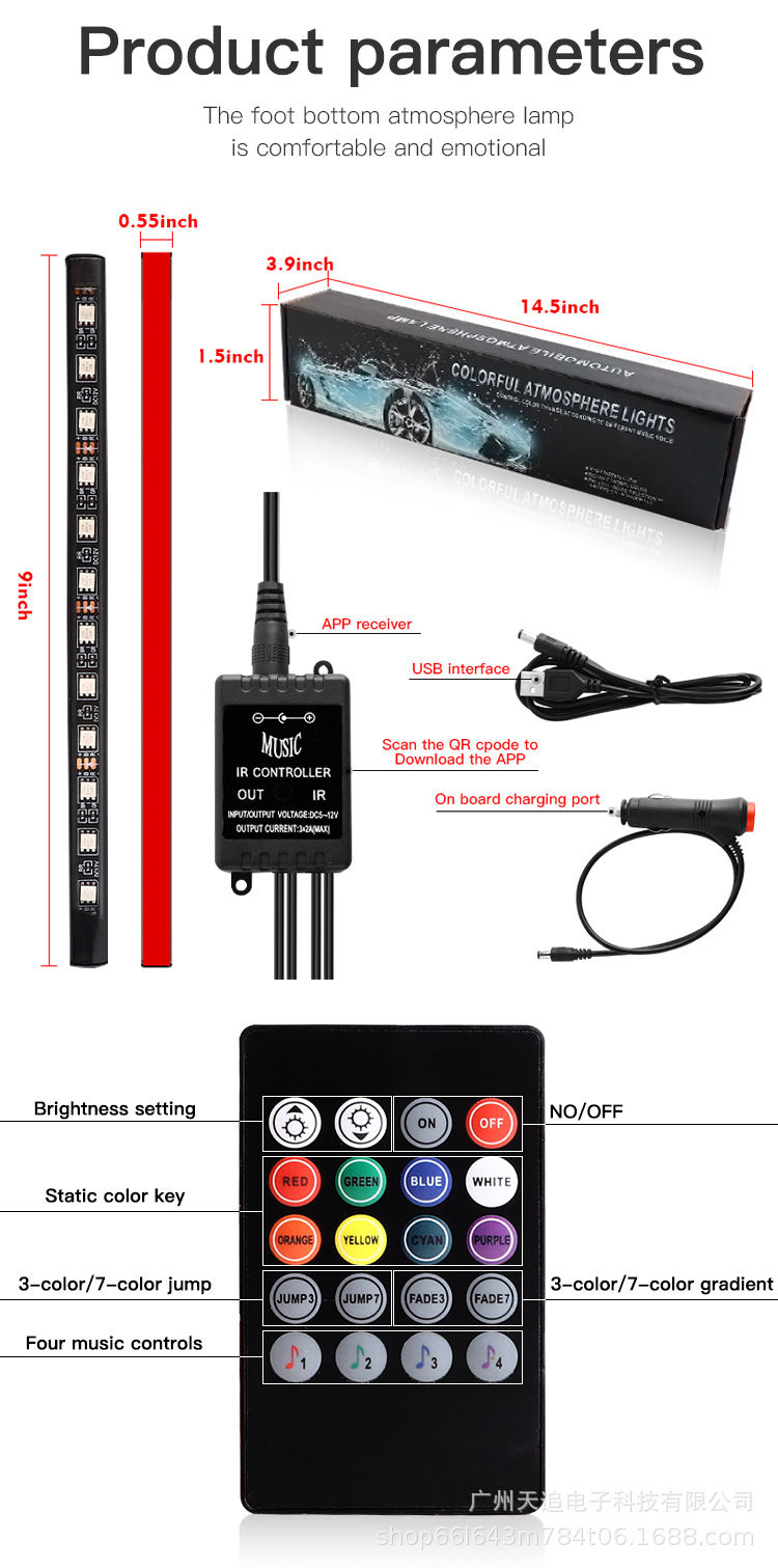 | Especificaciones | Control-5V de voz de 48 luces (USB),48 luces control-12V de voz (encendedor de cigarrillos) |