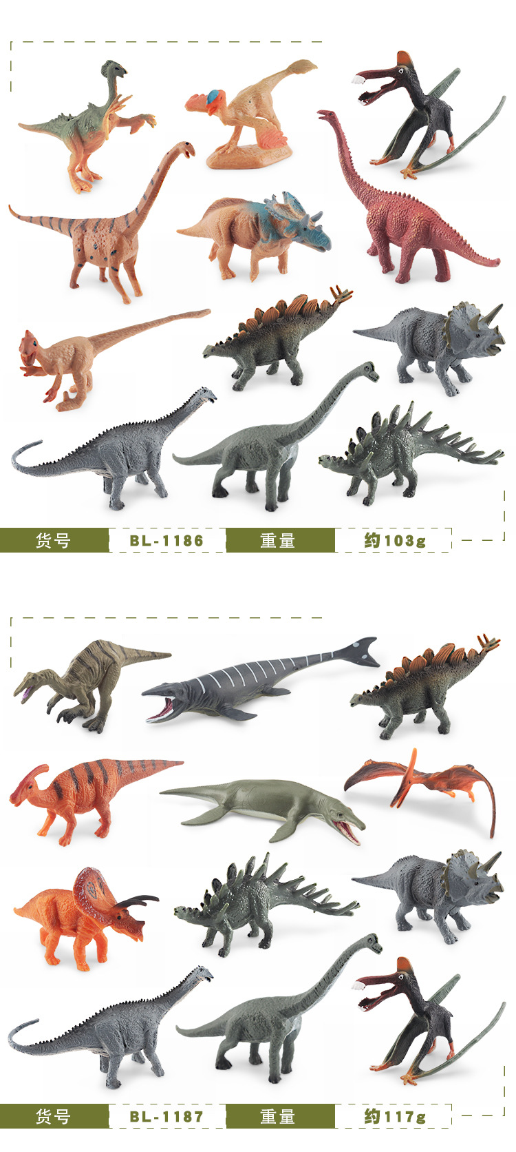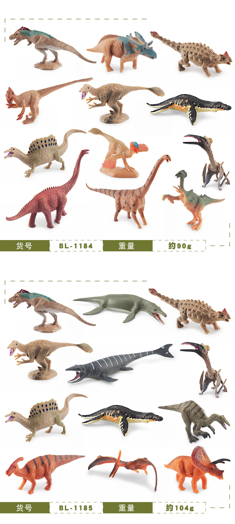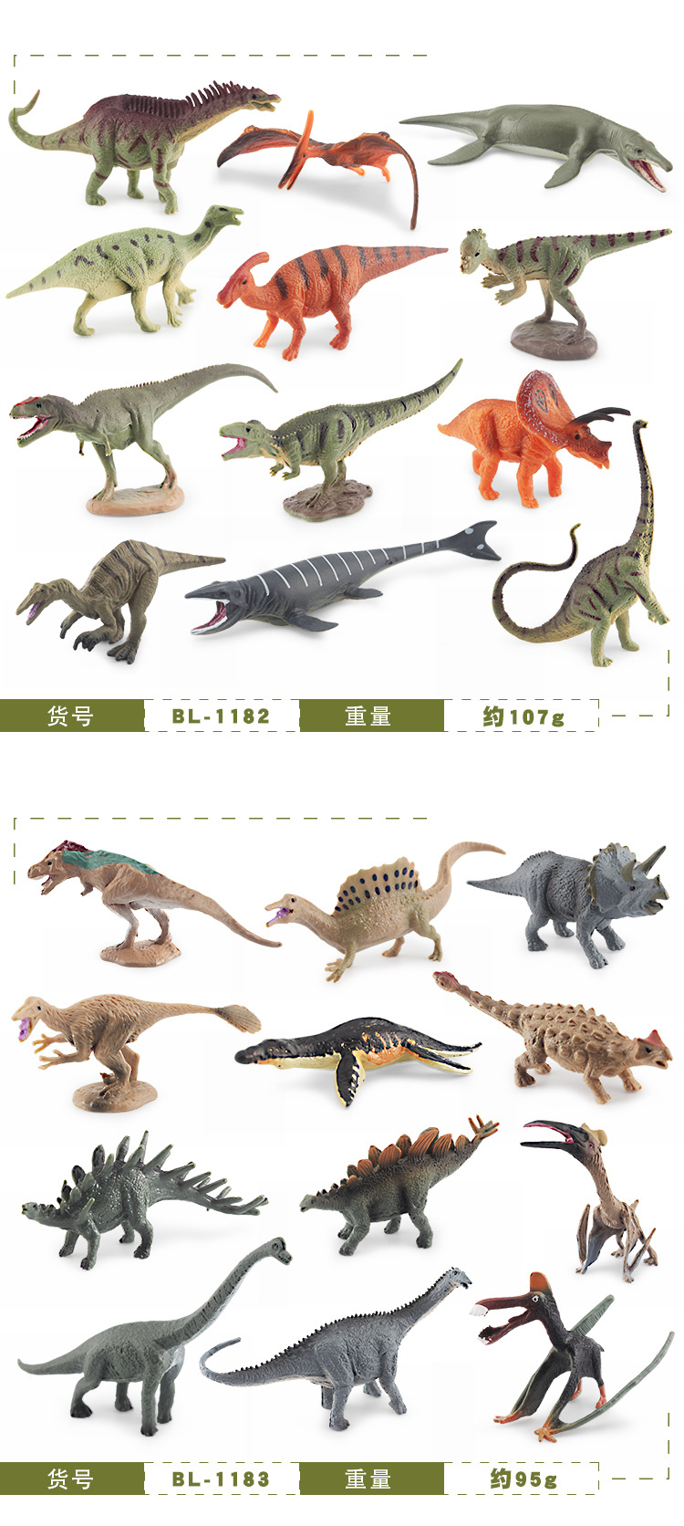 | Colores | BL-1180 98g,BL-1181 93g,BL-1182 107g,BL-1183 95g,BL-1184 90g,BL-1185 104g,BL-1186 103g,BL-1187 117g,BL-1188 85g,BL-1189 112g,Dinosaurio BL-1180B 183g,Dinosaurio BL-1181B 178g,Dinosaurio BL-1182B 180g,Dinosaurio BL-1183B 163g,Dinosaurio BL-1184B 175g,Dinosaurio BL-1185B 189g,Dinosaurio BL-1186B 188g,Dinosaurio BL-1187B 202g,Dinosaurio BL-1188B 170g,Dinosaurio BL-1189B 197g,Ciclo de crecimiento de pterosaurio PL127-2456 1 93.5g,Ciclo de crecimiento de pterosaurio PL127-2457 2 81.1g,PL127-2458 Tyrannosaurus Ciclo de crecimiento 1 152,4g,PL127-2459 Tyrannosaurus Ciclo de crecimiento 2 177,3g,ZQ5072 tiránico dragón 367.5g,ZQ5072B tiránico dragón 367.5g,T15004 tiránico dragón 63g,T15005 Archaeopteryx pequeño 10g,T15006 Little Xun Raptors 50g,ZQDSL33-A gris 222g,ZQDSL33-B negro 210g,ZQDSL34B Dilophosaurus 76.5g,BL-1191 Dilophosaurus (amarillo) 72g,BL-1192 Dilophosaurus (marrón) 72g,ZQDSL34A Velociraptor 76.5g,JZD001 Thunderlong-marrón 400g,JZD002 Brachiosaurus-Amarillo 420g,JZD003 Dragón gigante del sur 370g,JZD004 Rex Tyrannosaurus gris 390g,JZD004 Rex Tyrannosaurus azul 390g,JZD005 Carnotaurus cian,JZD006 Triceratops marrón,JZD006 Triceratops Gris,JZD007 Pardo de dragón adjunto 120g,JZD007 Diputado Dragón Verde 120g,JZD008 Stegosaur-Qing 140g,JZD008 Stegosaurus-Amarillo 140g,JZD009 Euphorbia-Azul 200g,JZD009 Euphorbia-Verde 200g,JZD010 Ladrón Dragón 70g,JZD012 Doble Corona Dragón 80g,JZD013 pájaro ancestral 180g,JZD014 Yu Wang Long 240g,JZD015 dragón de huevo-azul 170g,JZD015 dragón de huevo-polvo 170g,JZD016 Emperador Dragón Negro 580g,JZD016 Emperador Dragón Naranja 580g,JZD017 Ataque al dragón de la hoz,JZD018 Grey Foz Dragón,JZD018 dragón de pie,JZD019 Spinosaurus,JZD020 tiranosaurio verde caminando,JZD020 Tyrannosaurus morado caminando,JZD025 Velociraptor-Gris 100g,JZD025 Velociraptor-Verde 100g,JZD026 Posición en cuclillas Dragón Sur-Naranja 430g,JZD028 tiranosaurio en cuclillas amarillo,JZD029 dragón espino de apoyo 330g,JZD030 Sea King Canglong 287g,JZD051 Pequeño dragón gigante del sur 100g,JZD058 toro de pie 190g,JZD102 Brachiosaurus de África Oriental 549g,JZD103 Bolivia Ankylosaurus 441g,ZQZD104 Stegosaurus 140.7g,Tres huevos de dinosaurio 67,8g,BL-1010 huesos de dinosaurio A 107.2g,BL-1011 huesos de dinosaurio B 105.4g,BL-1012 cráneo de mamífero prehistórico A 111.4g,BL-1013 cráneo de mamífero prehistórico B 112g,12 huesos de dinosaurio 102g,BL-1022 12 modelos de esqueleto de dinosaurio 93g,BL-1139 12 esqueletos de dinosaurios luminosos 84g,BL-10041 espinoso rojo 300g,BL-10044 tiranosaurio marrón 320g,BL-10045 tiranosaurio verde 320g |