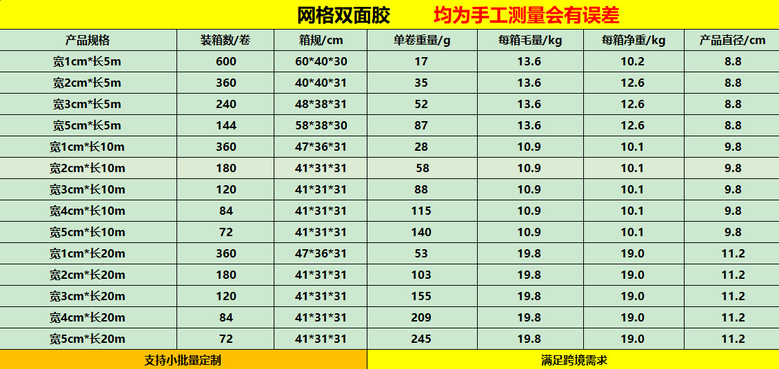 | Modelo de especificación | 2cm de ancho * 10m de largo (180 rollos en una caja); pegamento de doble cara de malla de tela,2cm de ancho * 10m de largo (180 rollos en una caja); embalaje de la tarjeta de color inglés,3cm de ancho * 10m de largo (120 rollos en una caja); pegamento de doble cara de malla de tela,3cm de ancho * 10m de largo (120 rollos en una caja); embalaje de la tarjeta de color inglés,Ancho 4cm * largo 10m(84 rollos en una caja); pegamento de doble cara de malla de tela,5cm de ancho * 10m de largo (72 rollos en una caja); pegamento de doble cara de malla de tela,Ancho 5cm * largo 10m(72 rollos en una caja); embalaje de la tarjeta de color Inglés,1cm de ancho * 10m de largo (360 rollos en una caja); pegamento de doble cara de malla de tela,1cm de ancho * 20m de largo (360 rollos en una caja); pegamento de doble cara de malla de tela,2cm de ancho * 20m de largo (180 rollos en una caja); pegamento de doble cara de malla de tela,3cm de ancho * 20m de largo (120 rollos en una caja); pegamento de doble cara de malla de tela,4cm de ancho * 20m de largo (84 rollos en una caja); pegamento de doble cara de malla de tela,5cm de ancho * 20m de largo (72 rollos en una caja); pegamento de doble cara de malla de tela,1cm de ancho * 5m de largo (600 rollos en una caja); pegamento de doble cara de malla de tela,2cm de ancho * 5m de largo (360 rollos en una caja); pegamento de doble cara de malla de tela,3cm de ancho * 5m de largo (240 rollos en una caja); pegamento de doble cara de malla de tela,5cm de ancho * 5m de largo (144 rollos en una caja); pegamento de doble cara de malla de tela |