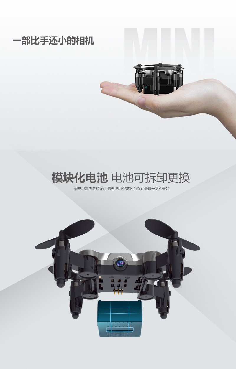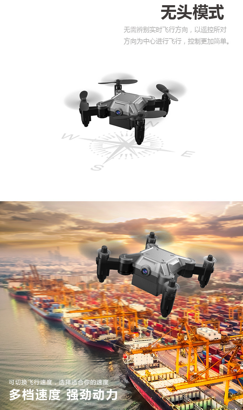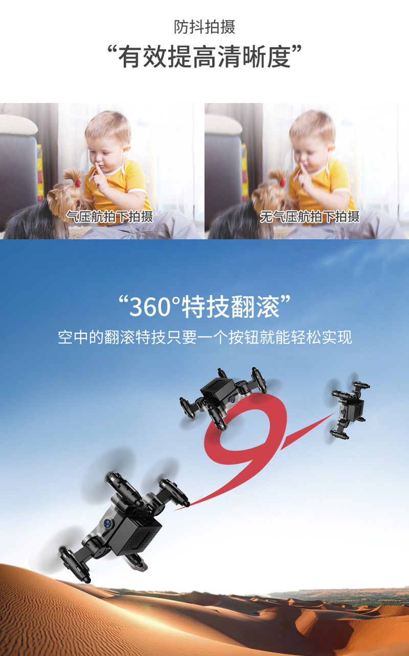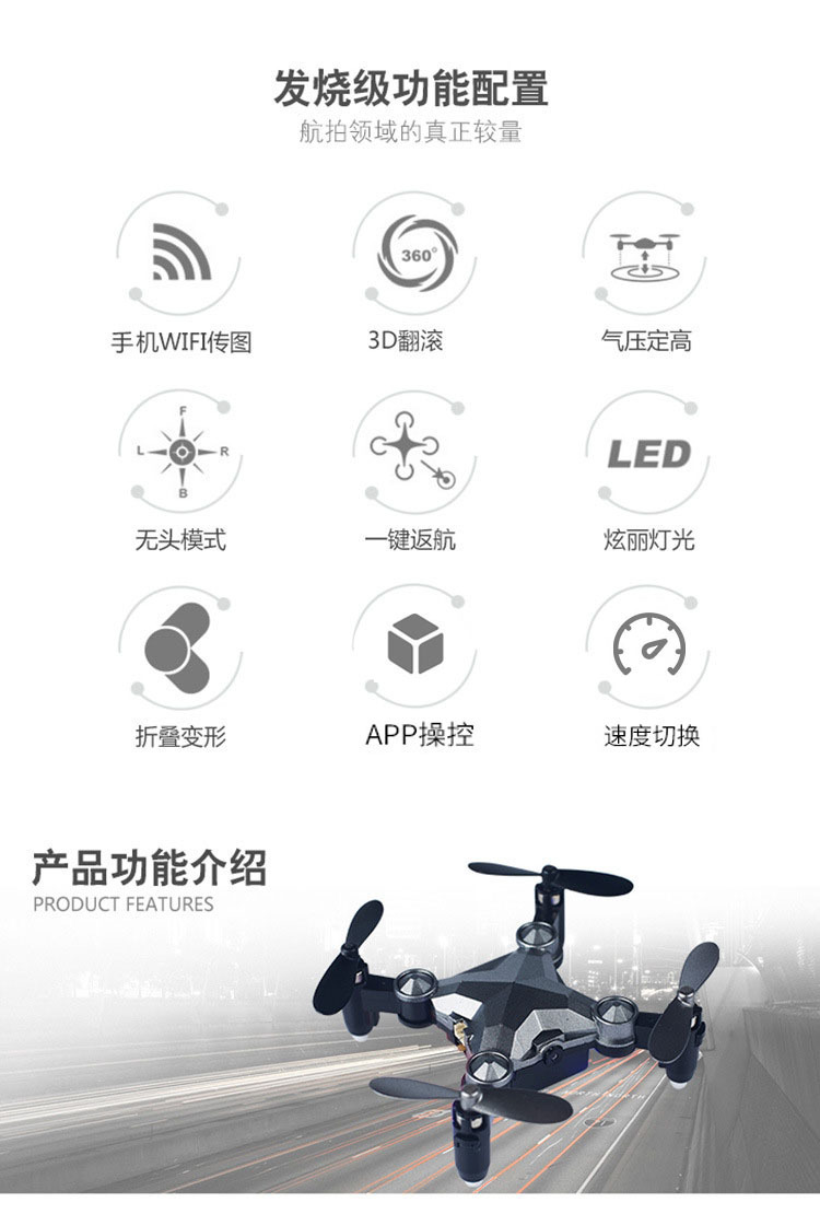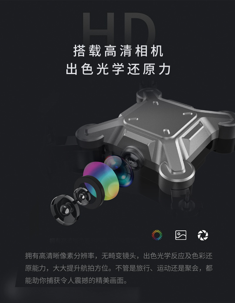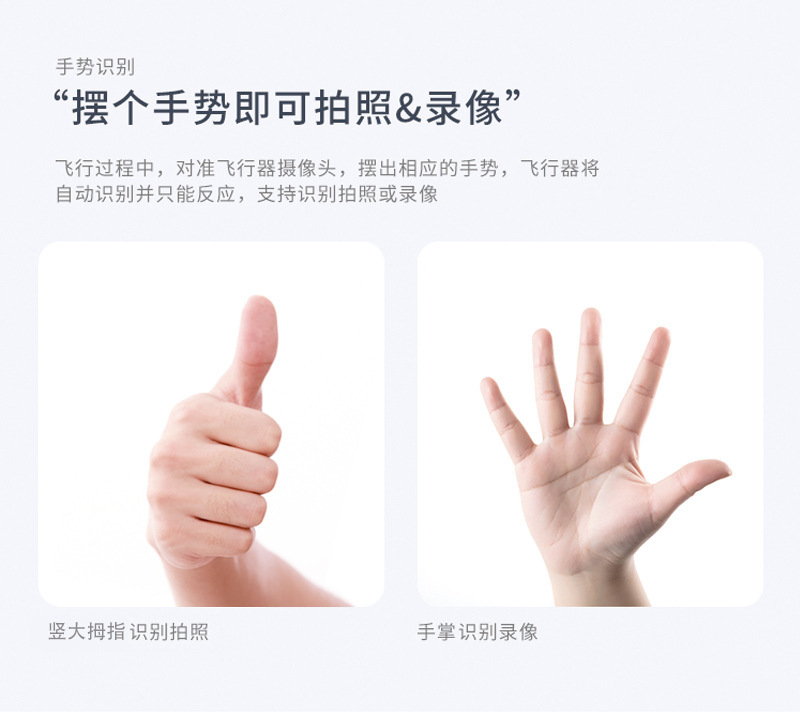 航拍配置:WIFI实时传输:高清30万(480P ),高清200万(720P)摄像头。手势拍照、录像