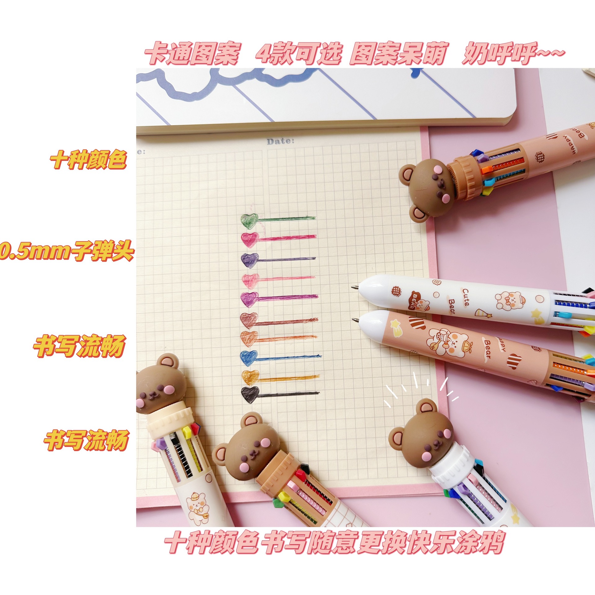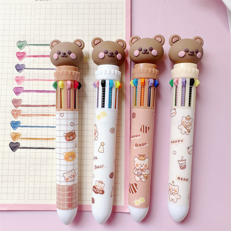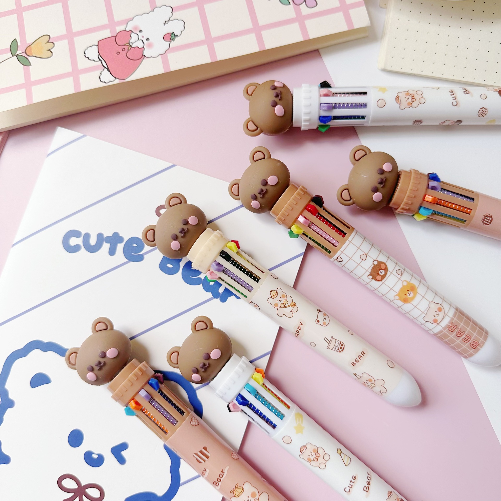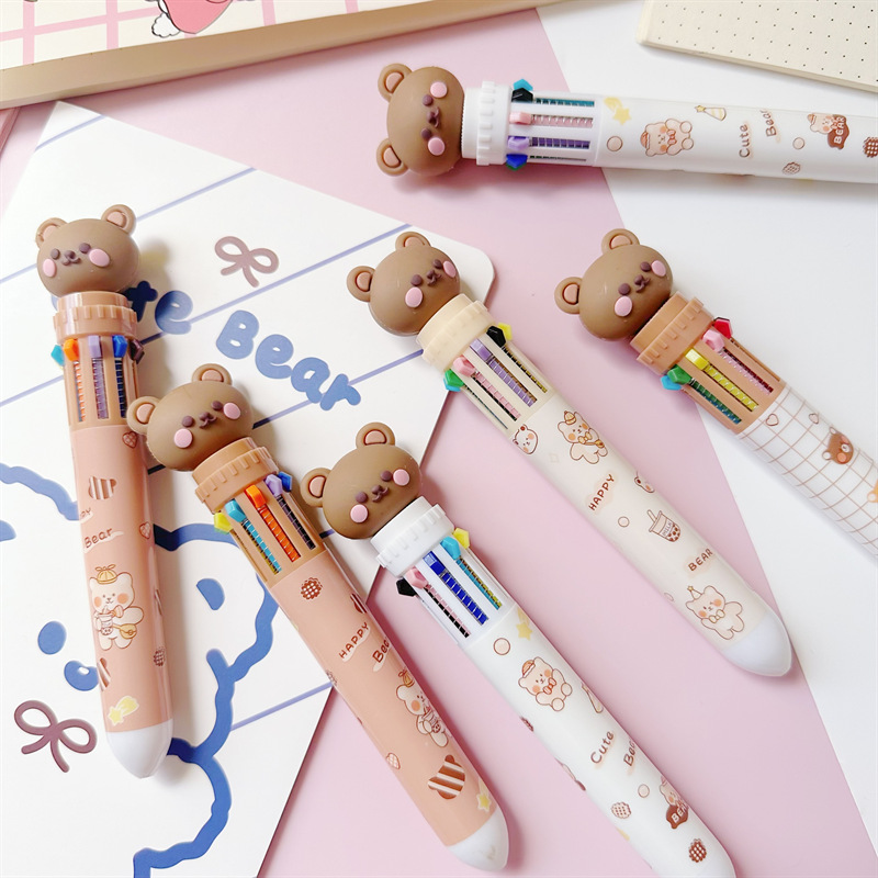 Dibujos animados lindo oso multicolor pluma diez en uno prensa multicolor bolígrafo estudiante diario pluma de gel