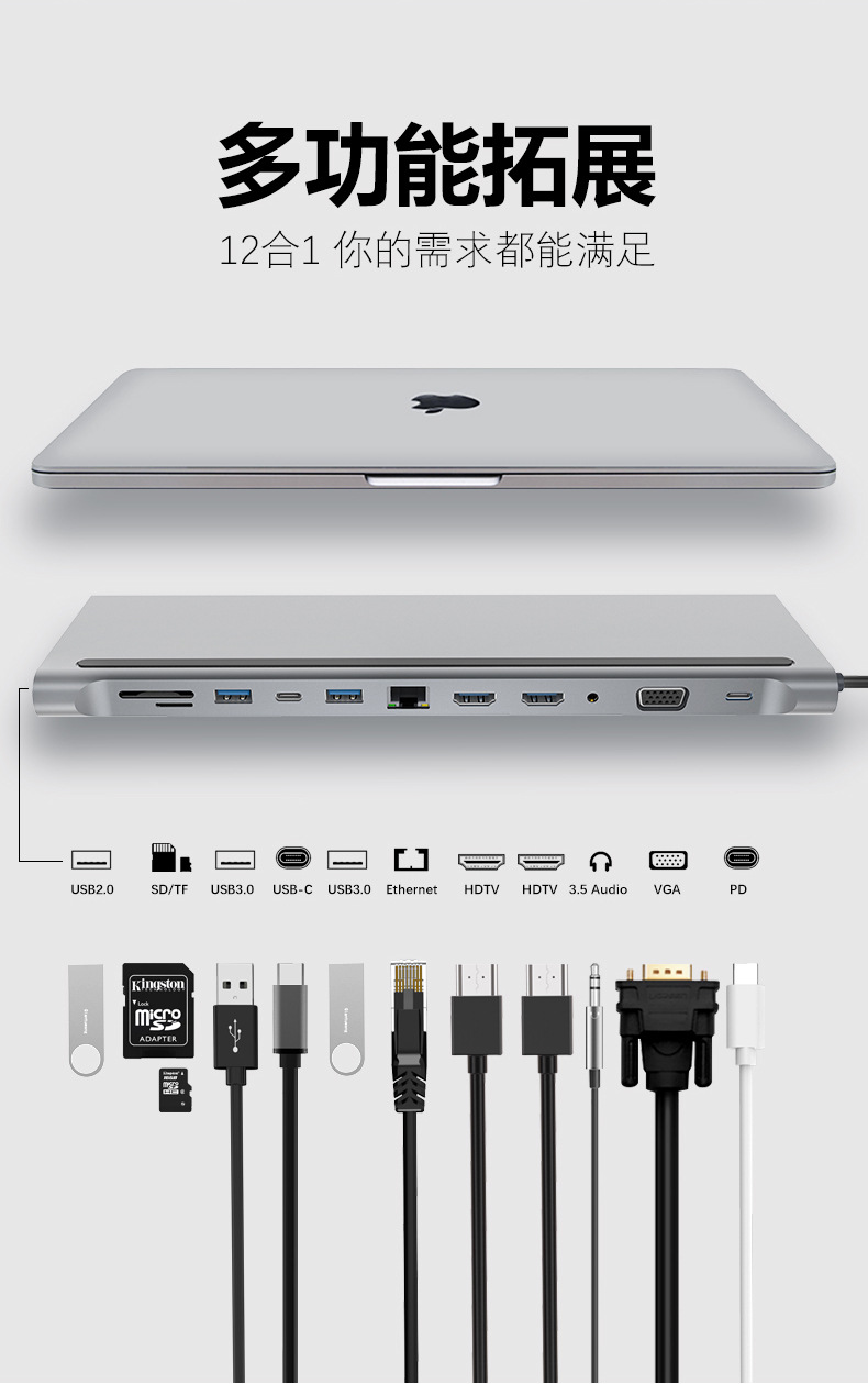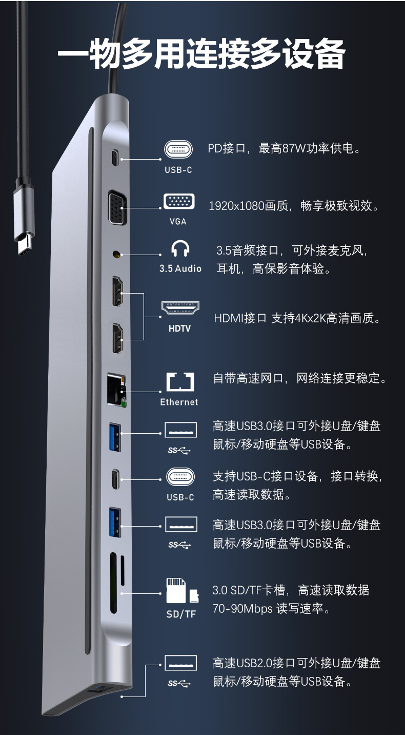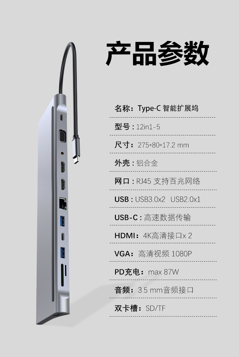 | Número de interfaces | 12 en 1-5 [HDMI1.4*2 VGA USB * 3 USB C SD/TF PD interfaz de audio 100 M] |